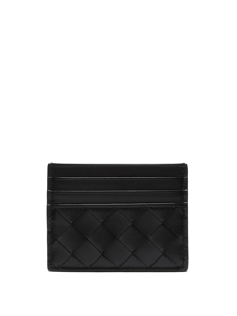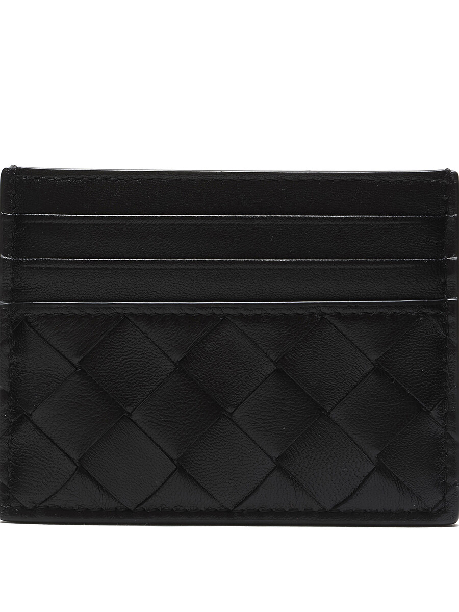 Porte-cartes en cuir tressé Intrecciato emblématique de Bottega Veneta en noir. Design compact et élégant. Livré avec un dust bag.