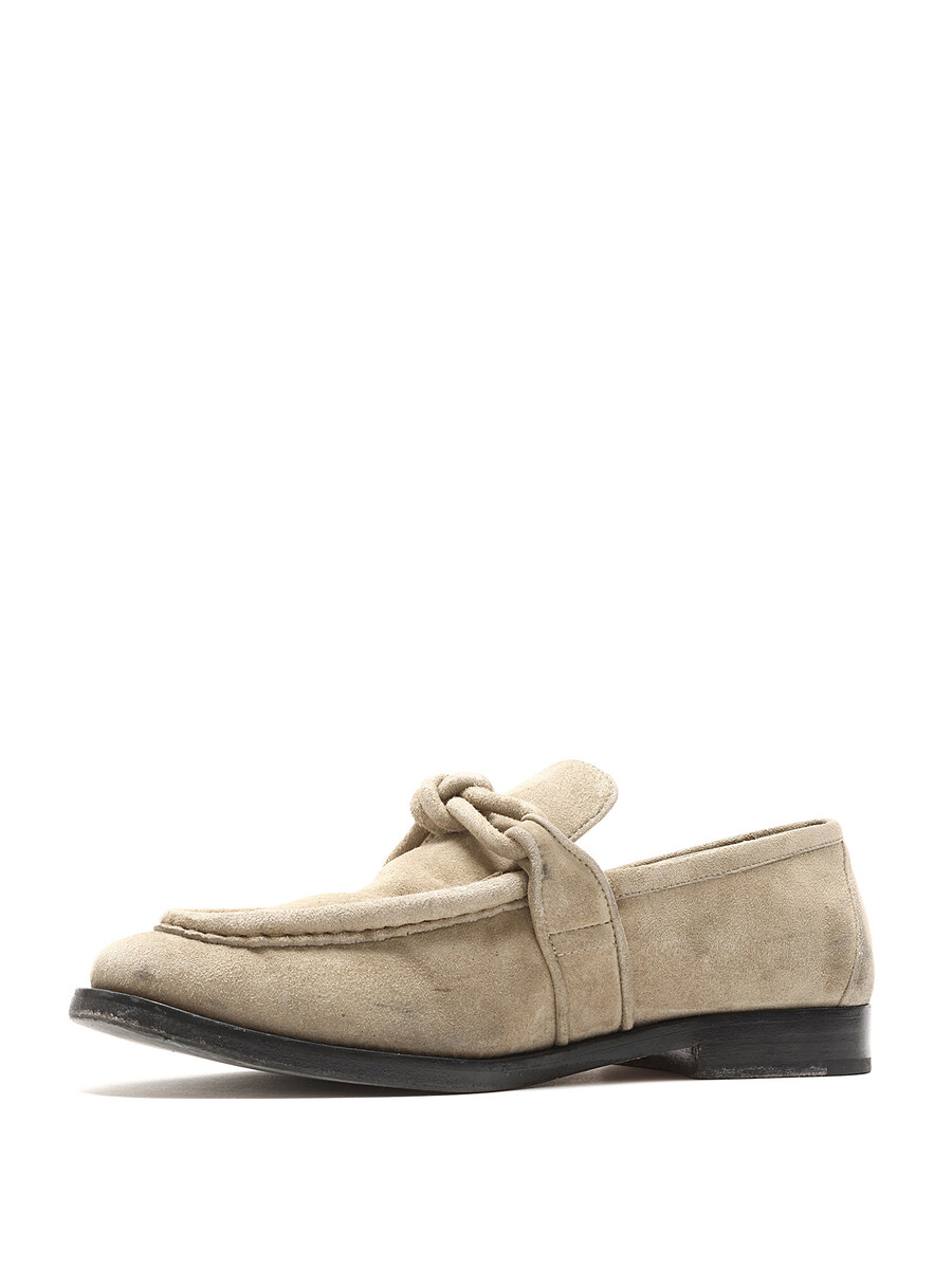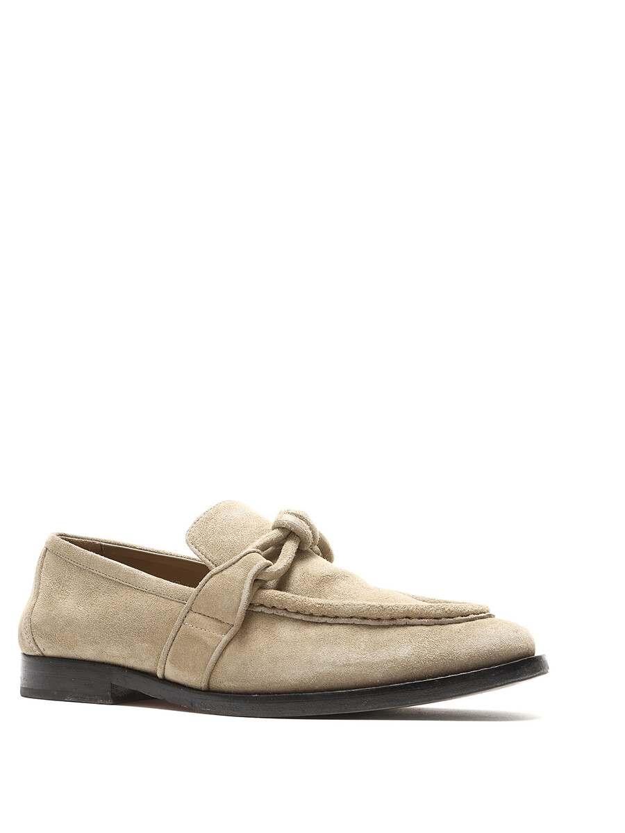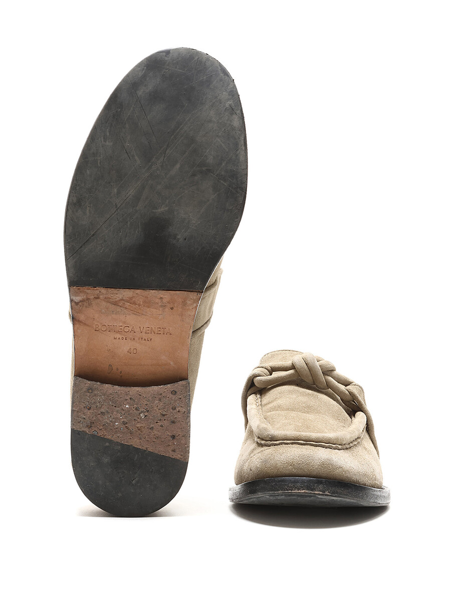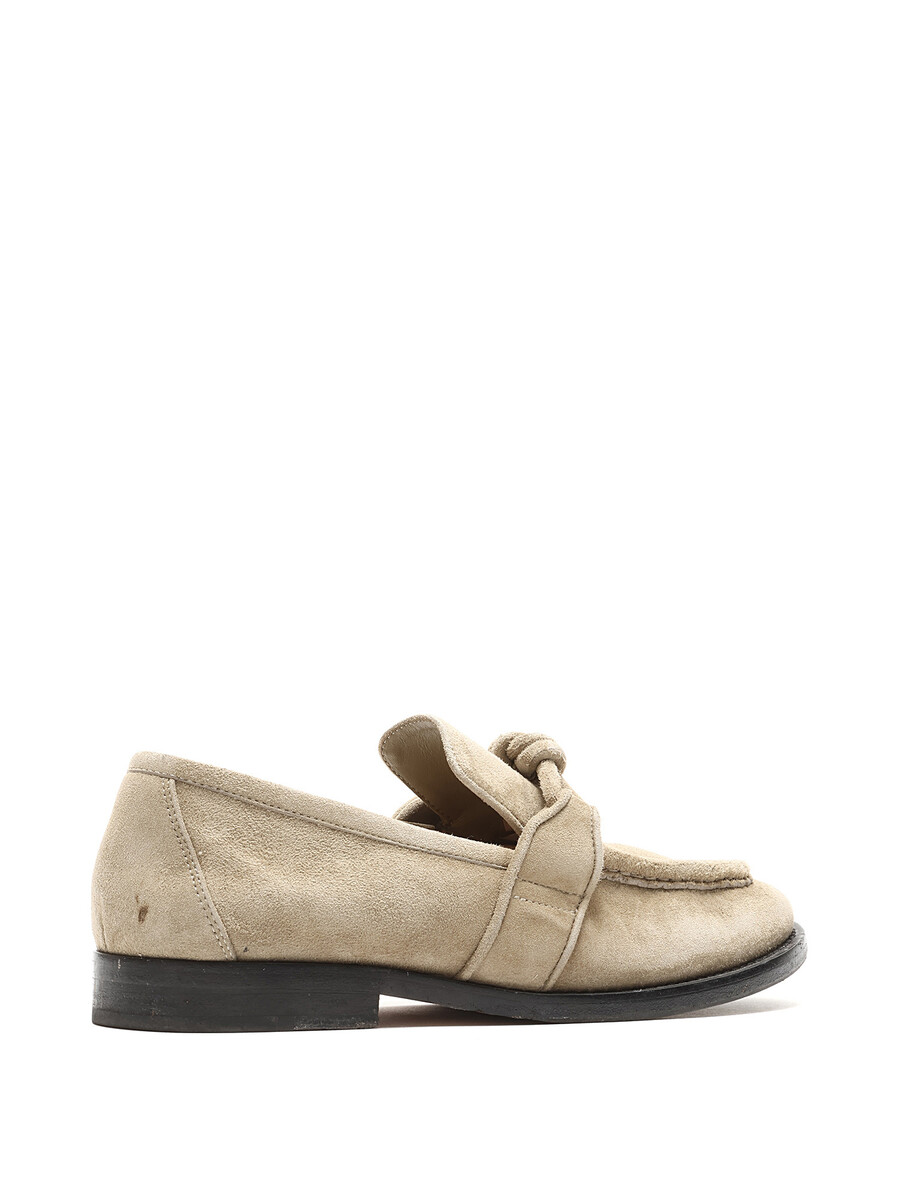 Mocassins en suède khaki avec détail de nœud. Bout rond. Semelle en cuir. Avec dust bag.