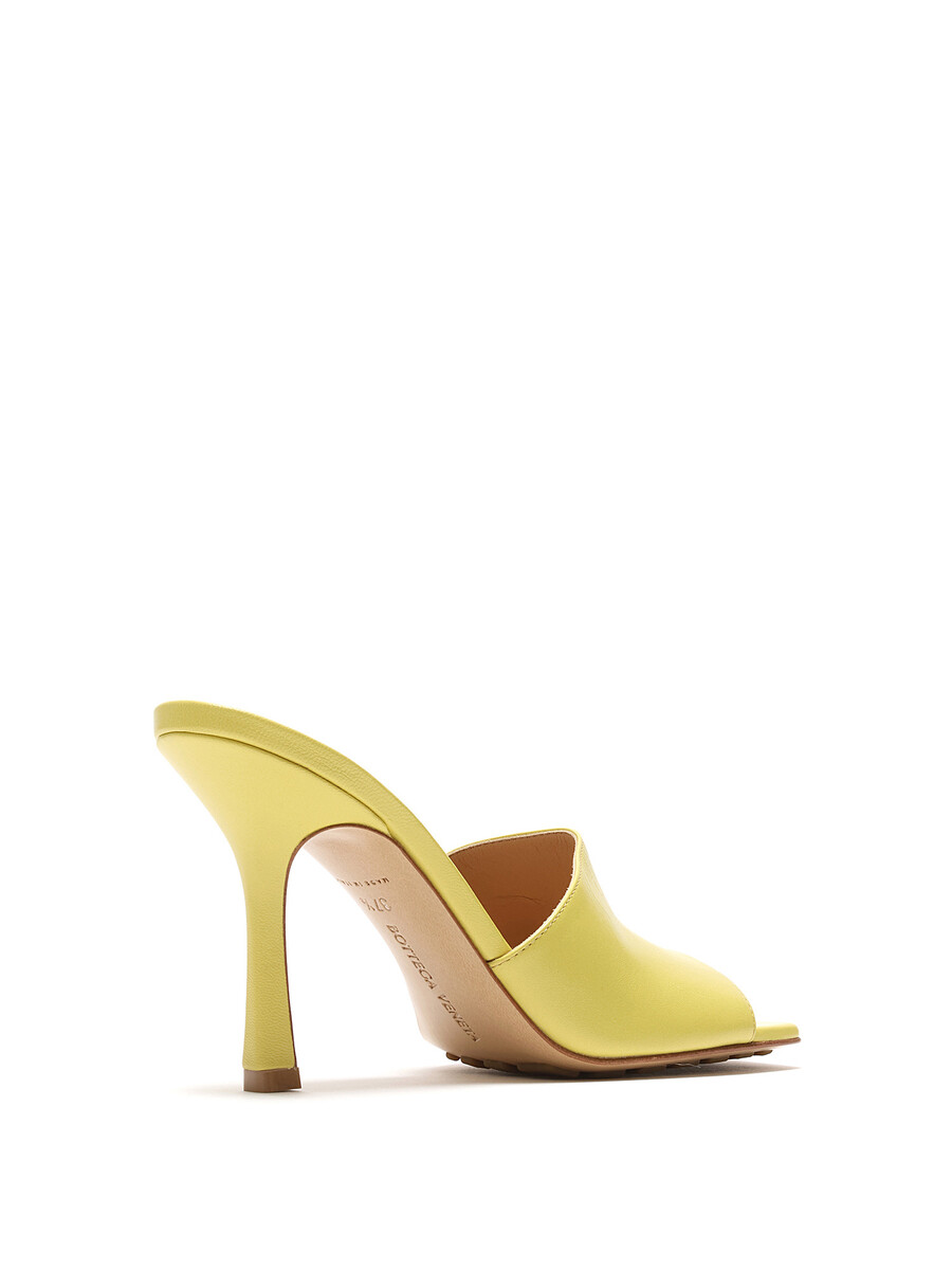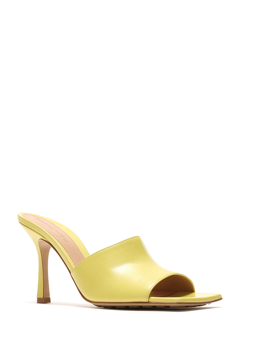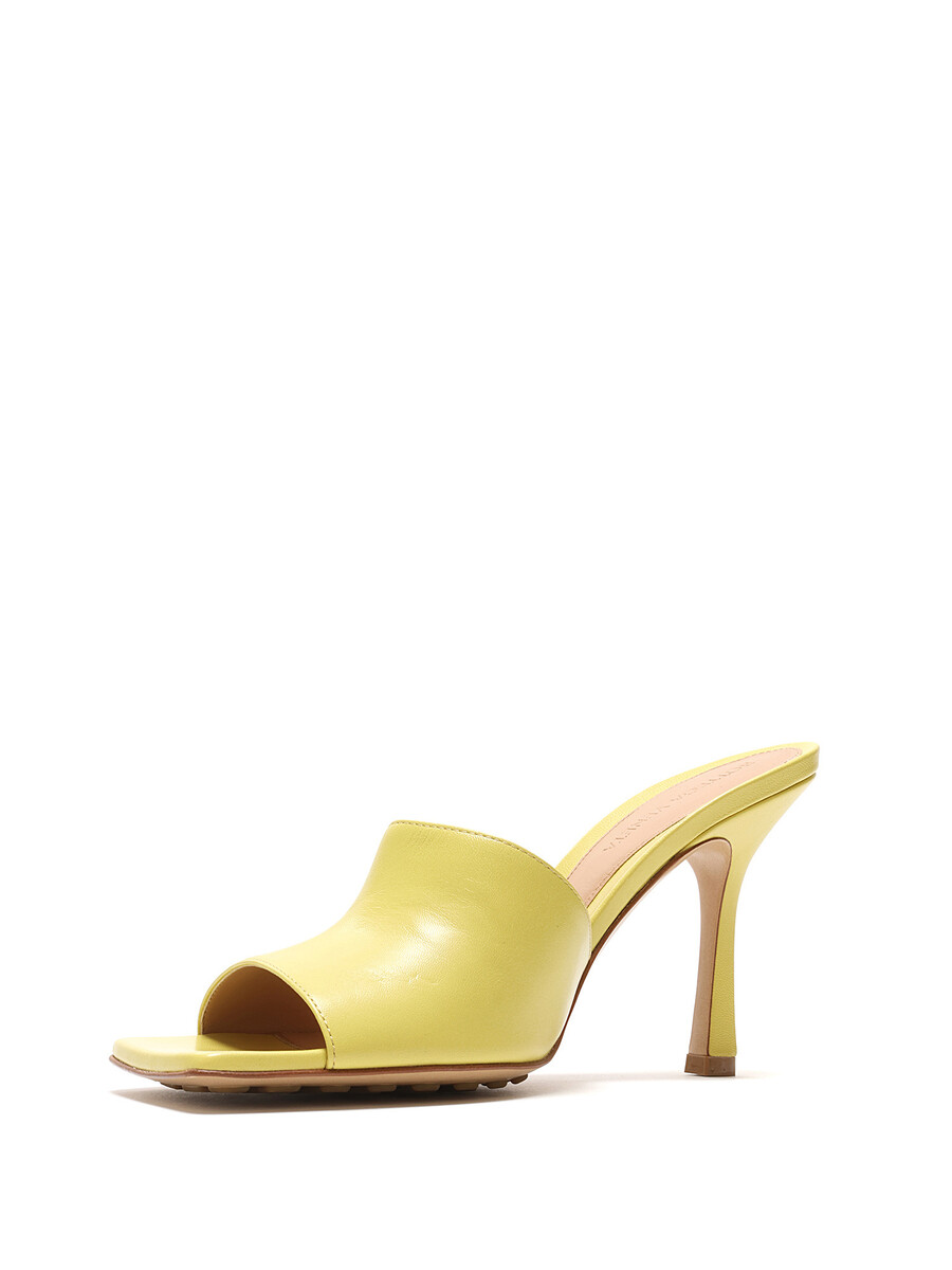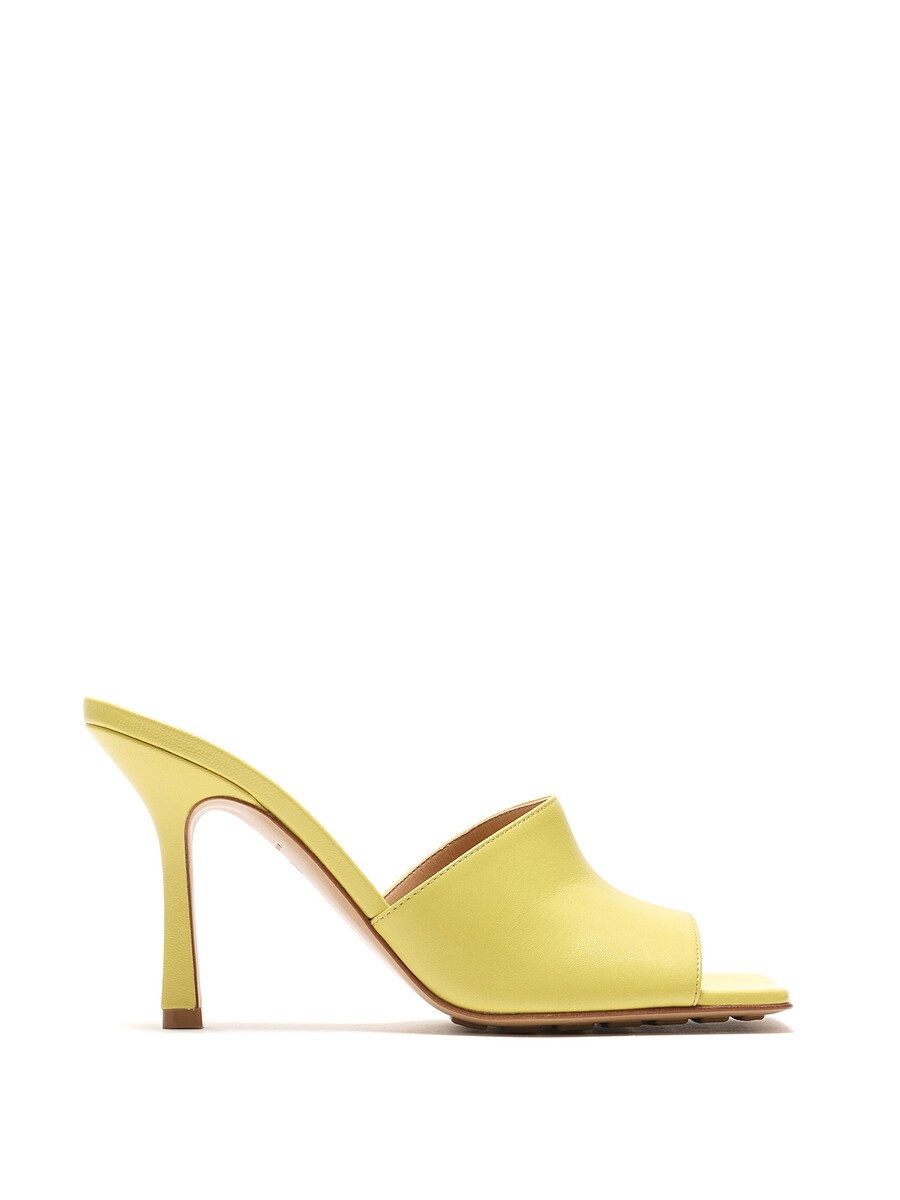 Mules à talon en cuir jaune vif à bout ouvert carré. Style à enfiler. Avec boîte.
