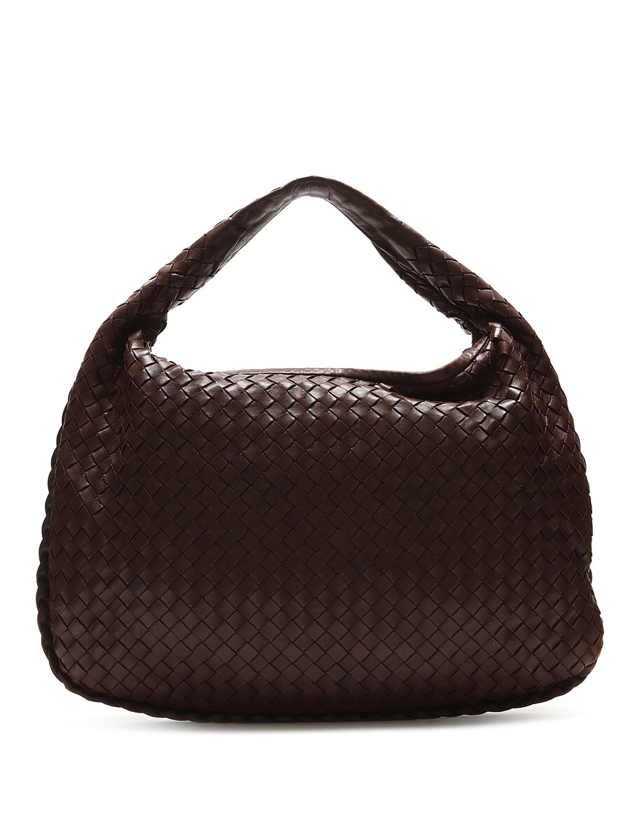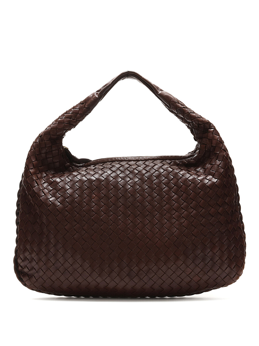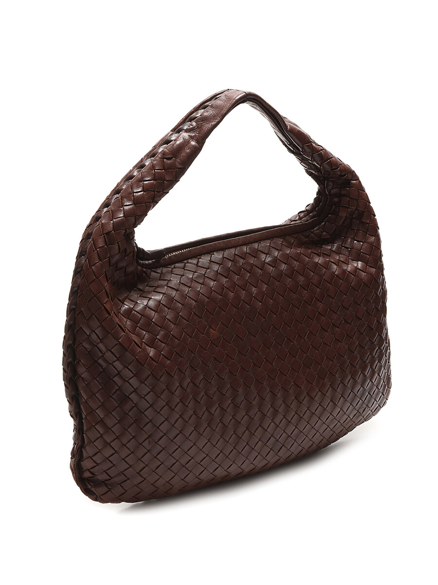 Sac hobo en cuir Intrecciato dans les tons de brun. Poignée en cuir tressé signature et fermeture à glissière. Quincaillerie dorée. Livré avec un sac de protection.