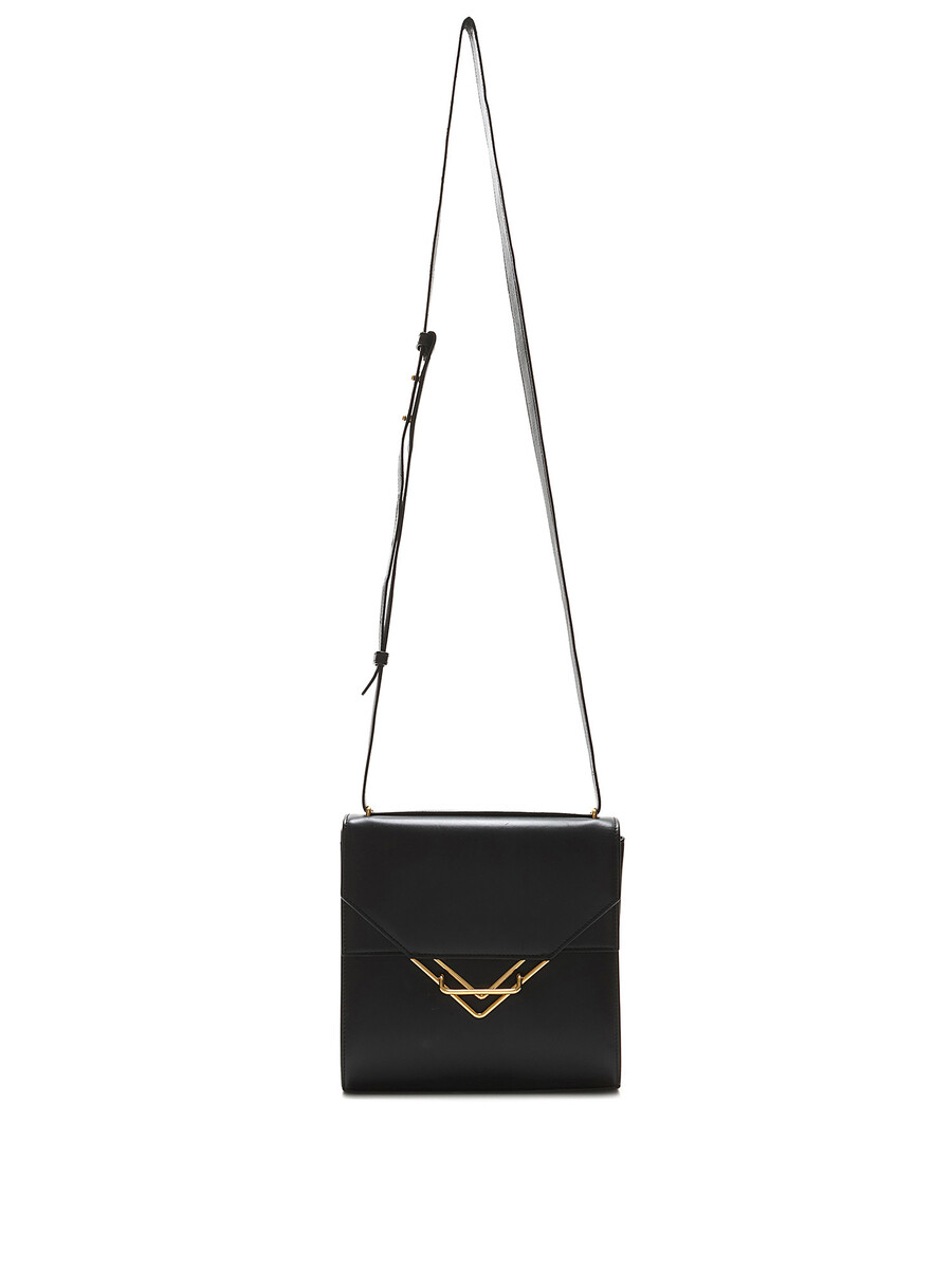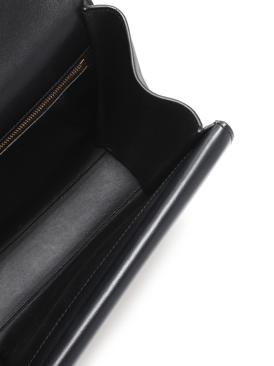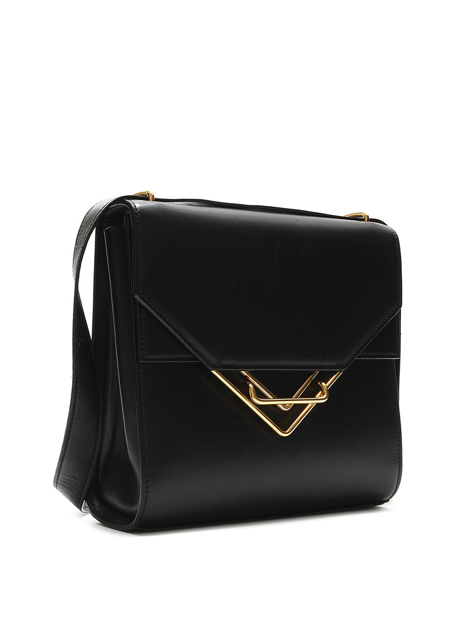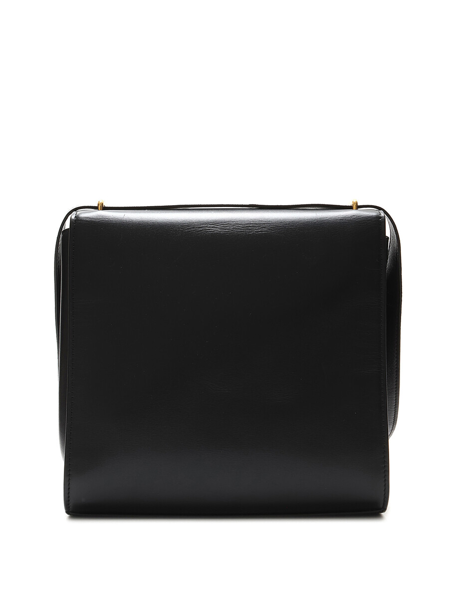 Sac à bandoulière en cuir grainé rectangulaire noir. Fermeture à fermoir triangulaire en métal. Bandoulière réglable en cuir. Ferrures dorées.