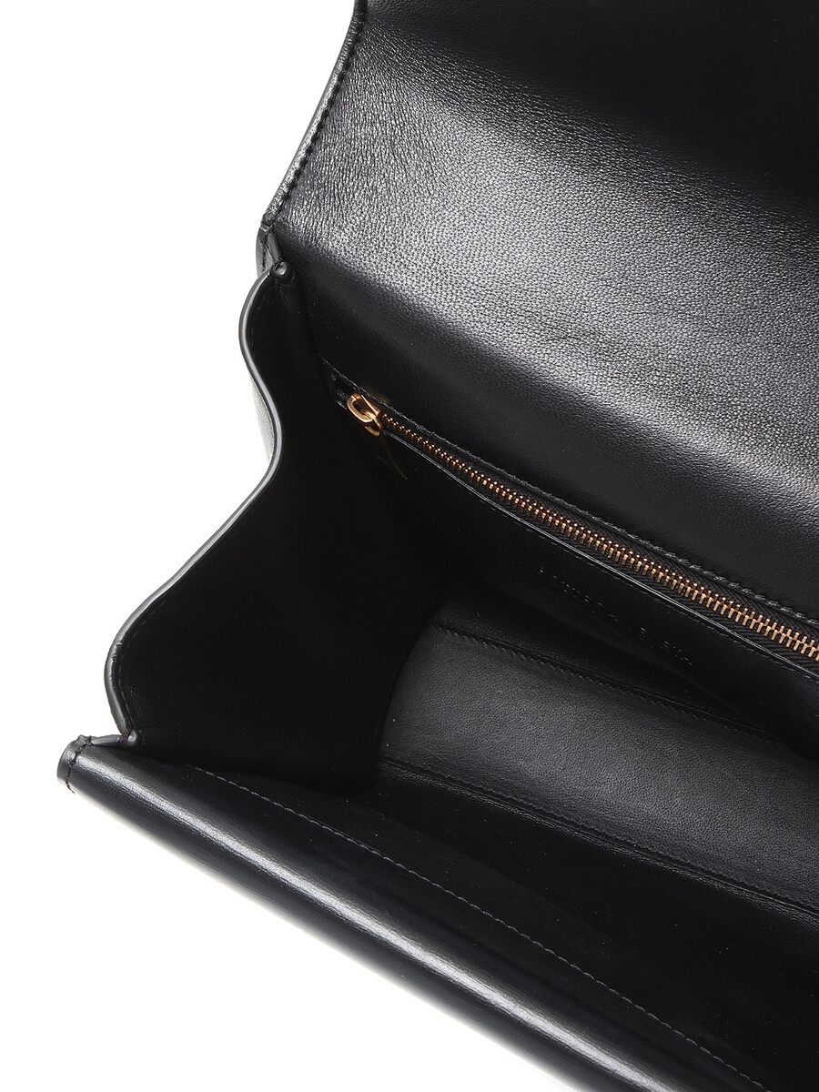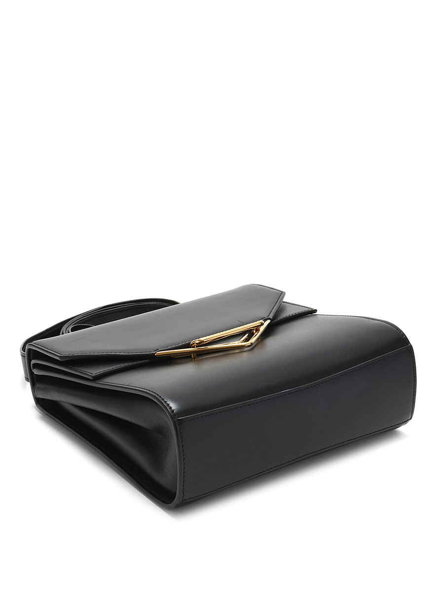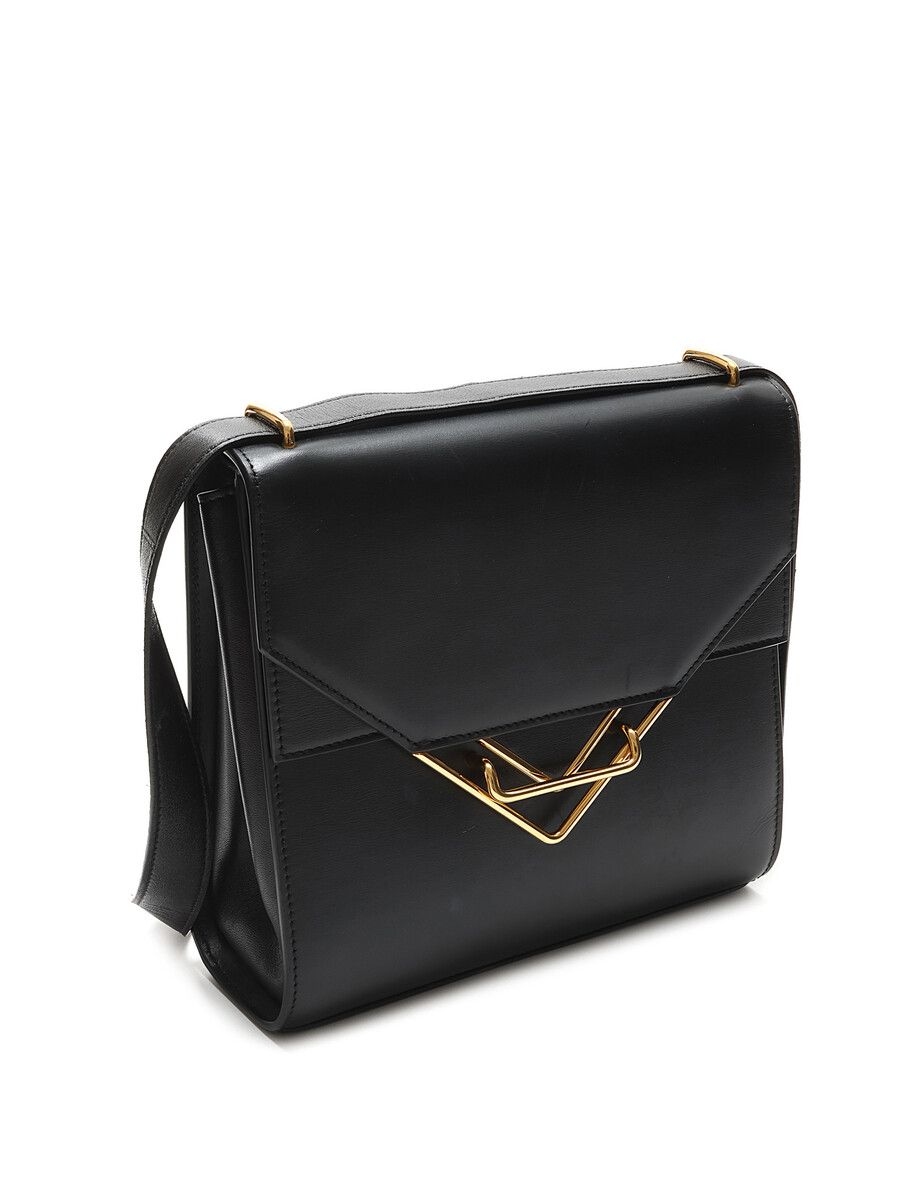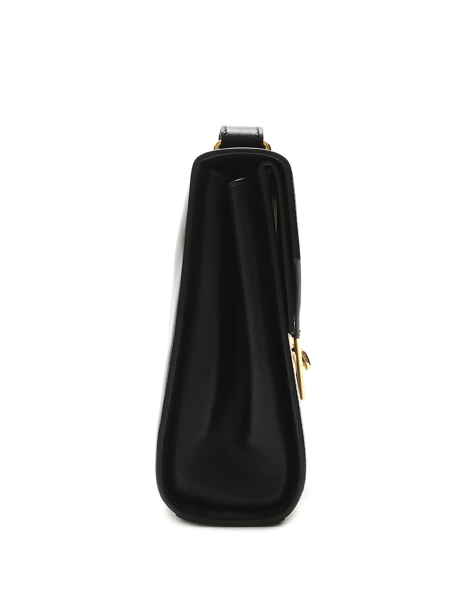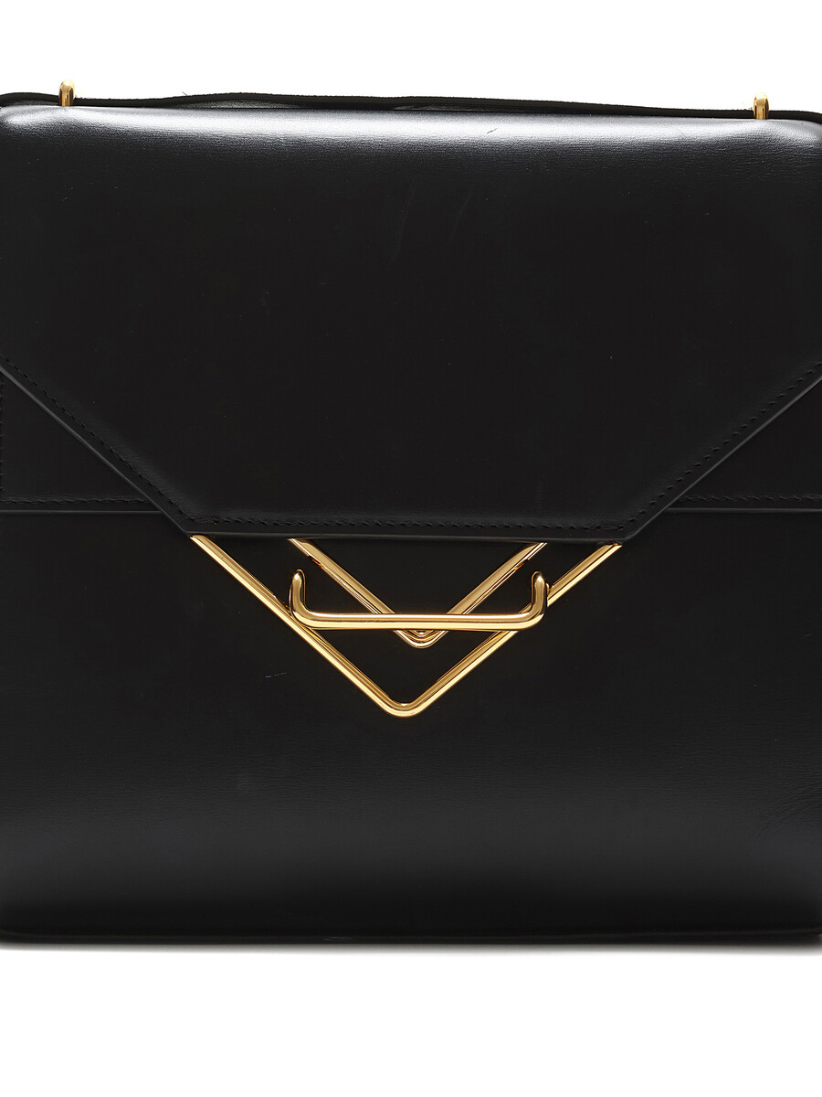 Sac à bandoulière en cuir grainé rectangulaire noir. Fermeture à fermoir triangulaire en métal. Bandoulière réglable en cuir. Ferrures dorées.