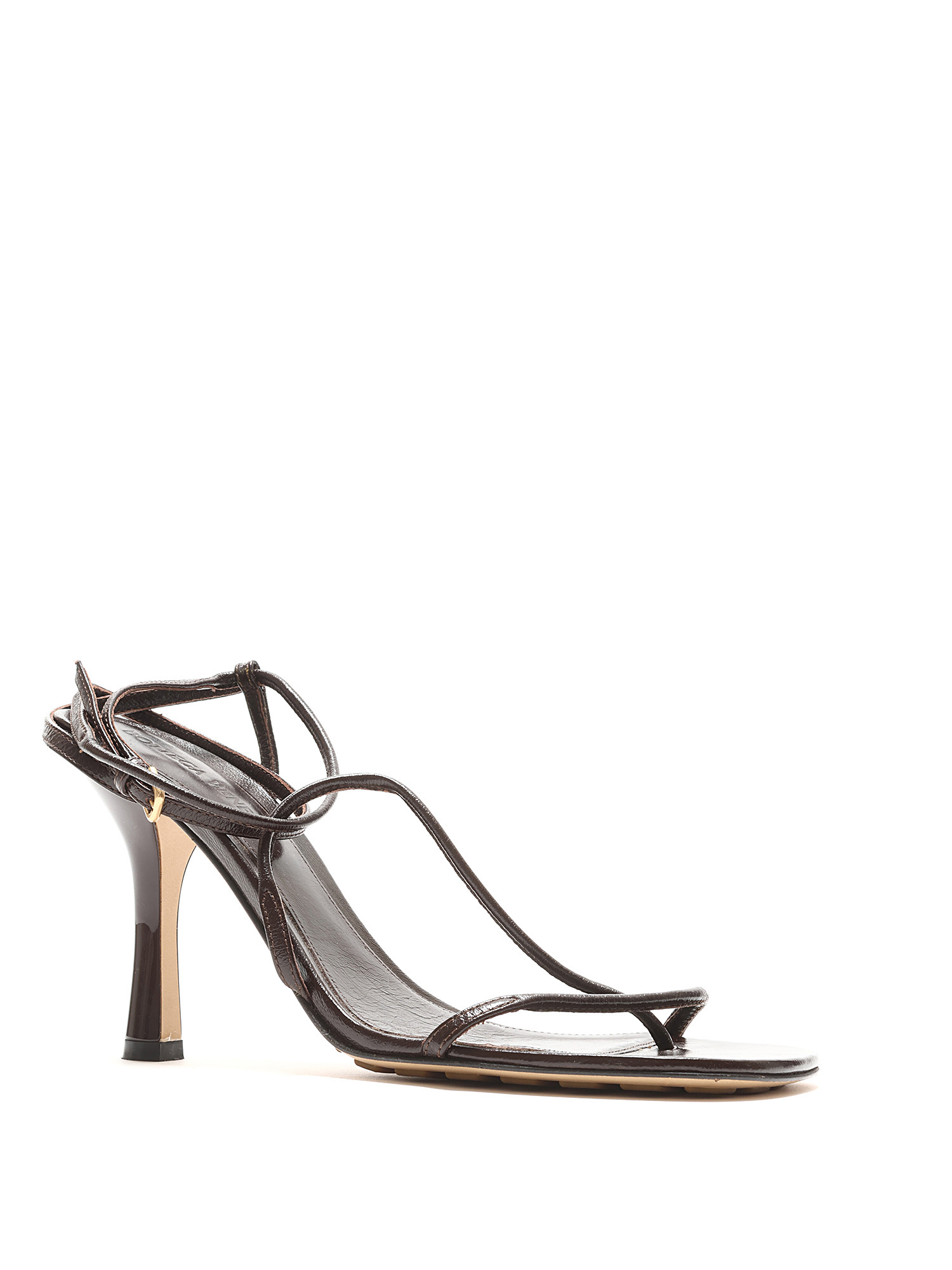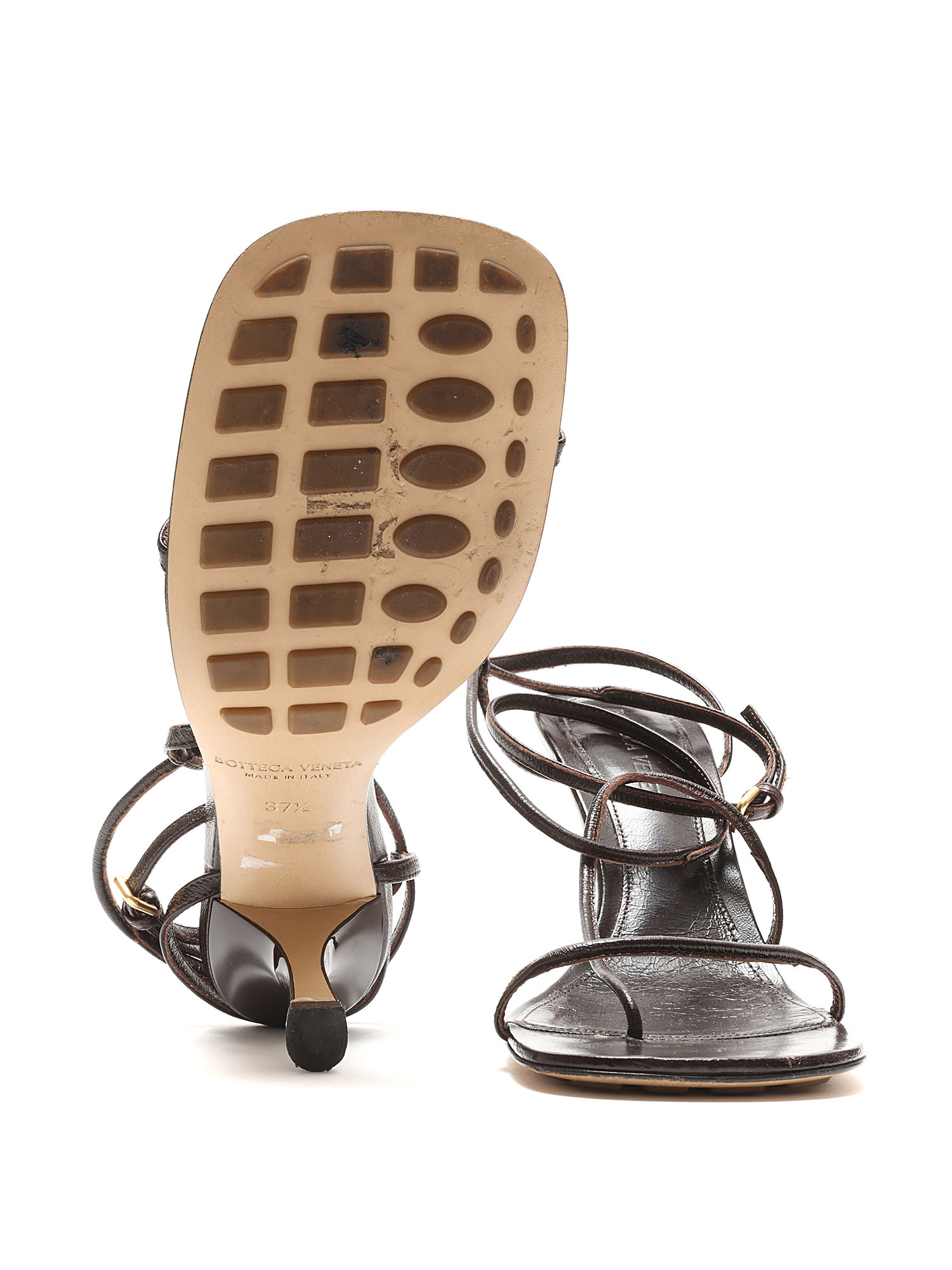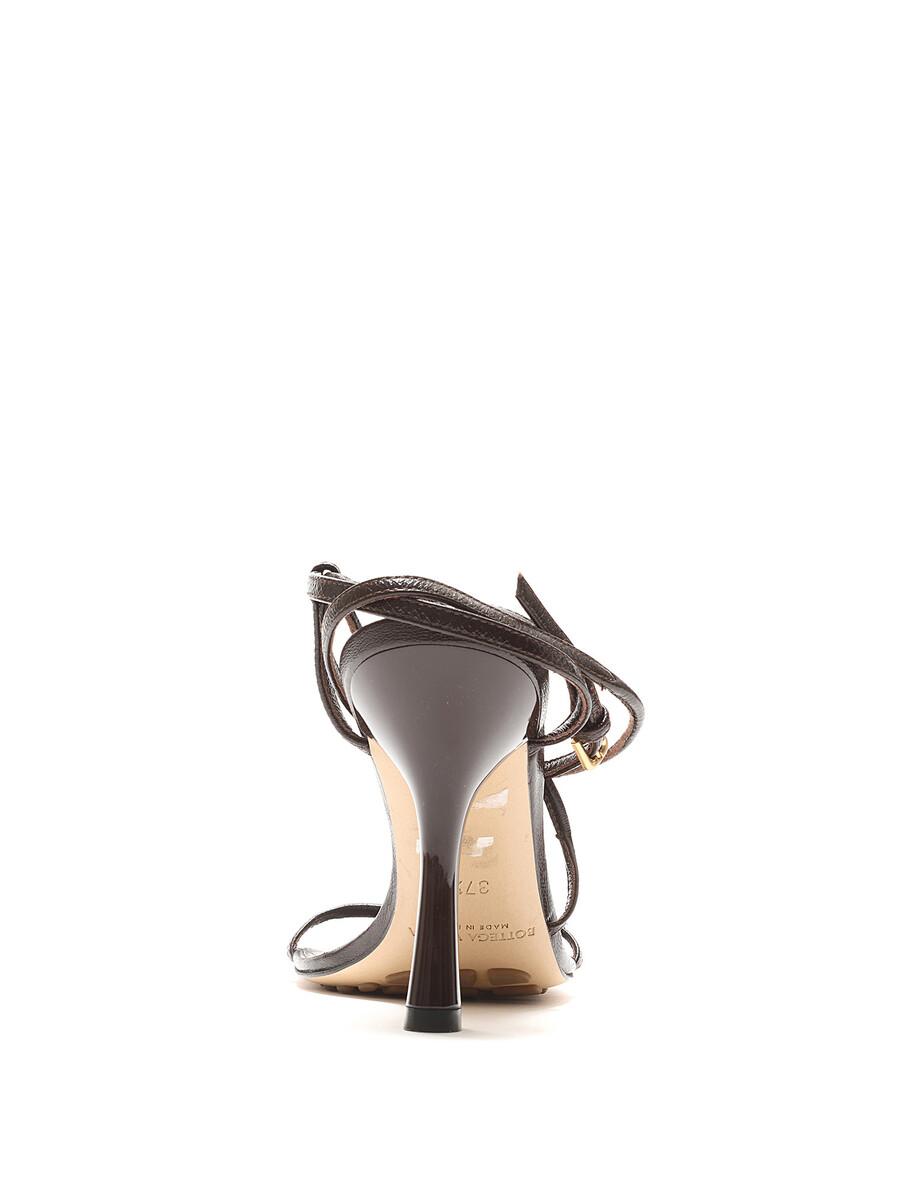 Sandales à brides croisées en brun foncé. Style à bout carré. Fermeture à boucle en métal doré. Semelle en caoutchouc. Avec boîte.