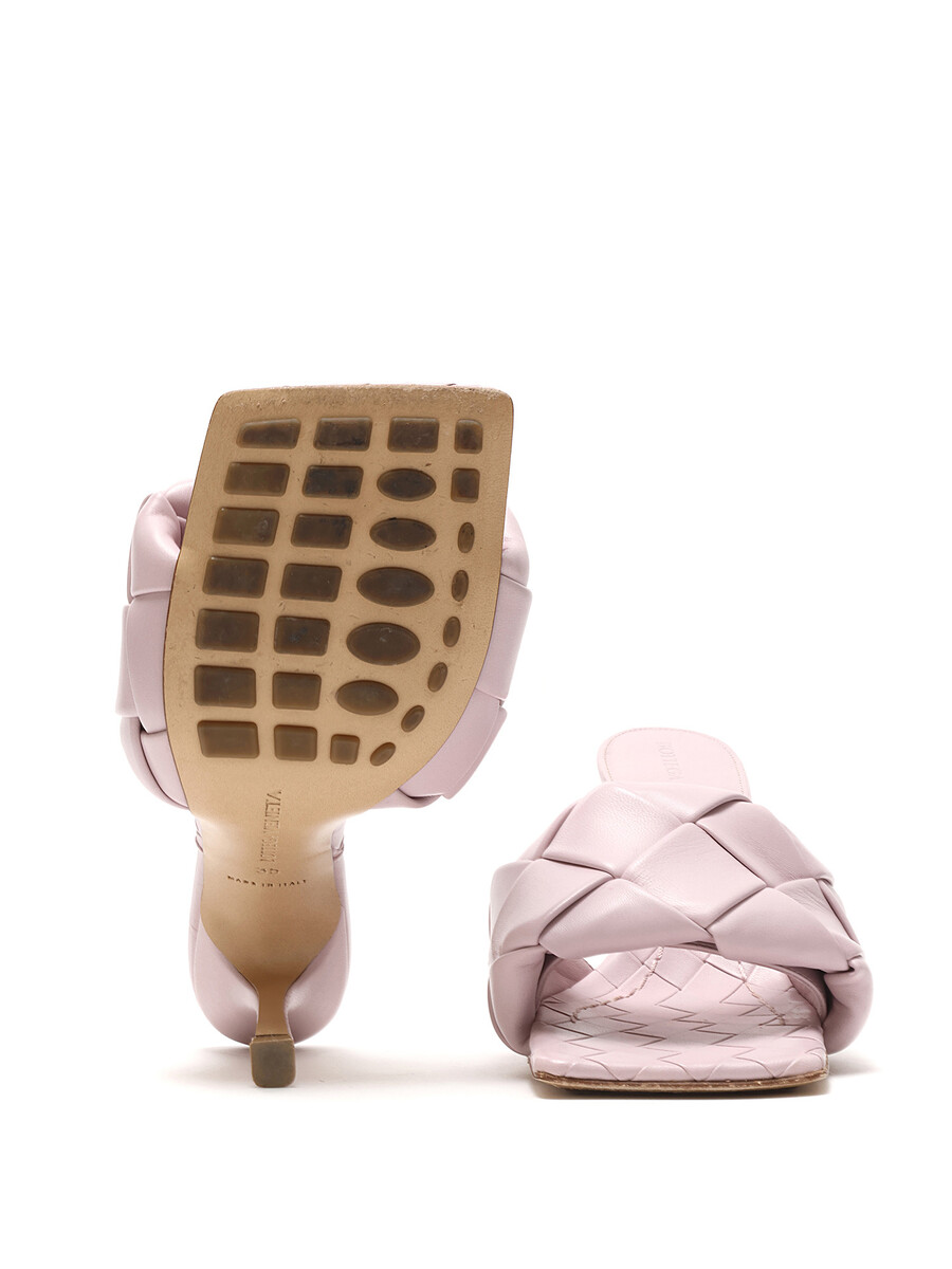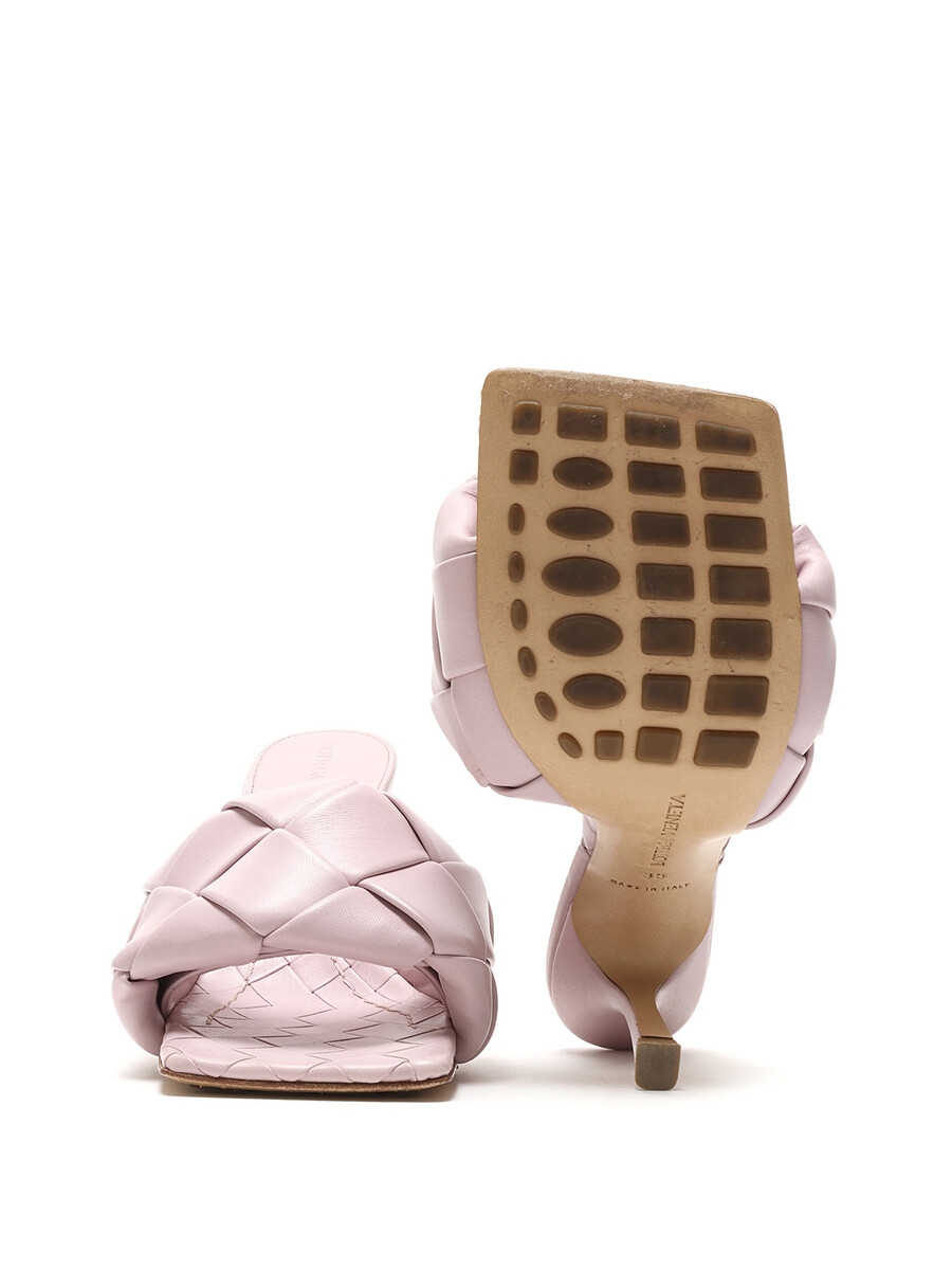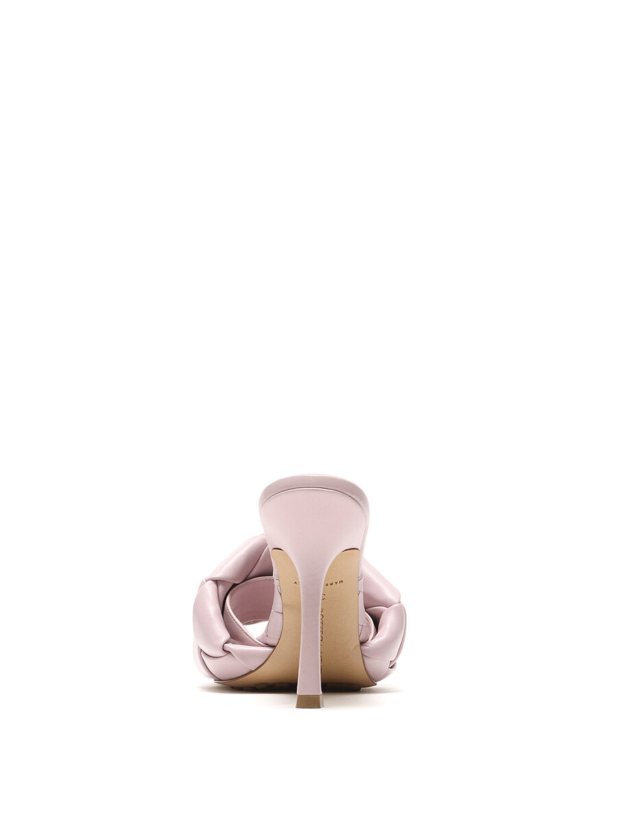 Sandales à talons en cuir lavande avec un détail matelassé Intrecciato. Fermeture à enfiler. Bout carré. Semelle en caoutchouc.