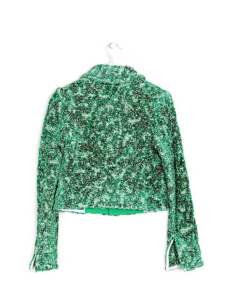 Veste courte en tweed de velours chenille dans des tons de vert, jaune et blanc. Col classique. Patte de boutonnage. Poches plaquées à l'avant.