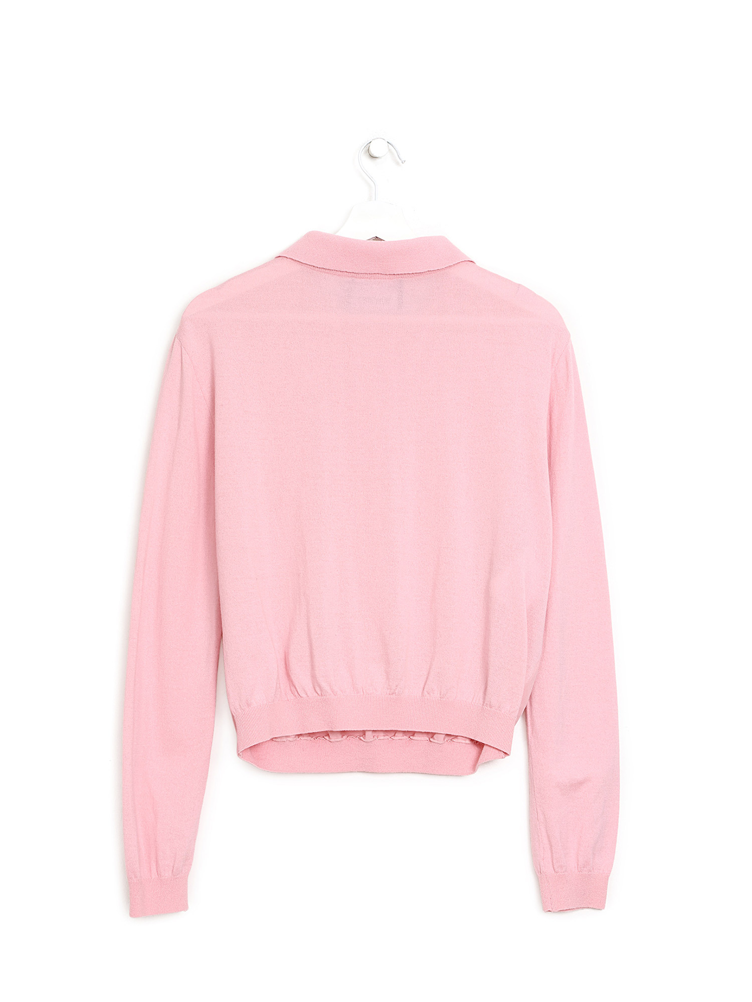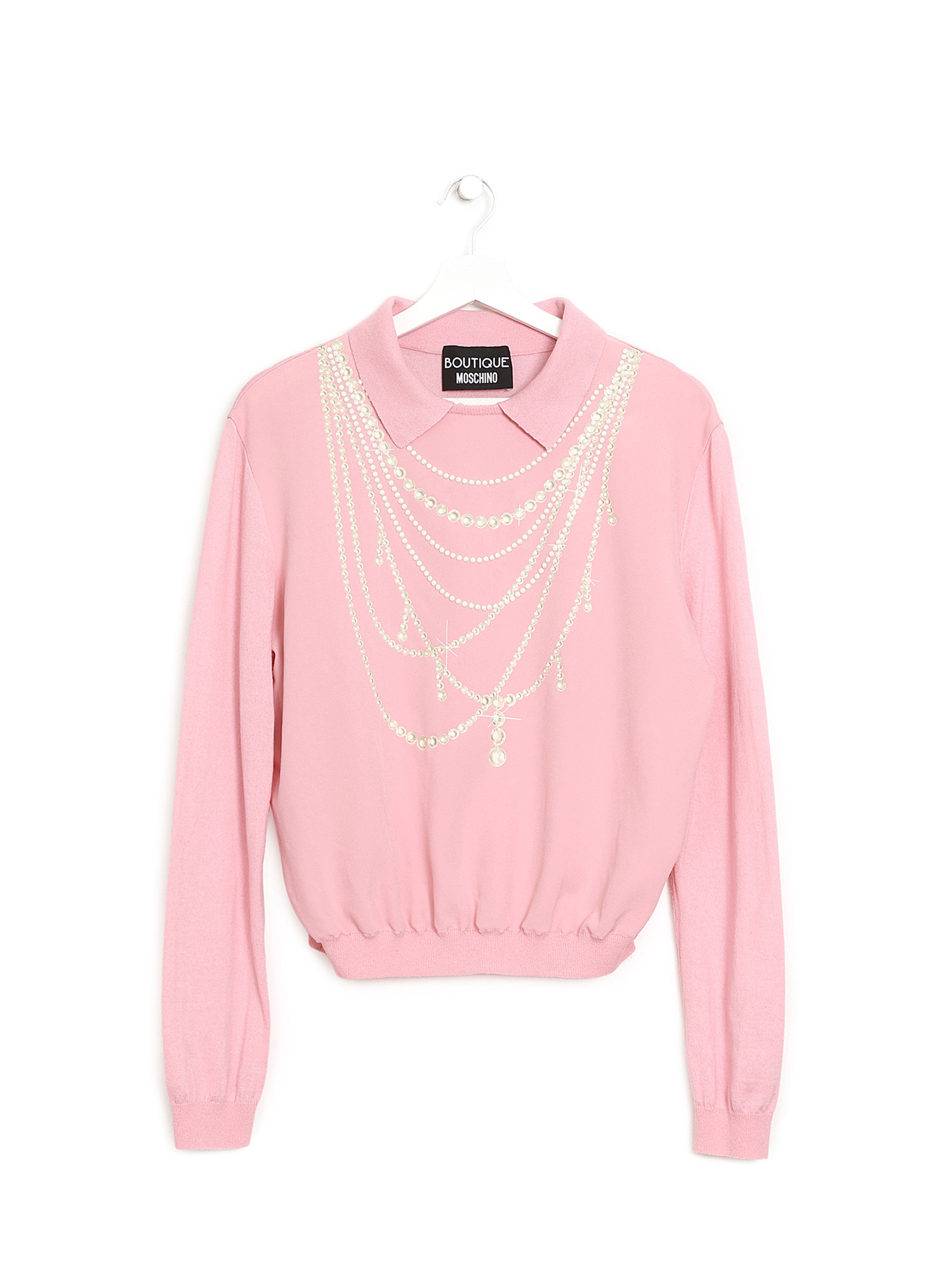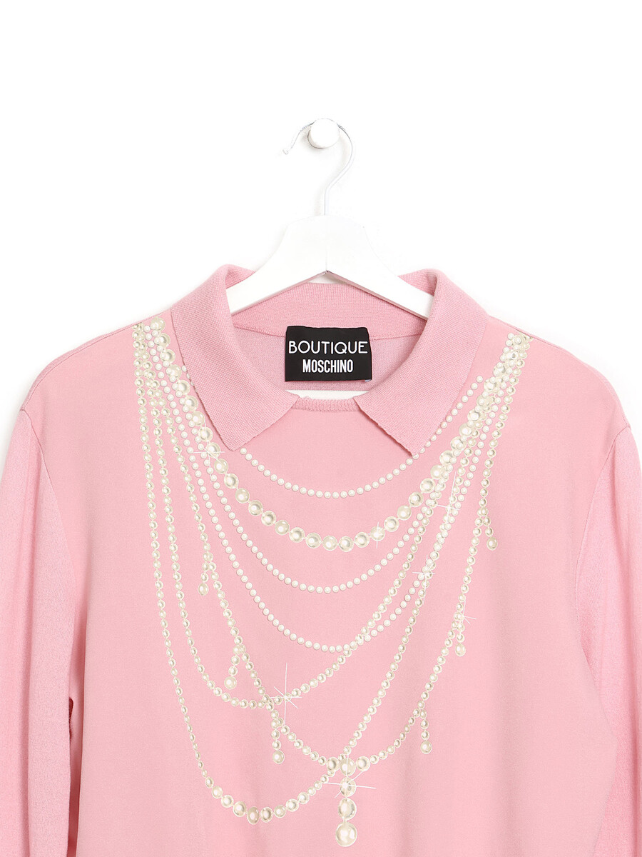 Pull en tricot avec motif de colliers de perles trompe-l'œil. Col classique.