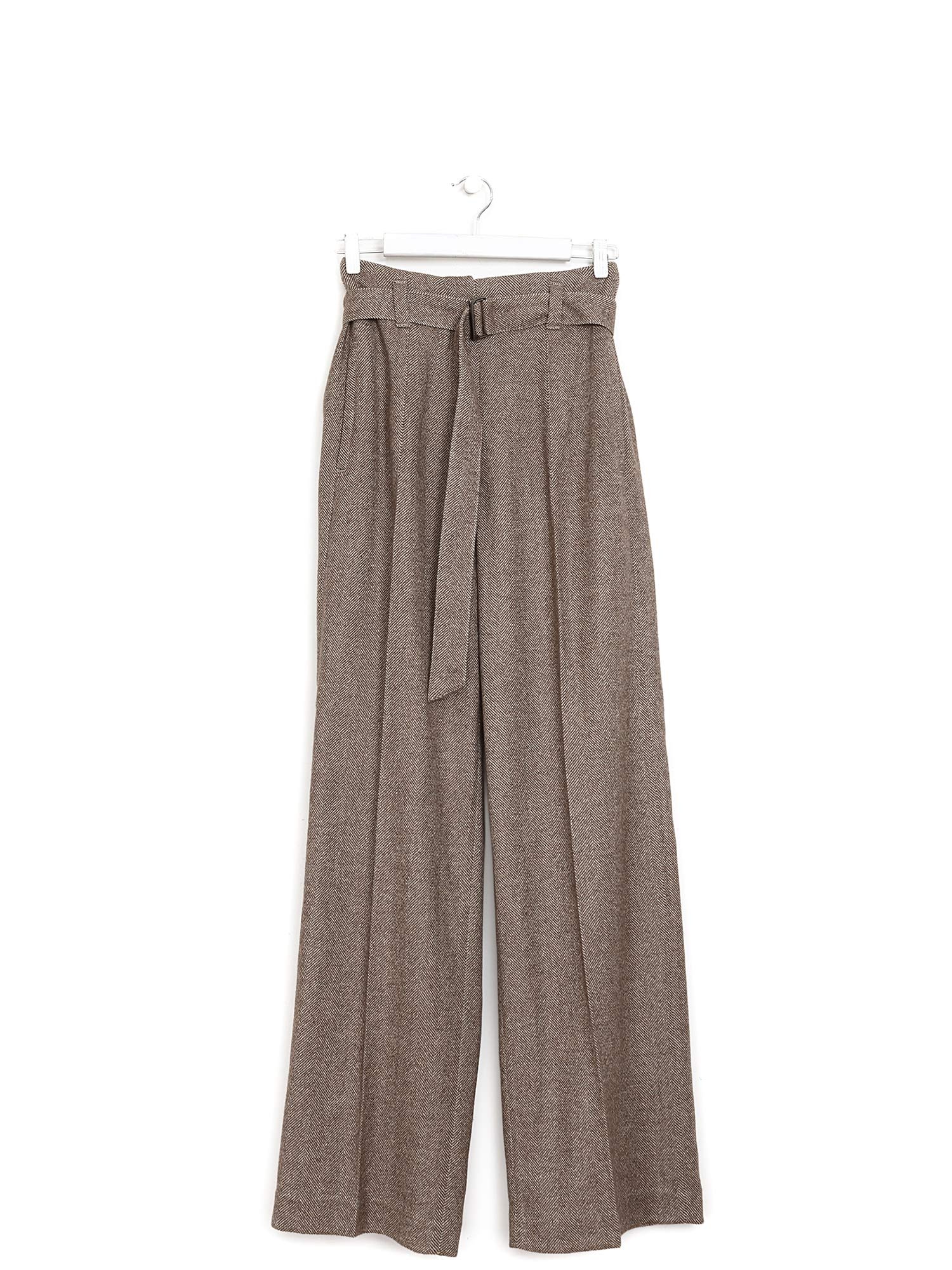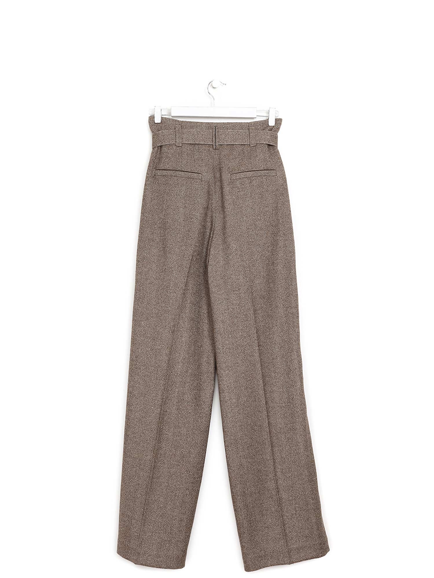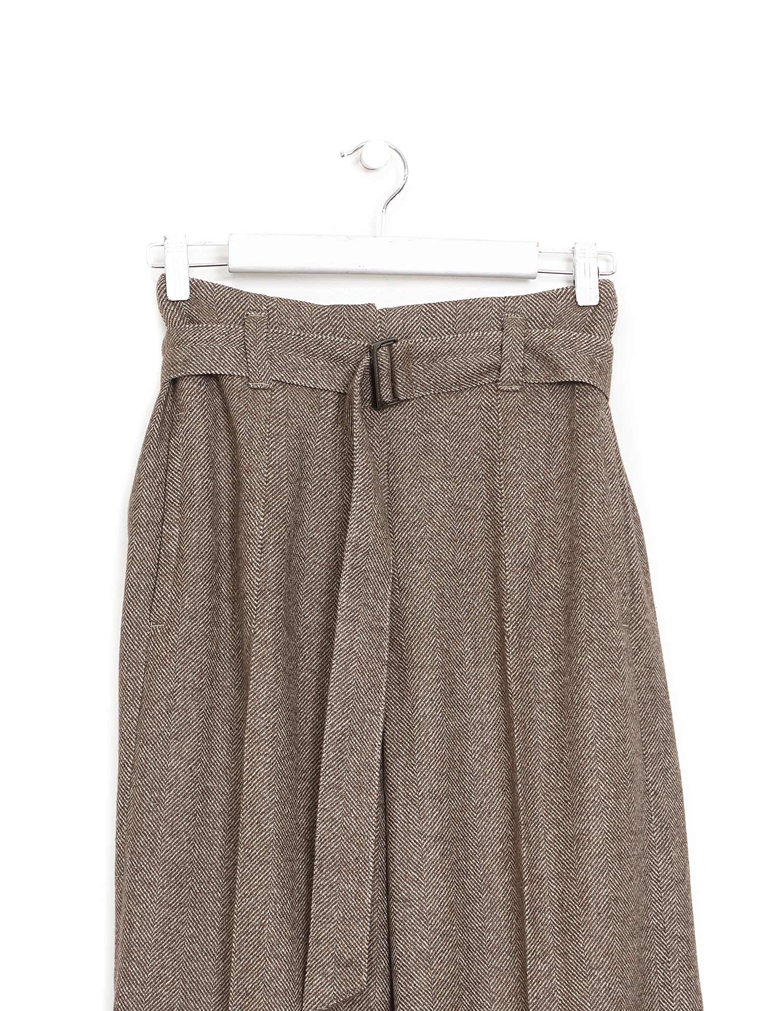 Pantalon en laine à motif chevrons en teintes de brun et beige. Taille ajustable avec fermeture à boutons. Quatre poches.
