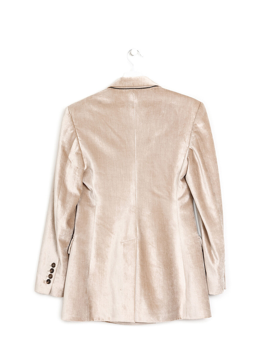 Blazer à manches longues en velours beige. Fermeture boutonnée sur le devant. Col cranté. Trois poches avant. Avec housse.