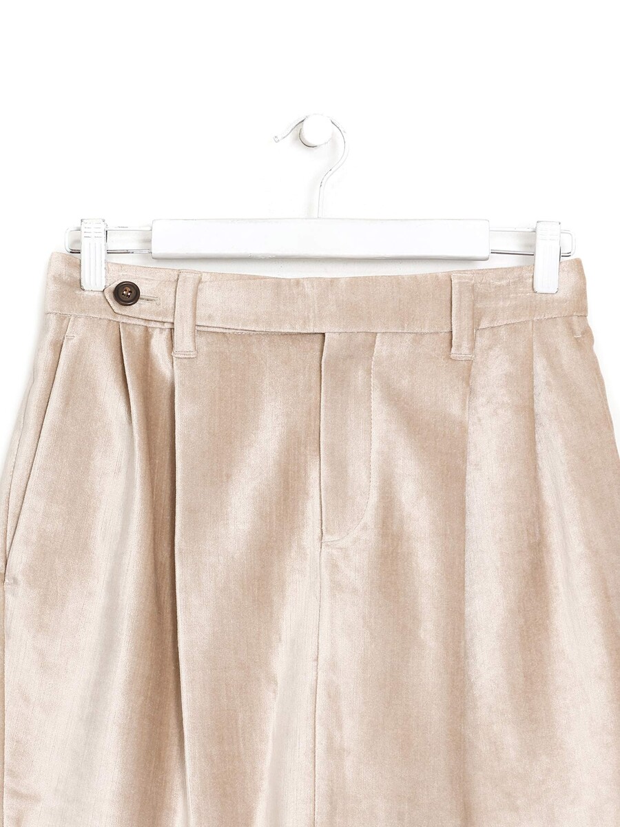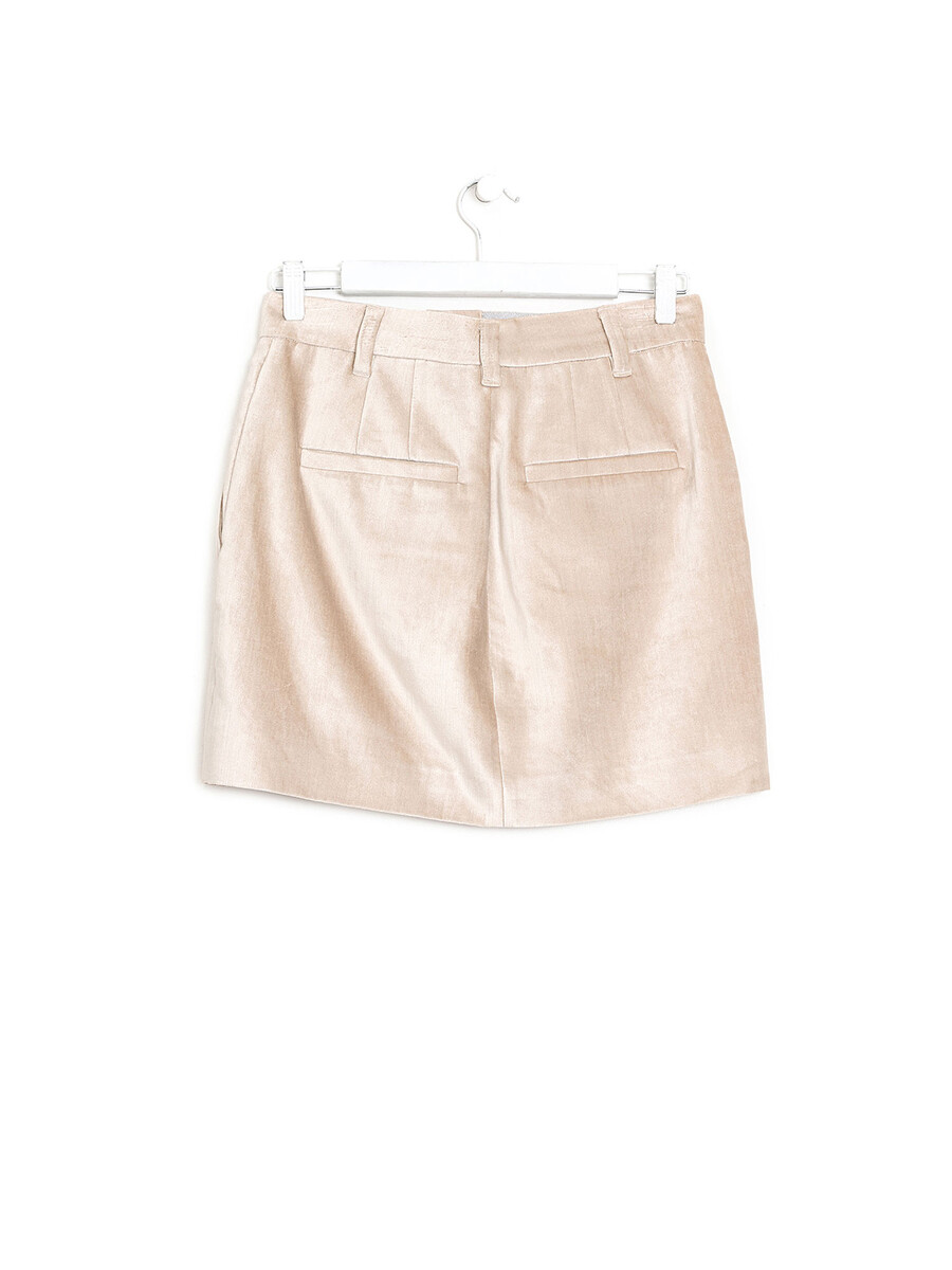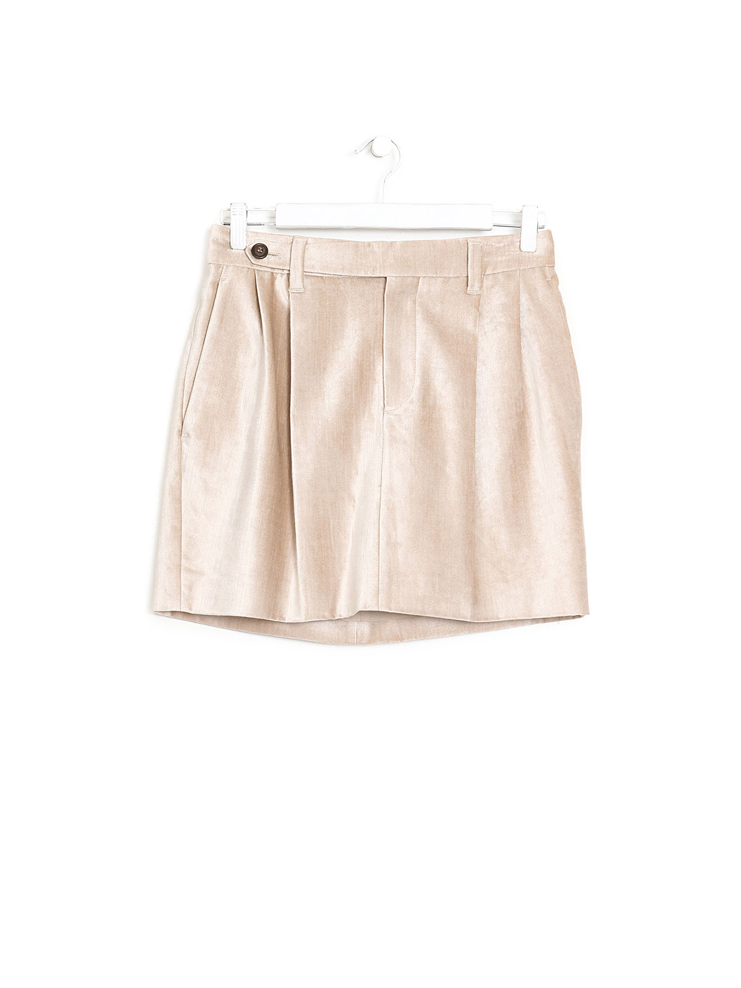 Mini-jupe en velours beige. Fermeture boutonnée sur le devant et zippée. Poches latérales.