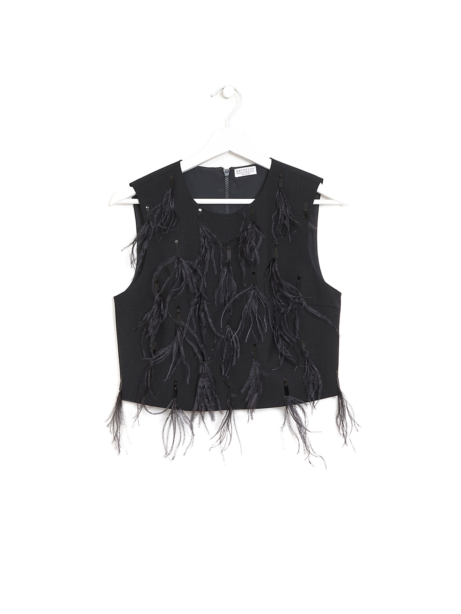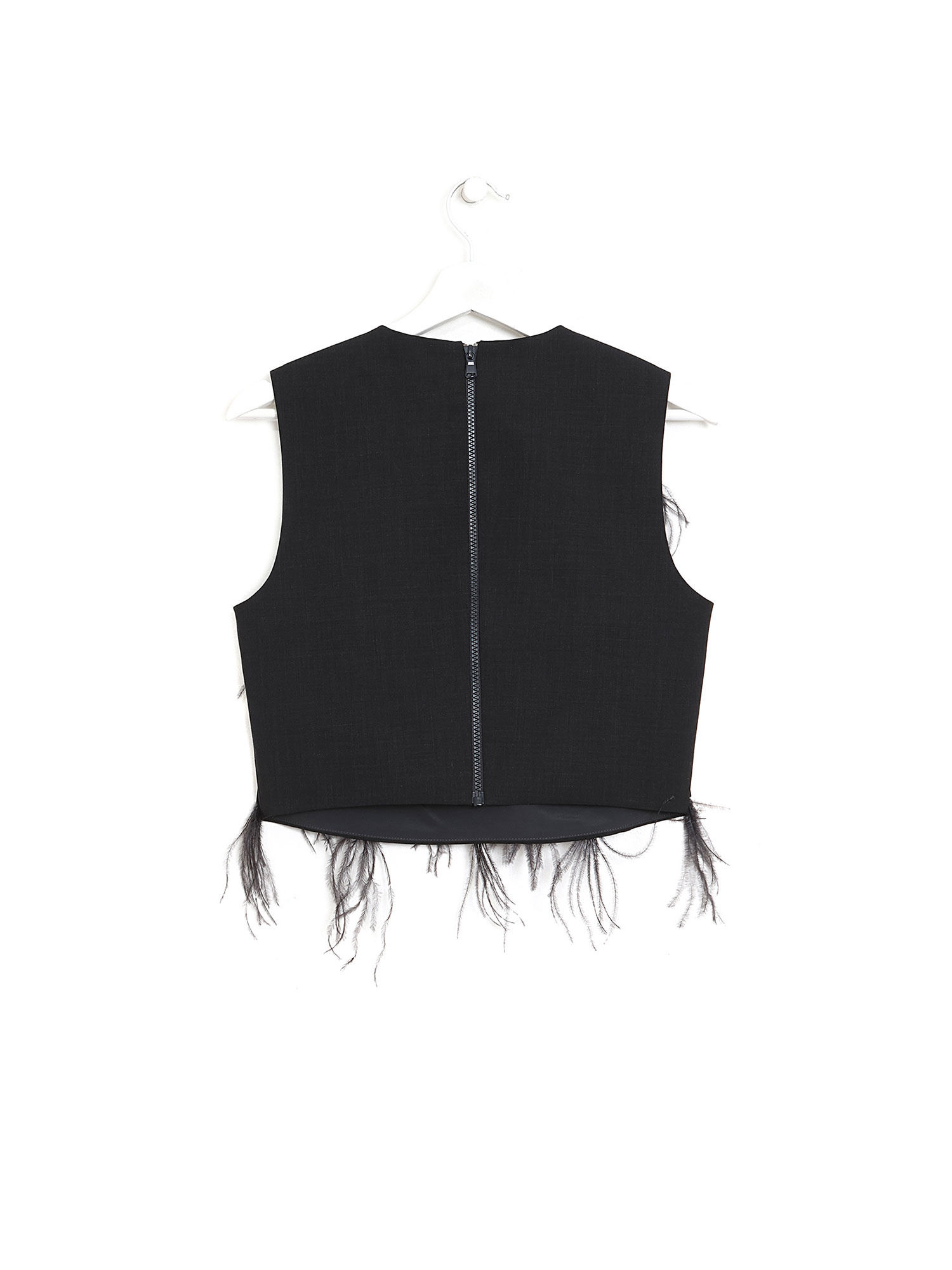 Haut sans manches noir avec détails en plumes. Col rond. Fermeture éclair.