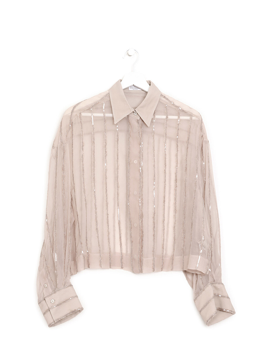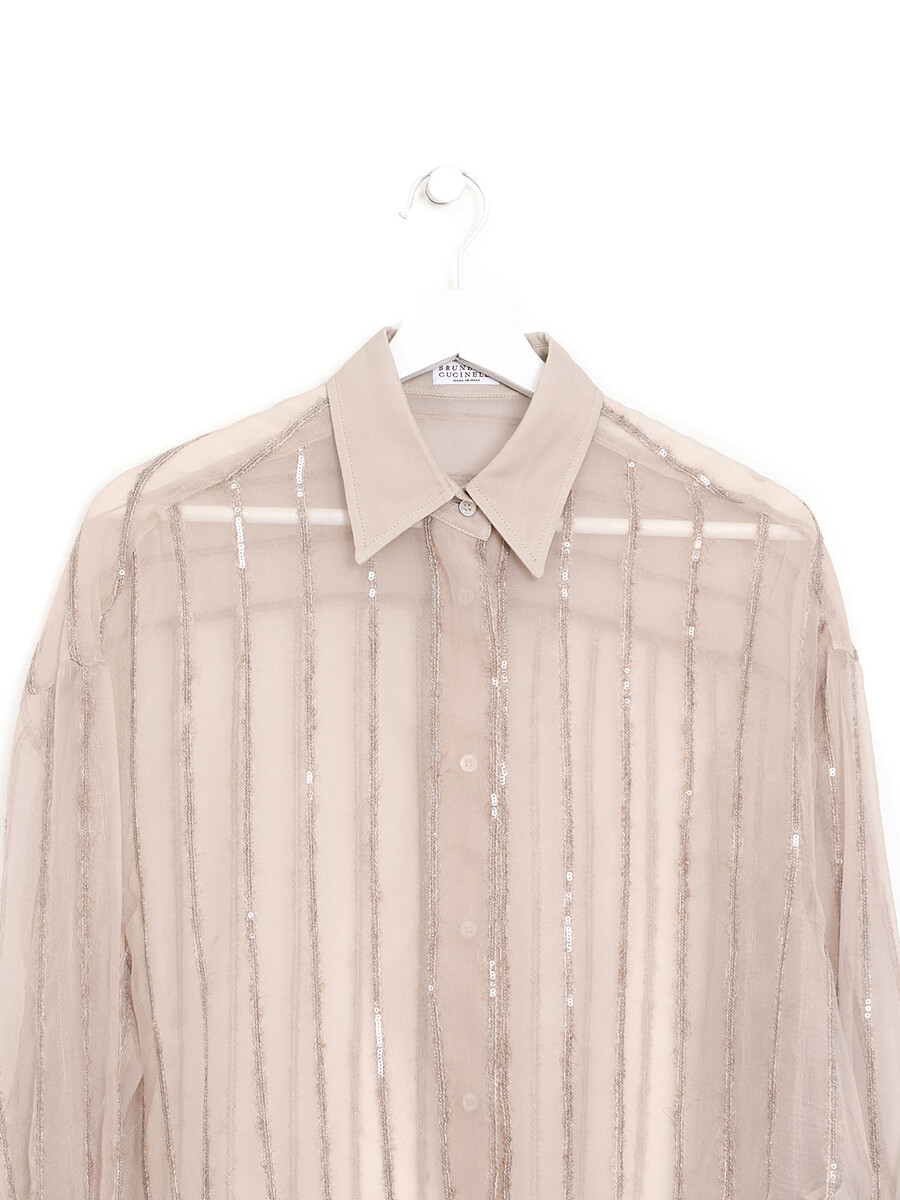 Chemisier transparent à manches longues, entièrement pailleté en beige. Fermeture boutonnée. Col chemise.