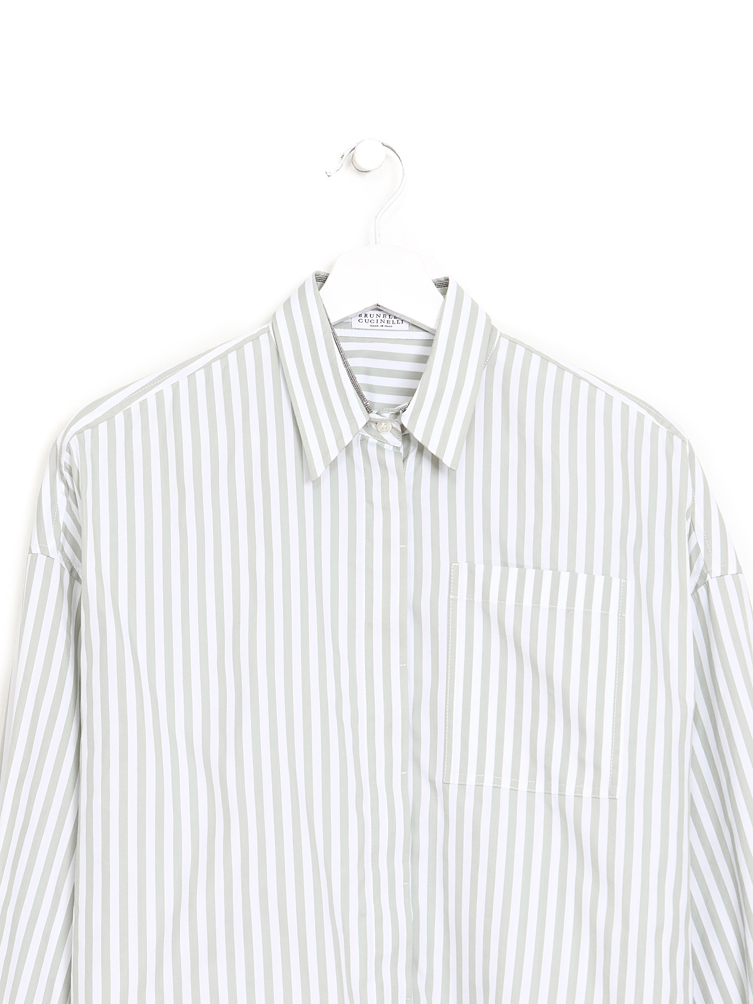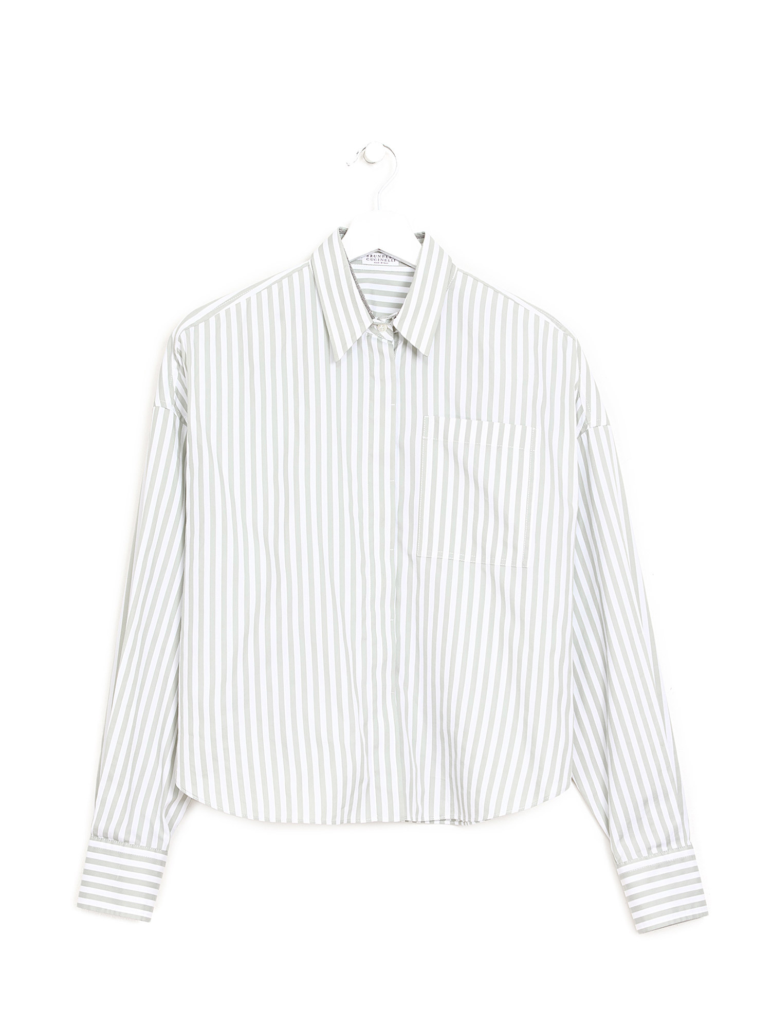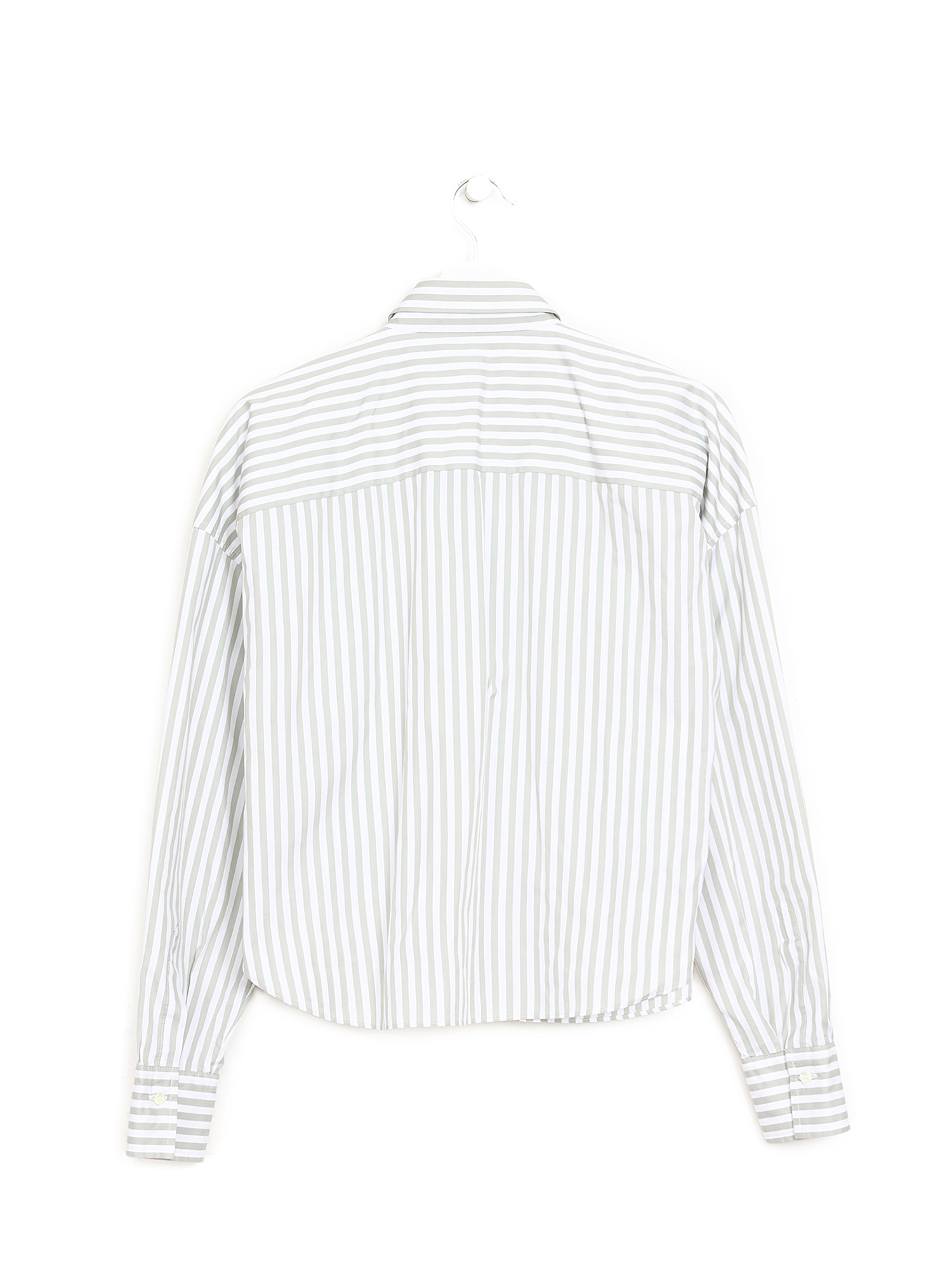Chemise à manches longues rayée verte et blanche. Fermeture à boutons. Col chemise avec liserai de strass.