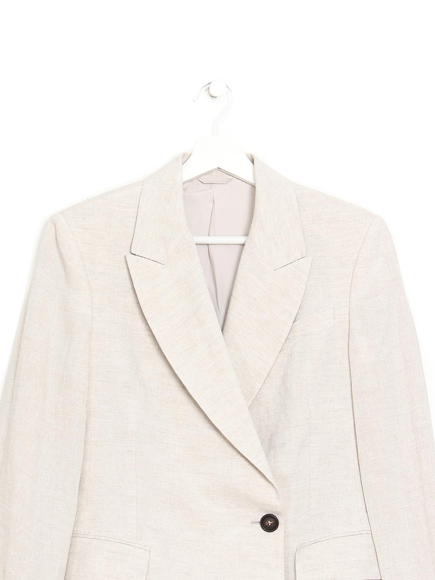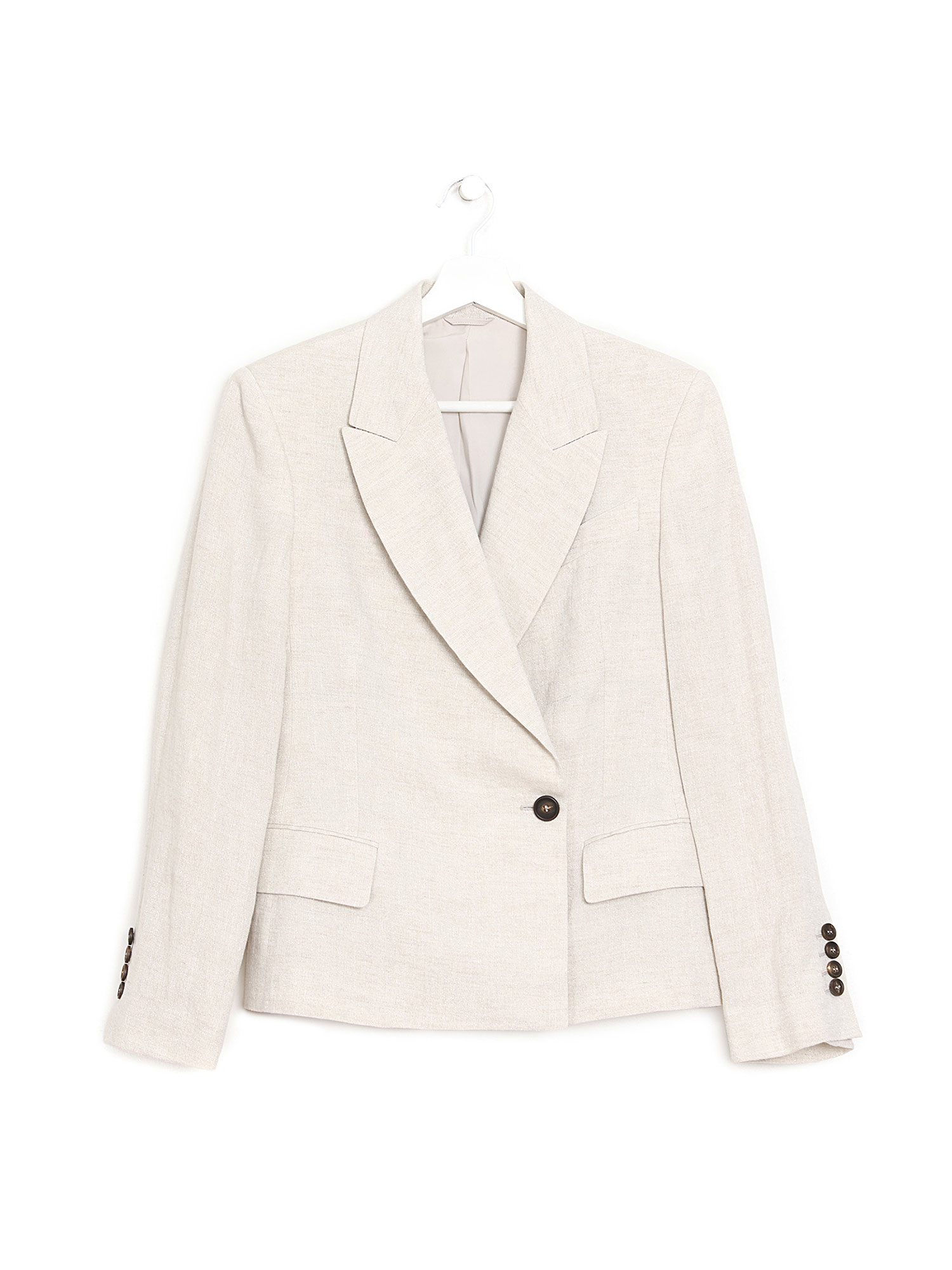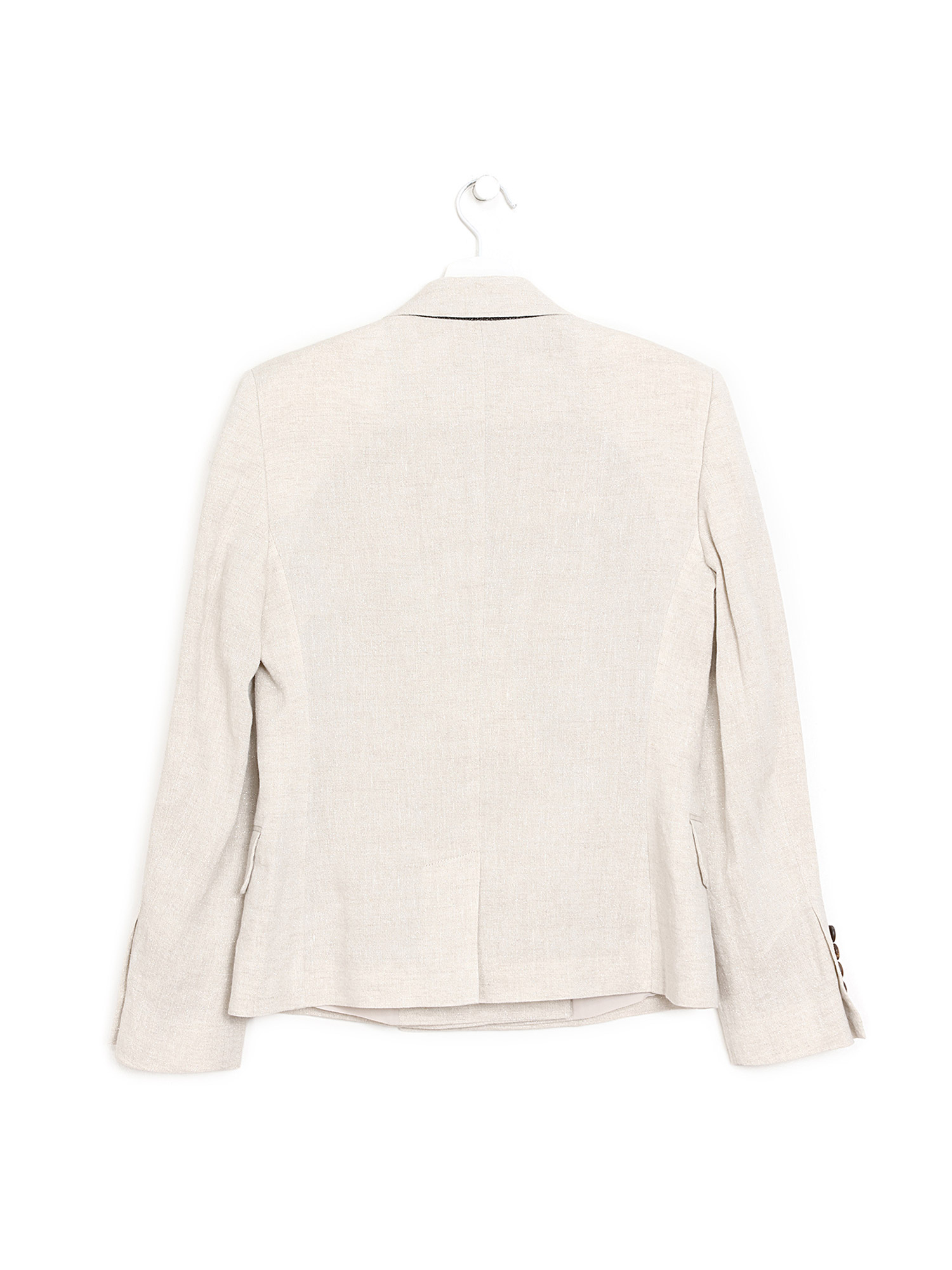 Veston en mélange de lin beige. Fermeture à boutons. Col à cran. Coupe ajustée.