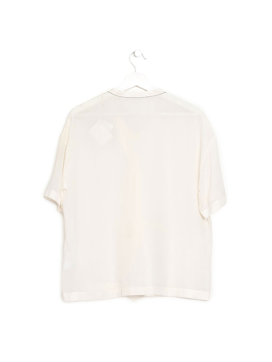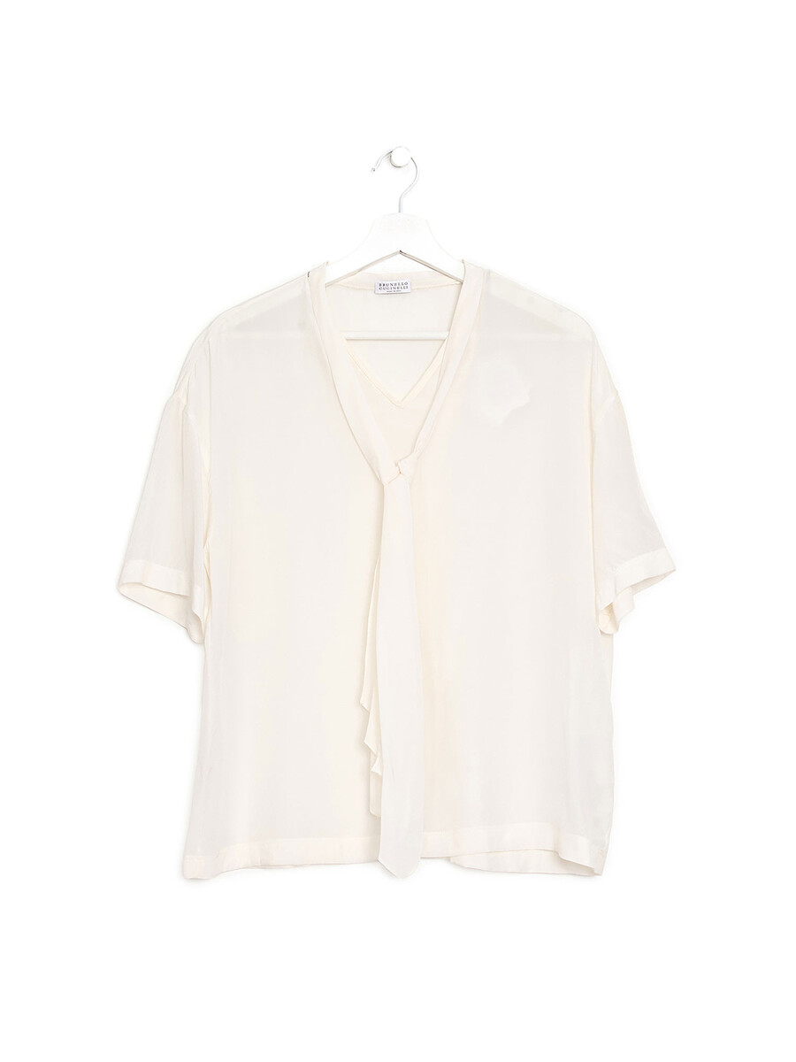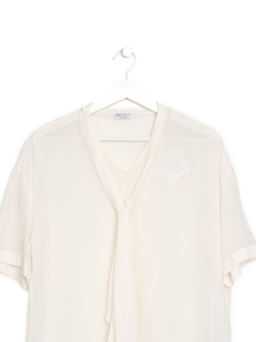 Blouse en soie transparente blanche. Découpe élégante en col V. Légère et semi-transparente.