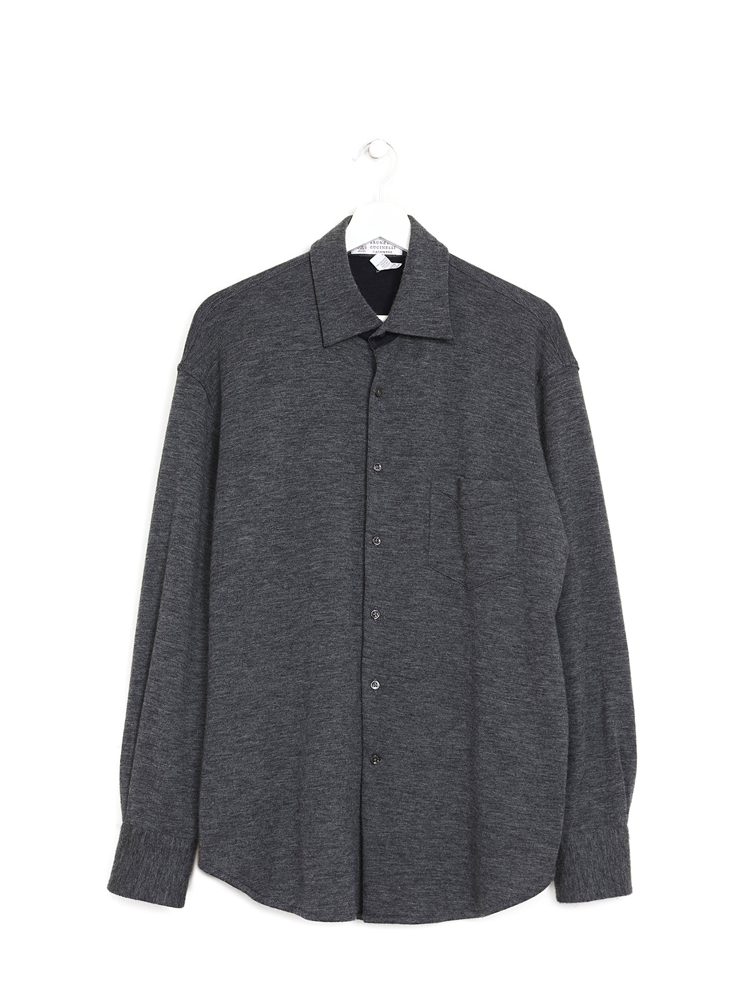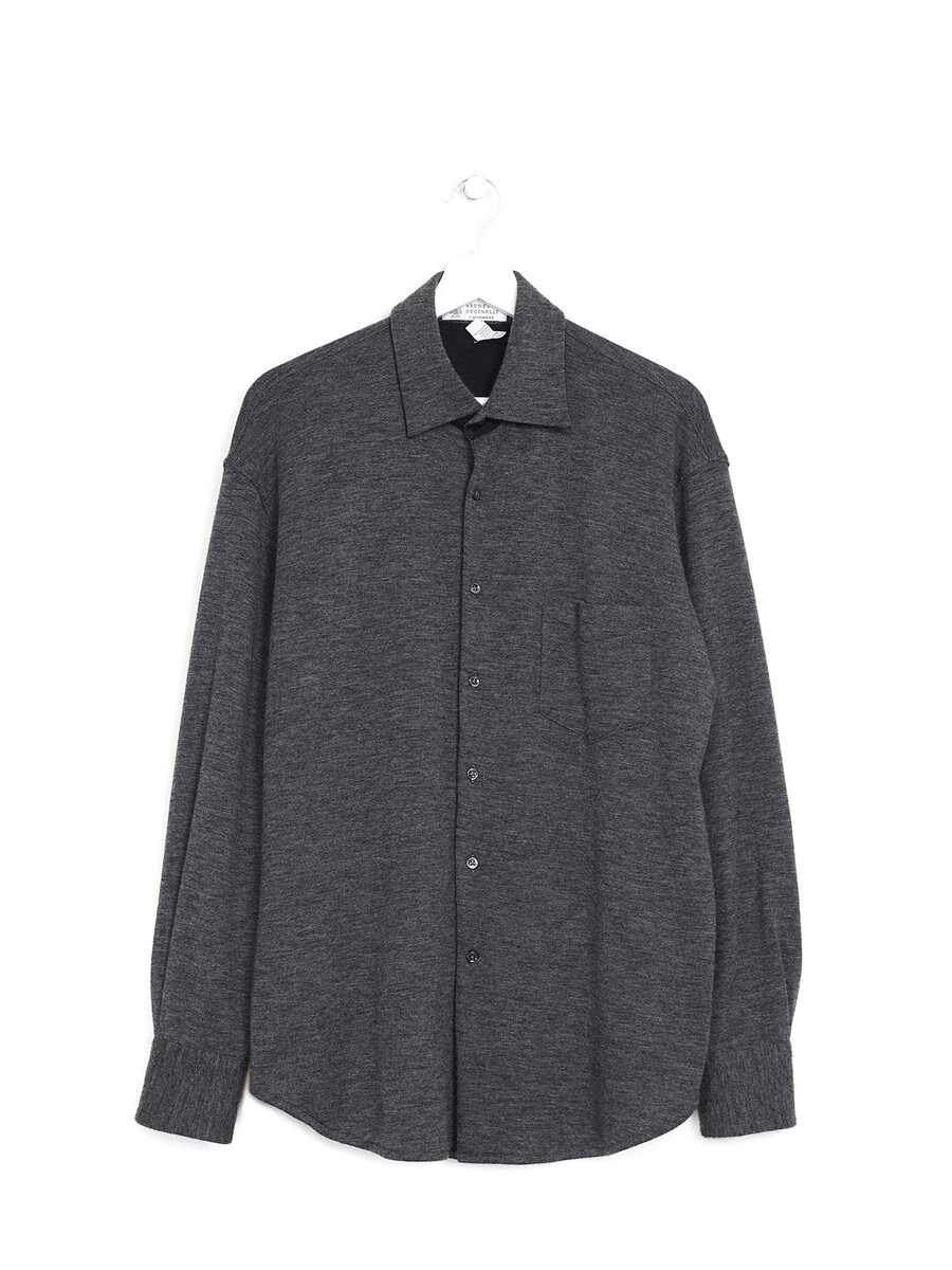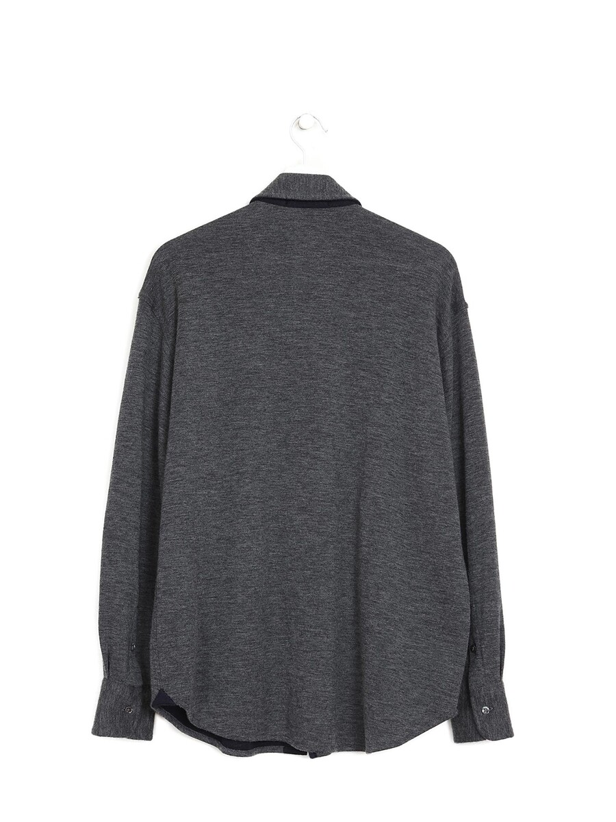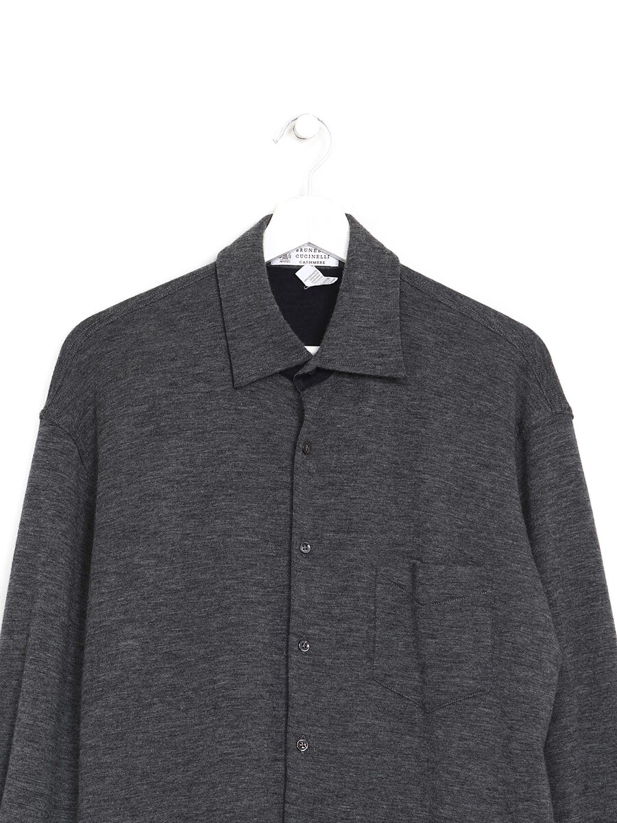 Chemise à manches longues grise. Fermeture à boutons sur le devant. Col de chemise.