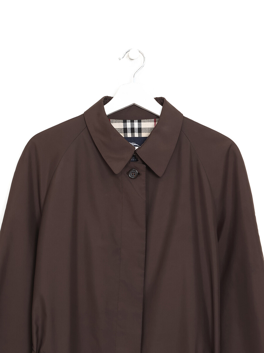 Trench-coat mi-long en nylon brun. Fermeture à boutons sur le devant. Col chemise classique. Deux poches latérales. Ceinture ajustable à la taille.
