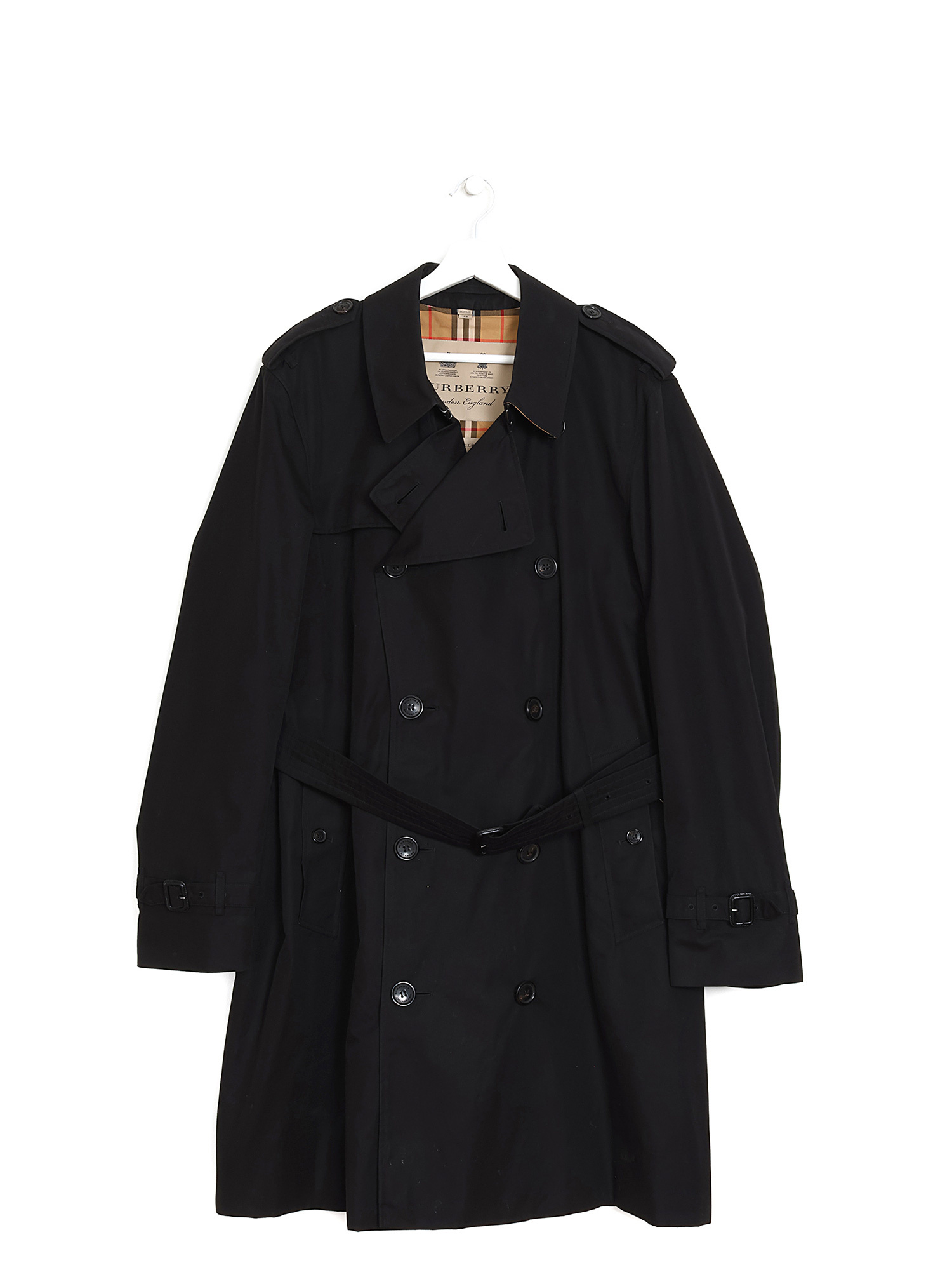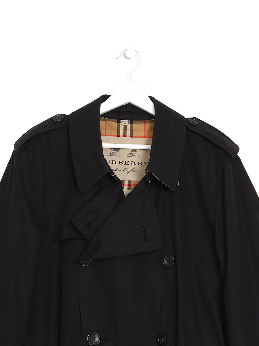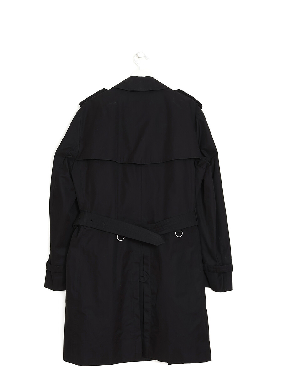 Manteau mi-long style trench noir. Col classique. Fermeture à boutons noirs. Poches à rabat devant. Ceinture ajustable et amovible à la taille.