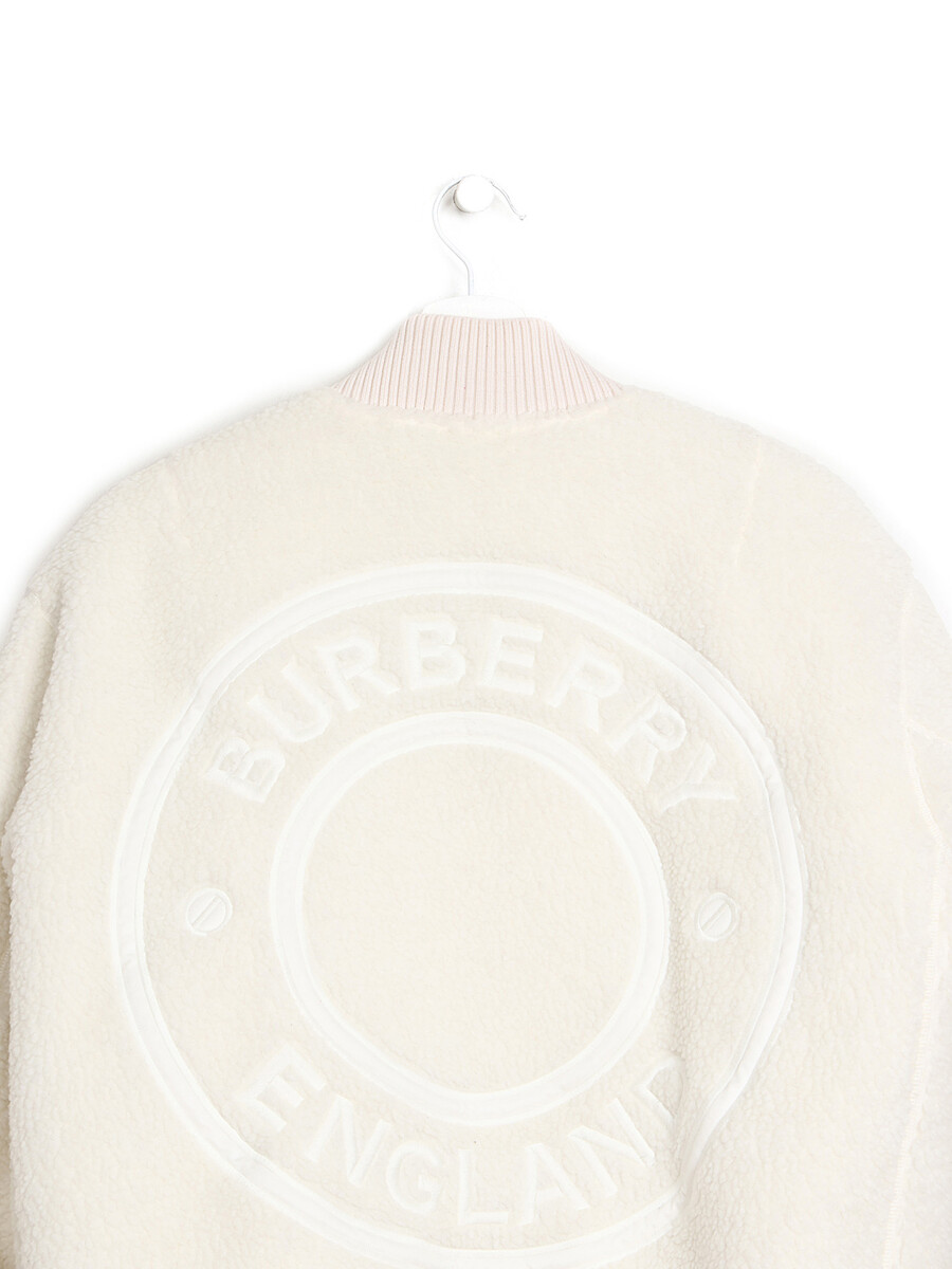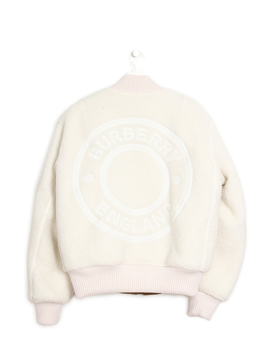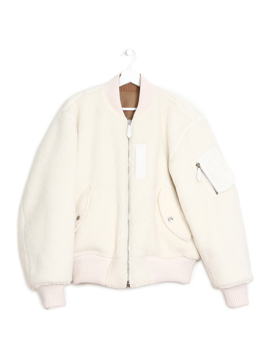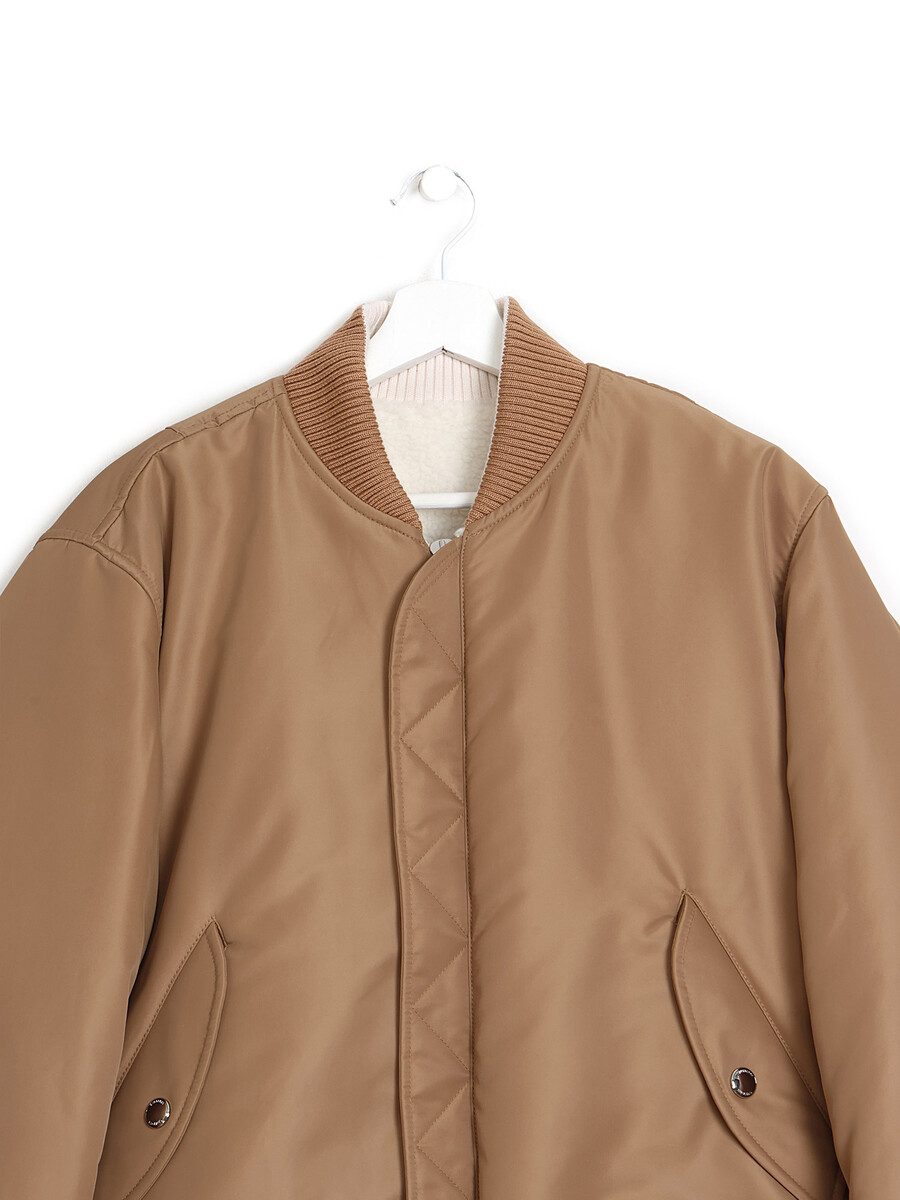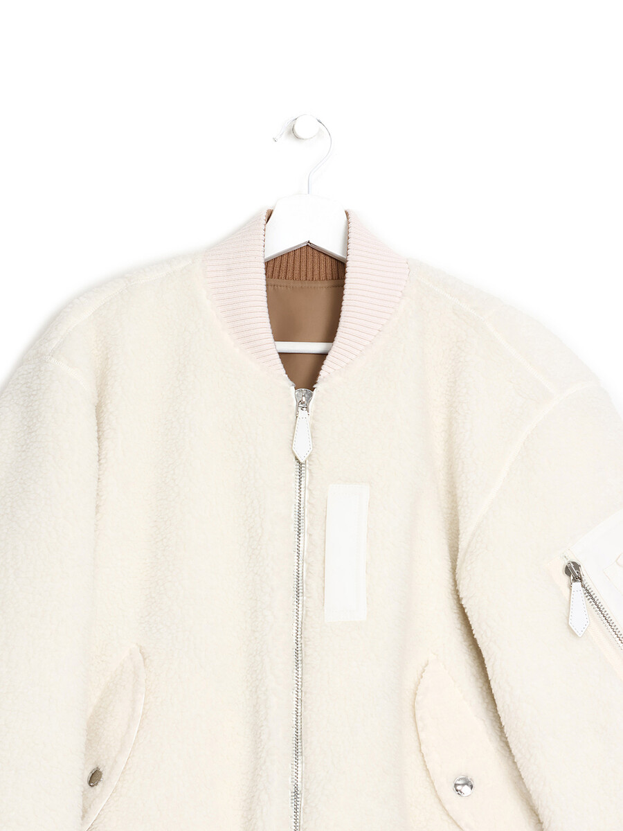 Blouson bombardier à manches longues en shearling synthétique blanc et nylon marron. Col côtelé. Fermeture à glissière. Poche zippée sur la manche et poches à rabat sur le devant.