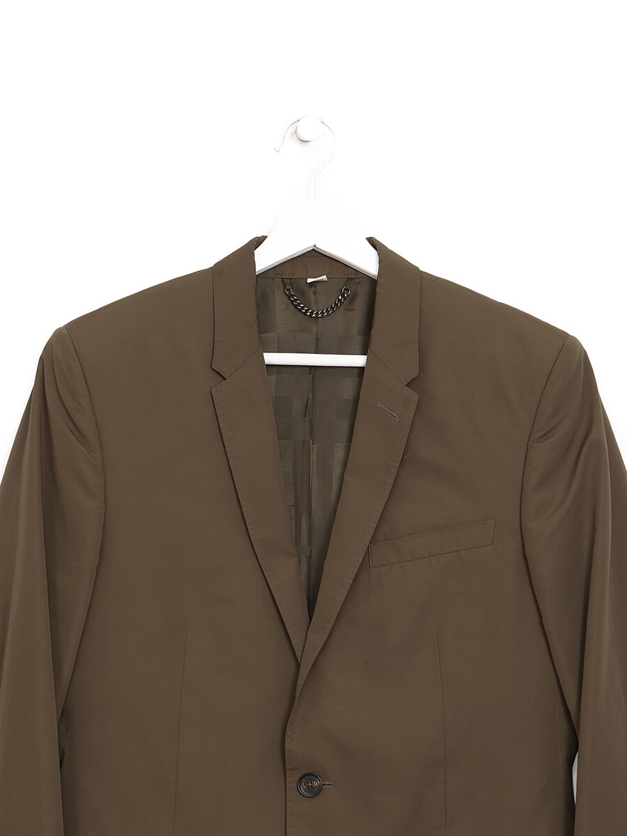 Blazer classique en olive avec fermeture à boutons sur le devant. Col à revers. Poches à rabat sur chaque côté. Coupe ajustée.