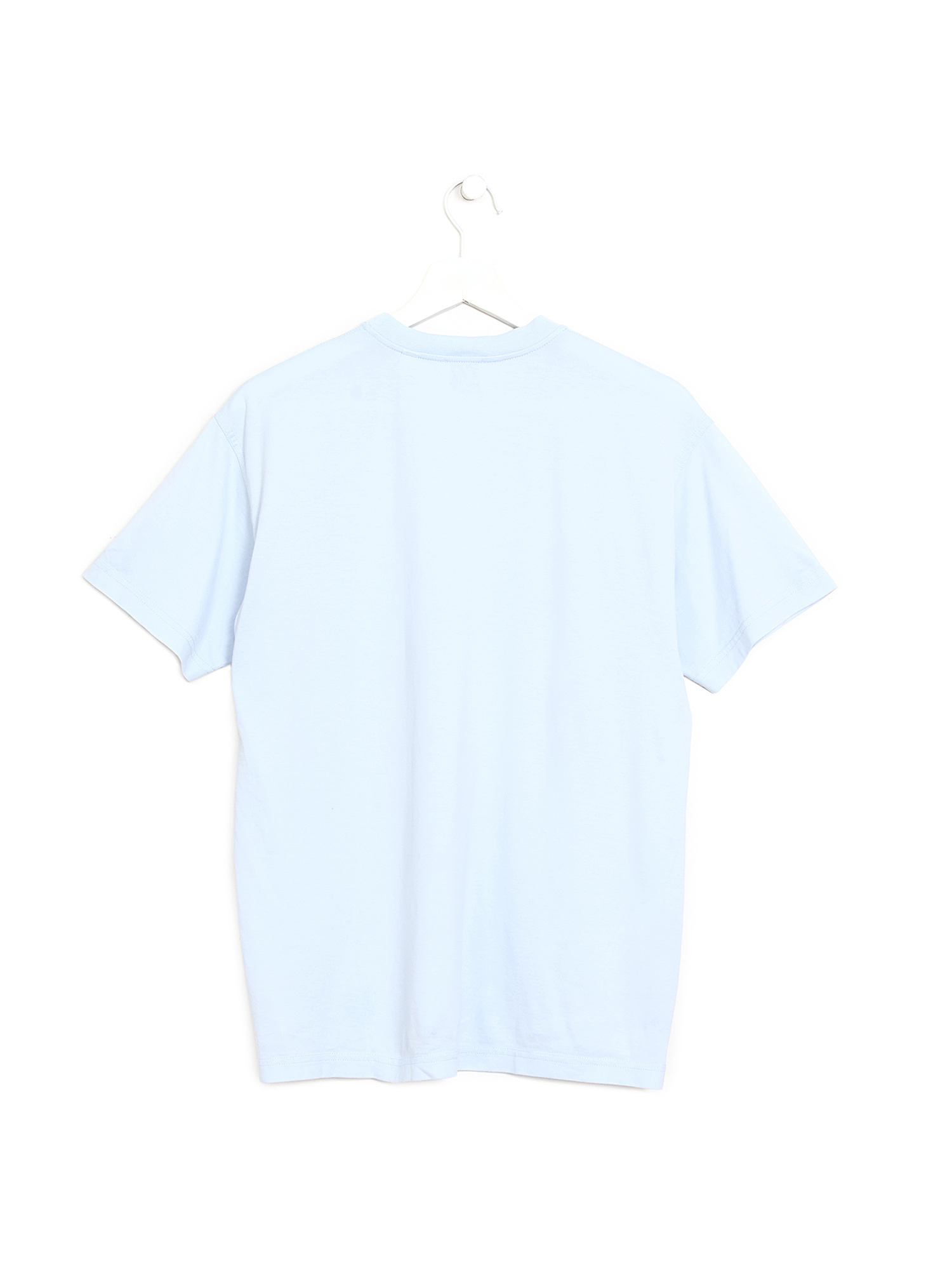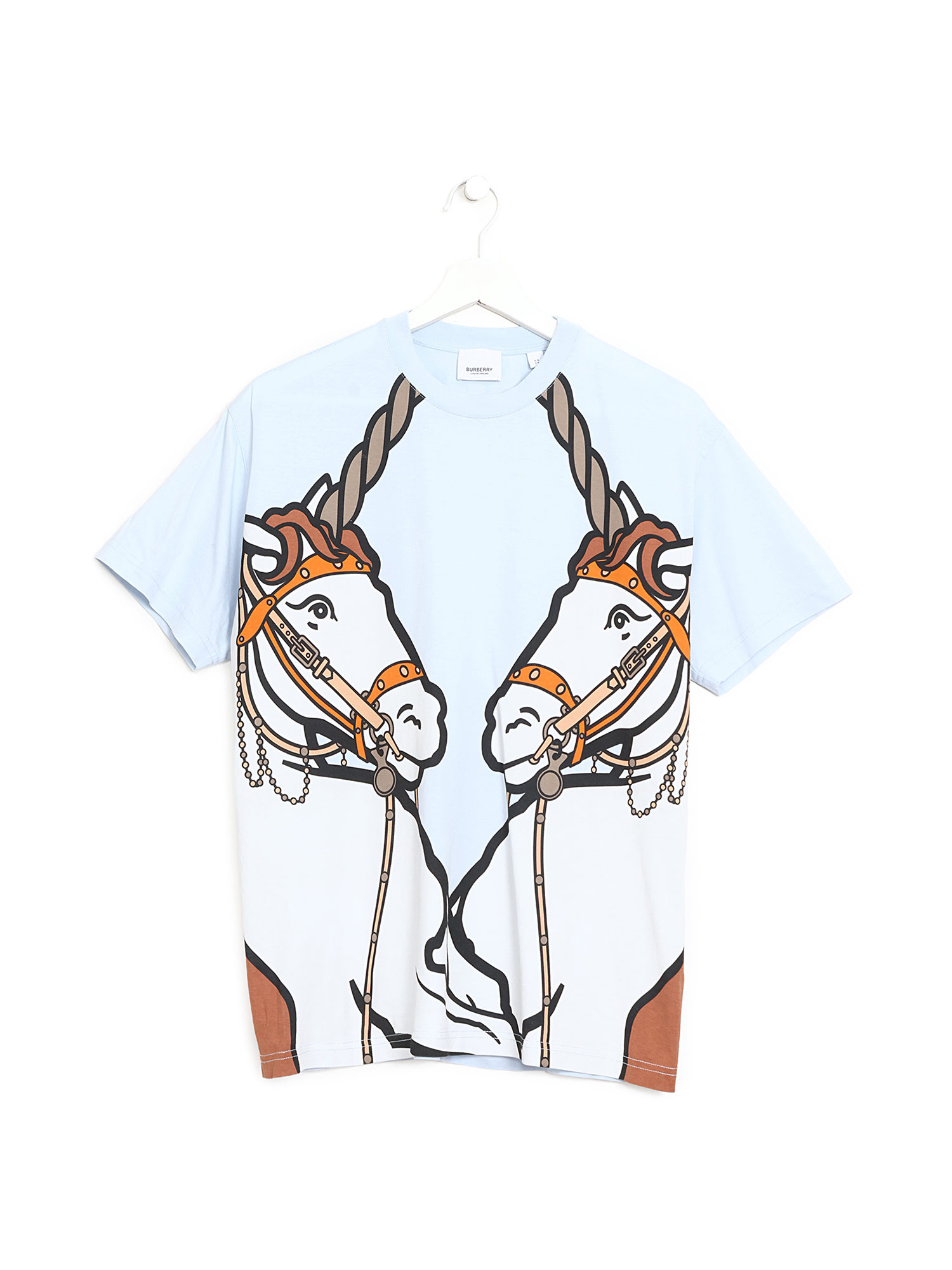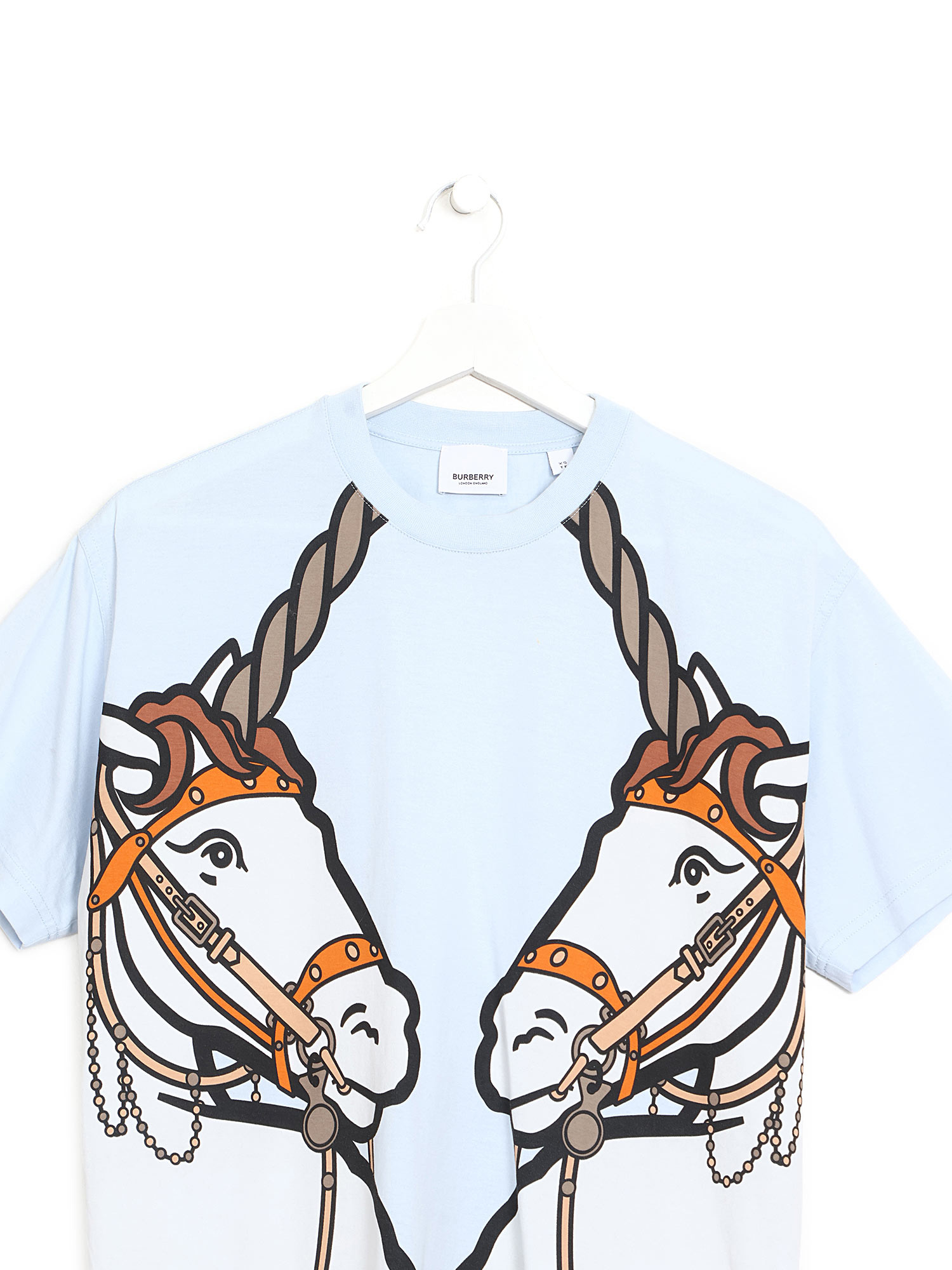 T-shirt à imprimé graphique de chevaux en bleu. Encolure ronde et manches courtes.