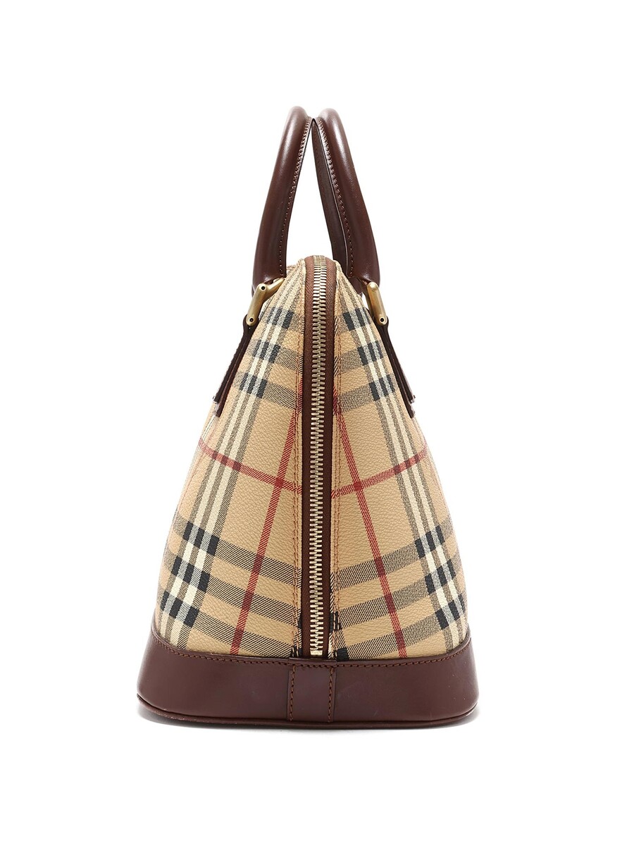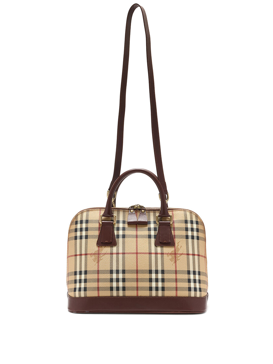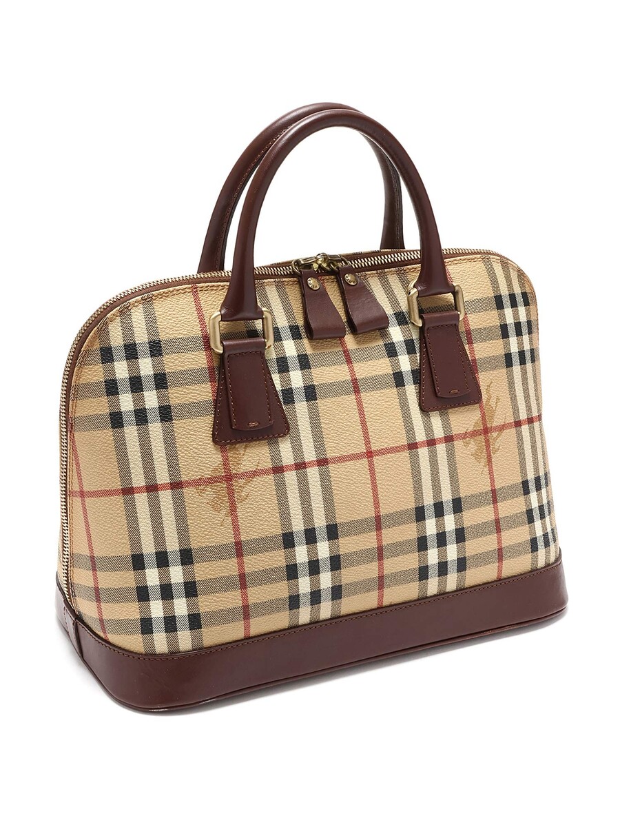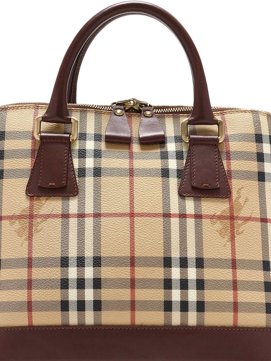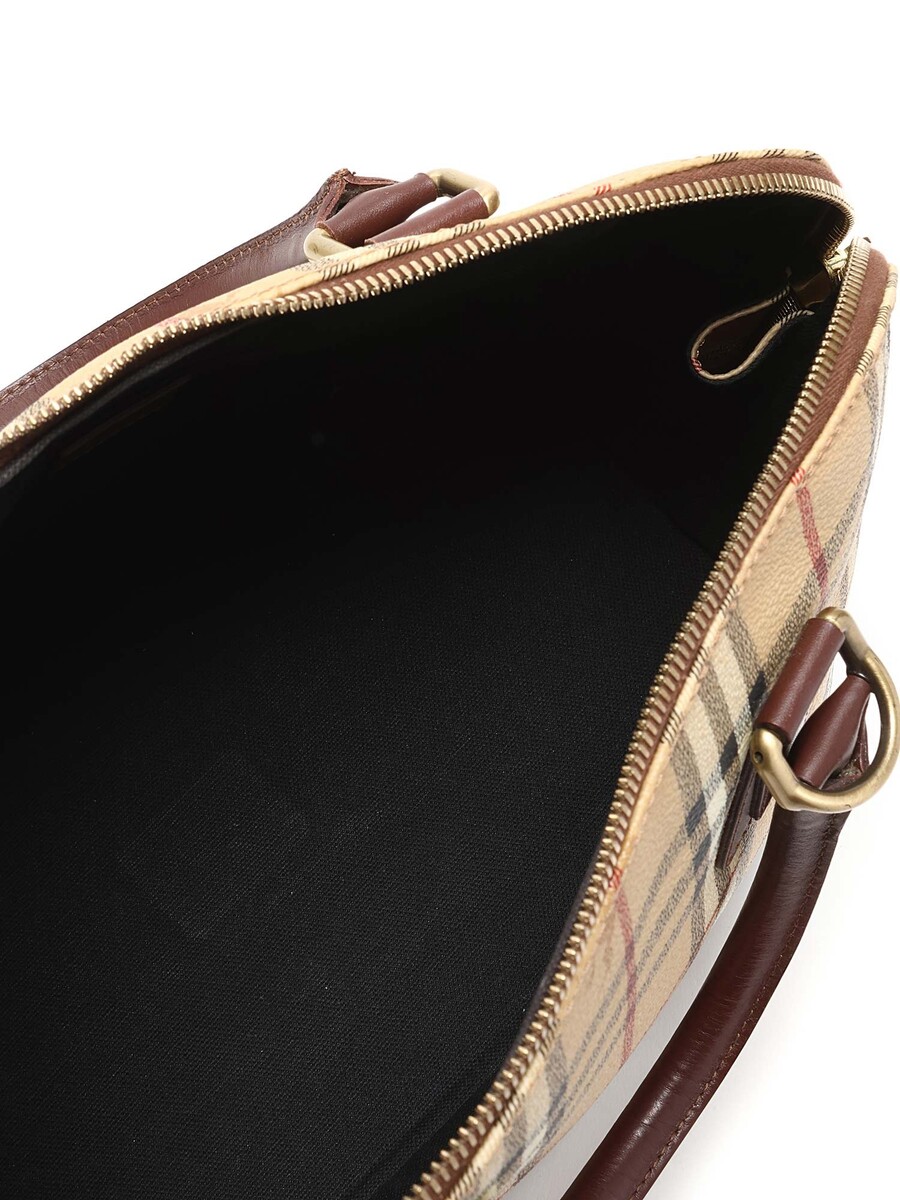 Sac cabas en toile enduite à motif à carreaux. Garniture de cuir brun. Fermeture à glissière avec cadenas. Deux poignées avec bandoulière ajustable.
