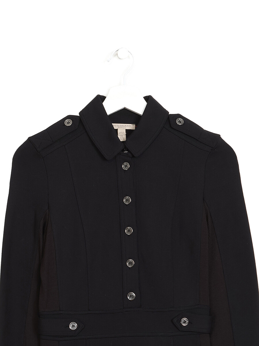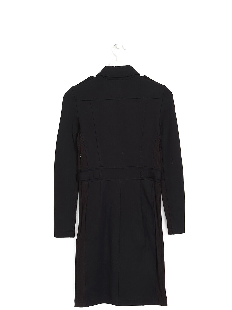 Robe mi-longue à manches longues avec boutonnage en noir. Col chemise. Fermeture à glissière sur le côté. Épaulettes.