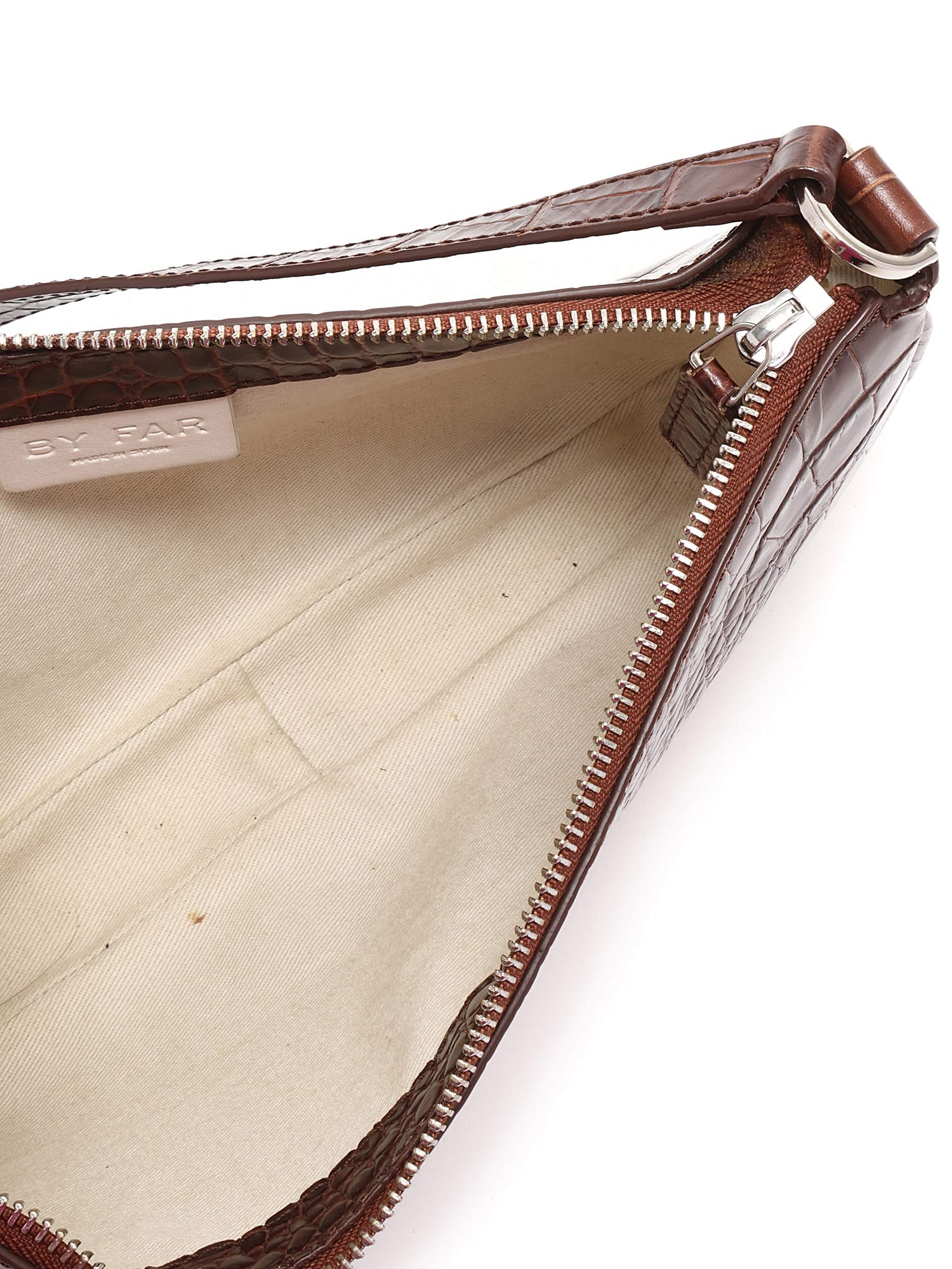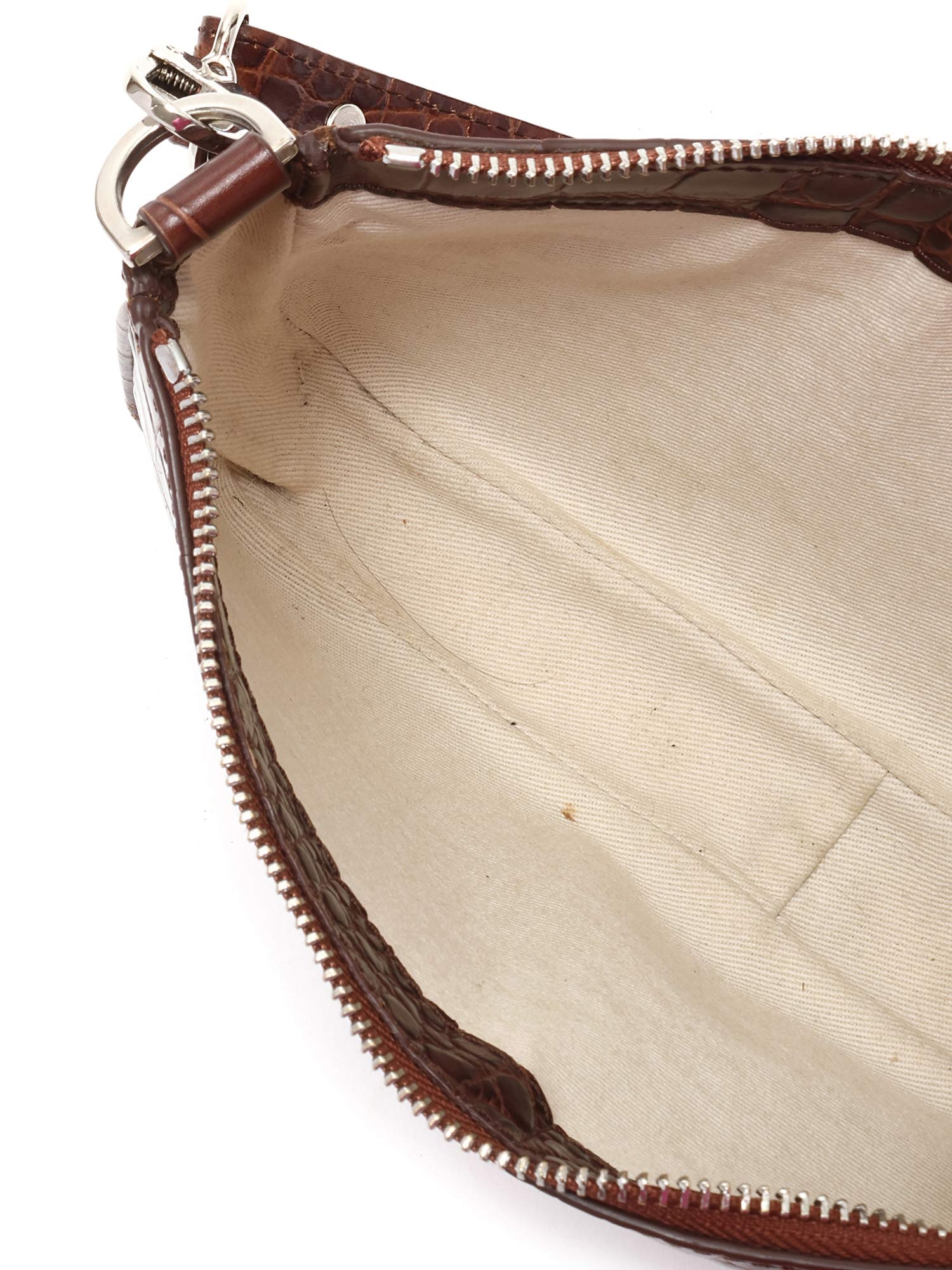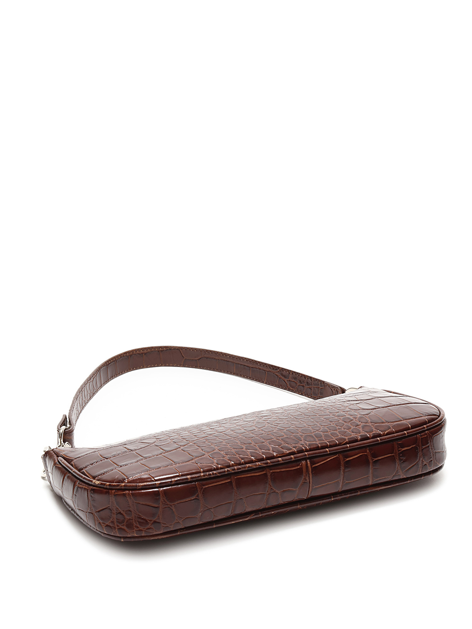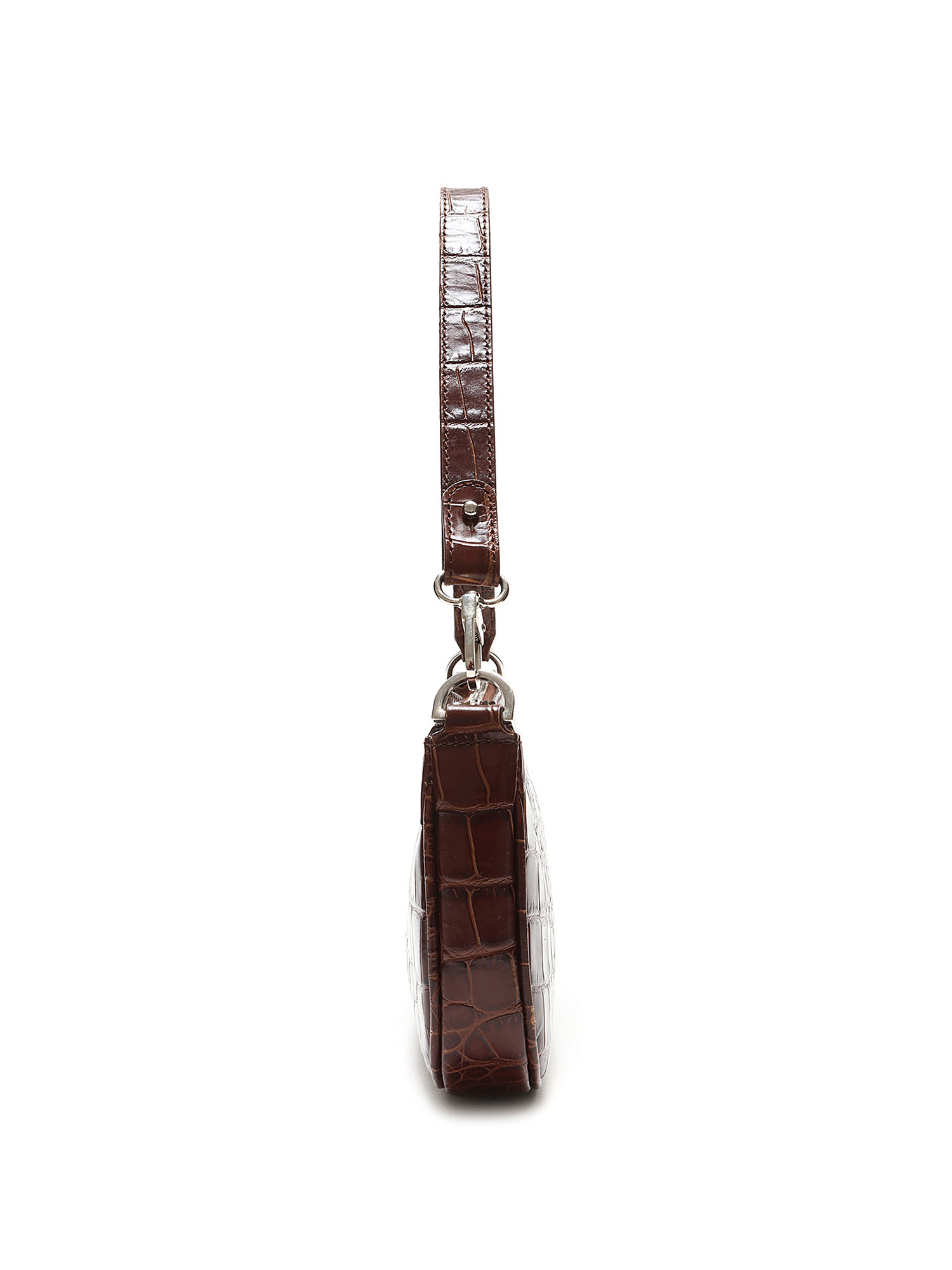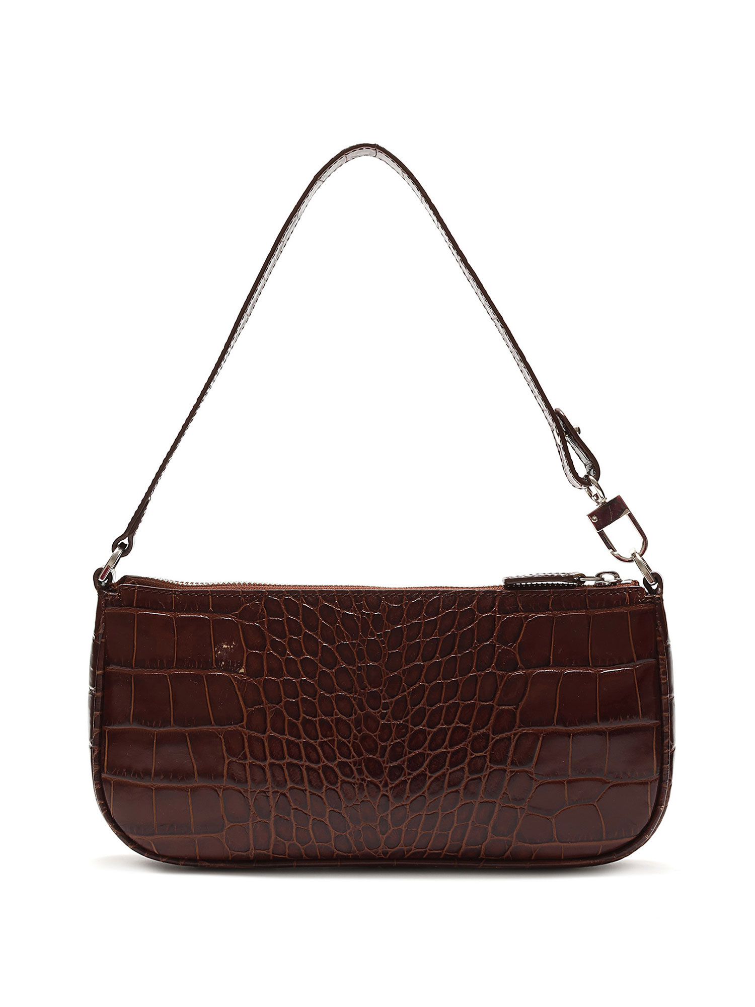Sac à l'épaule en cuir embossé effet crocodile en brun foncé. Fermeture à glissière. Bandoulière en cuir amovible. Ferrures argentées. Avec dustbag.