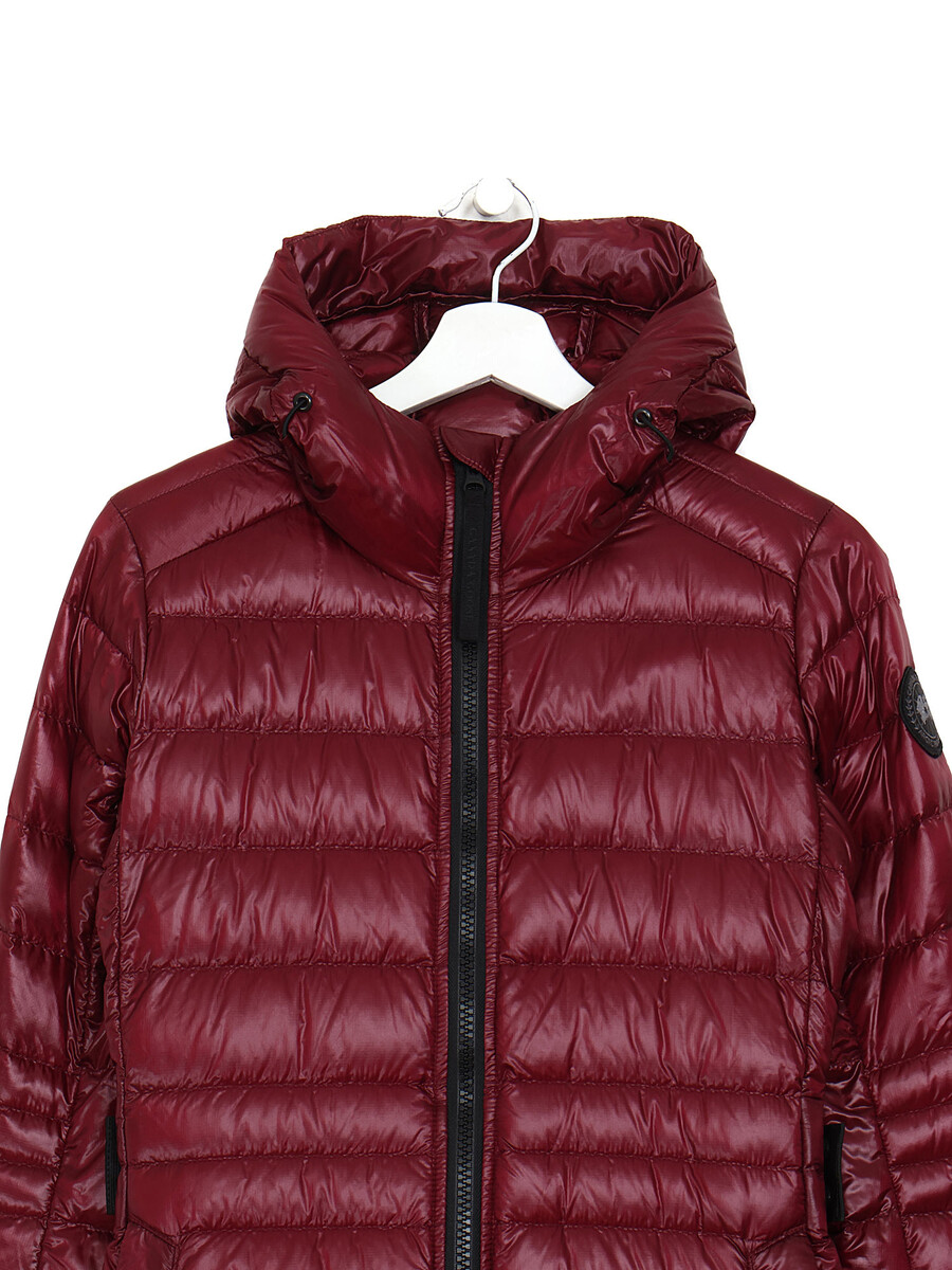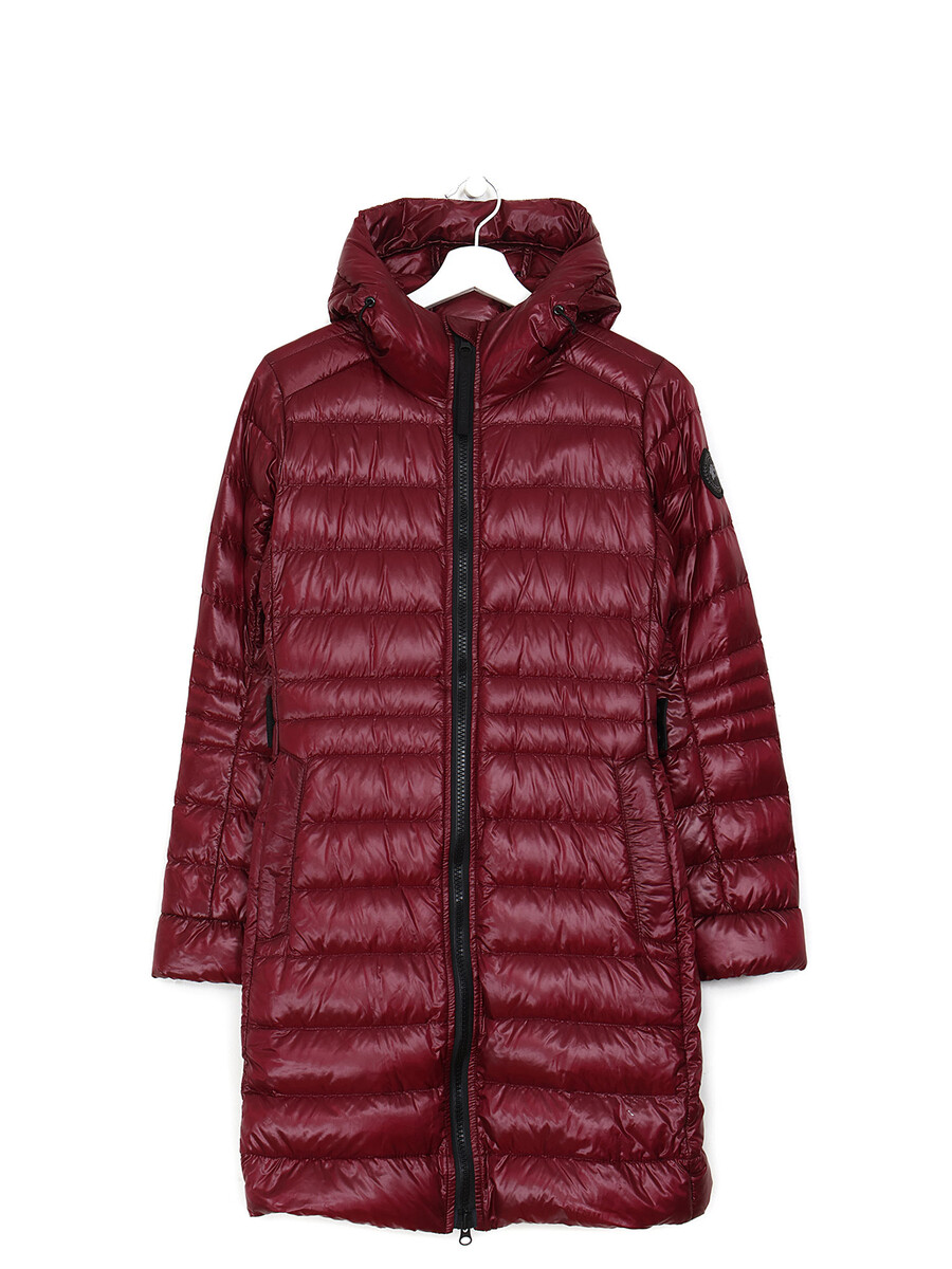 Veste matelassée mi-longue et compressible en bordeaux. Fermeture à glissière à l'avant. Écusson noir avec logo sur la manche. Deux poches avant. Fente à l'arrière.
