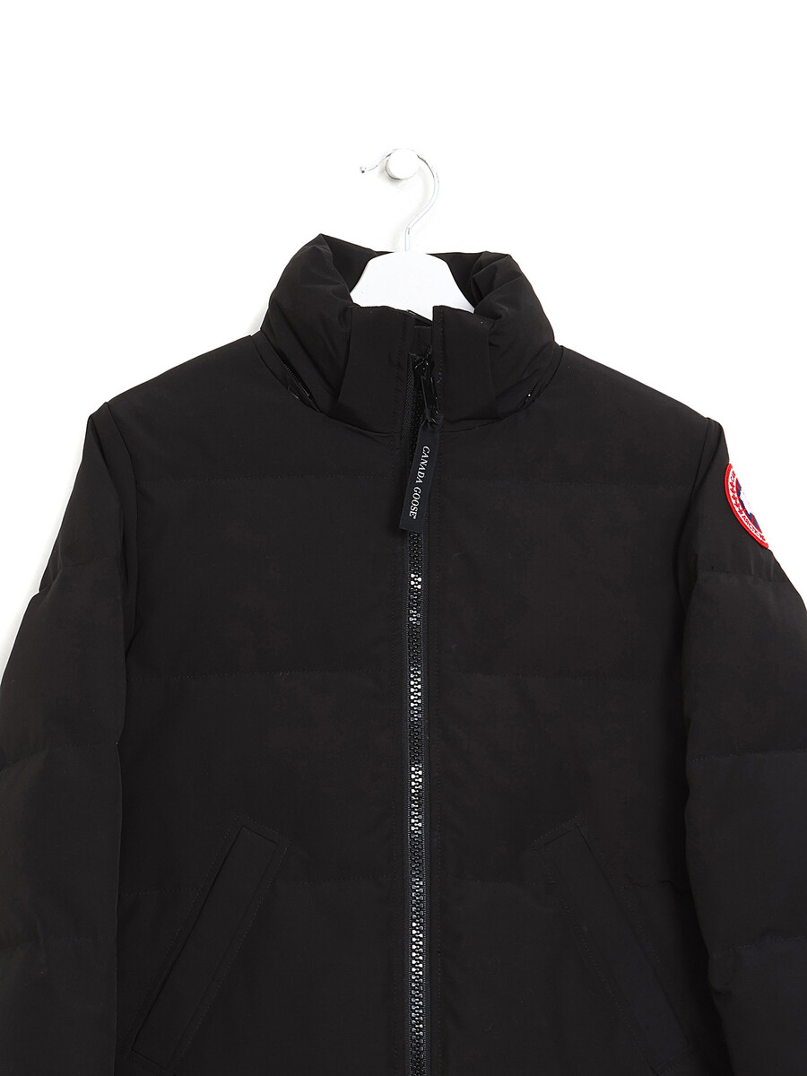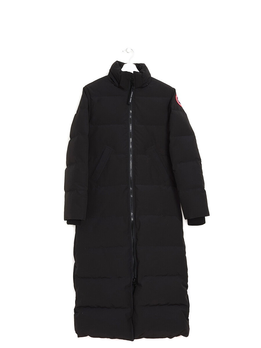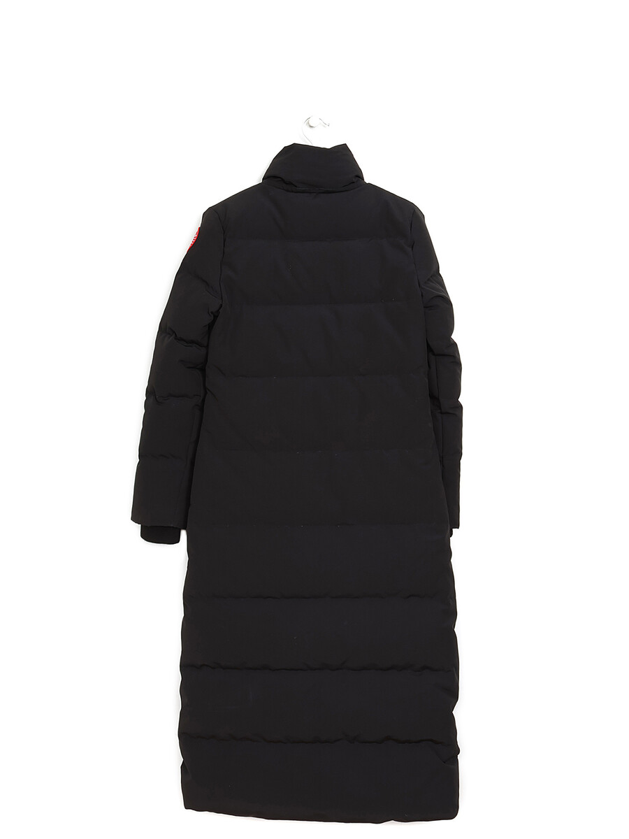 Manteau style parka rembourré de duvet en noir. Fermeture éclair à l’avant. Poches plaquées avec rabat. Avec housse.