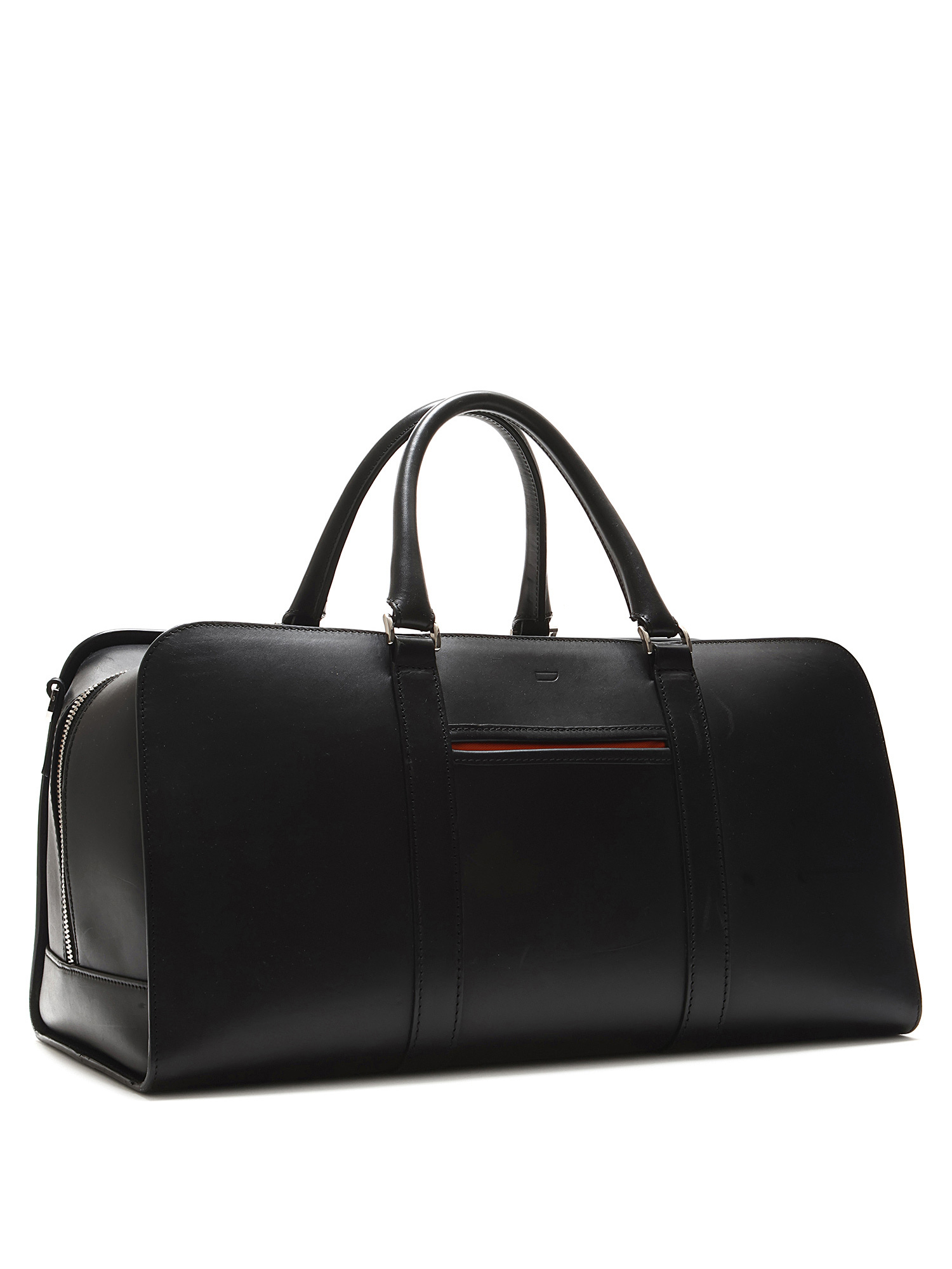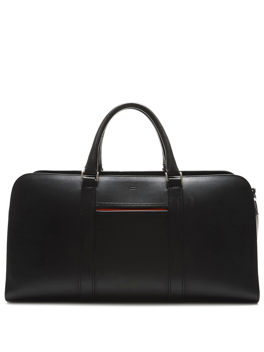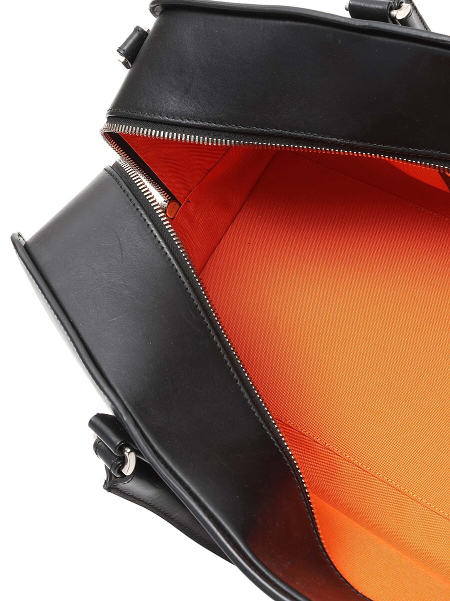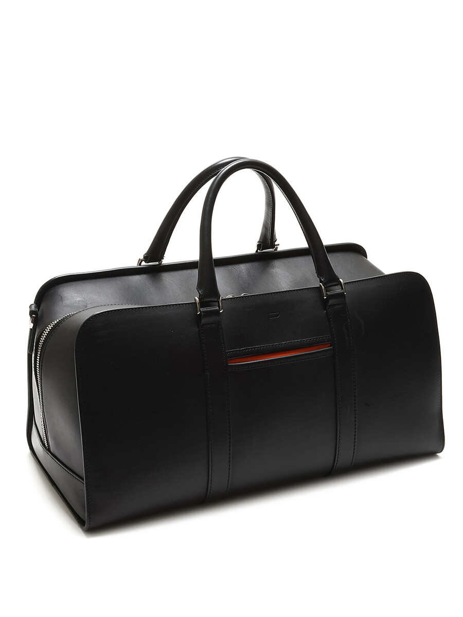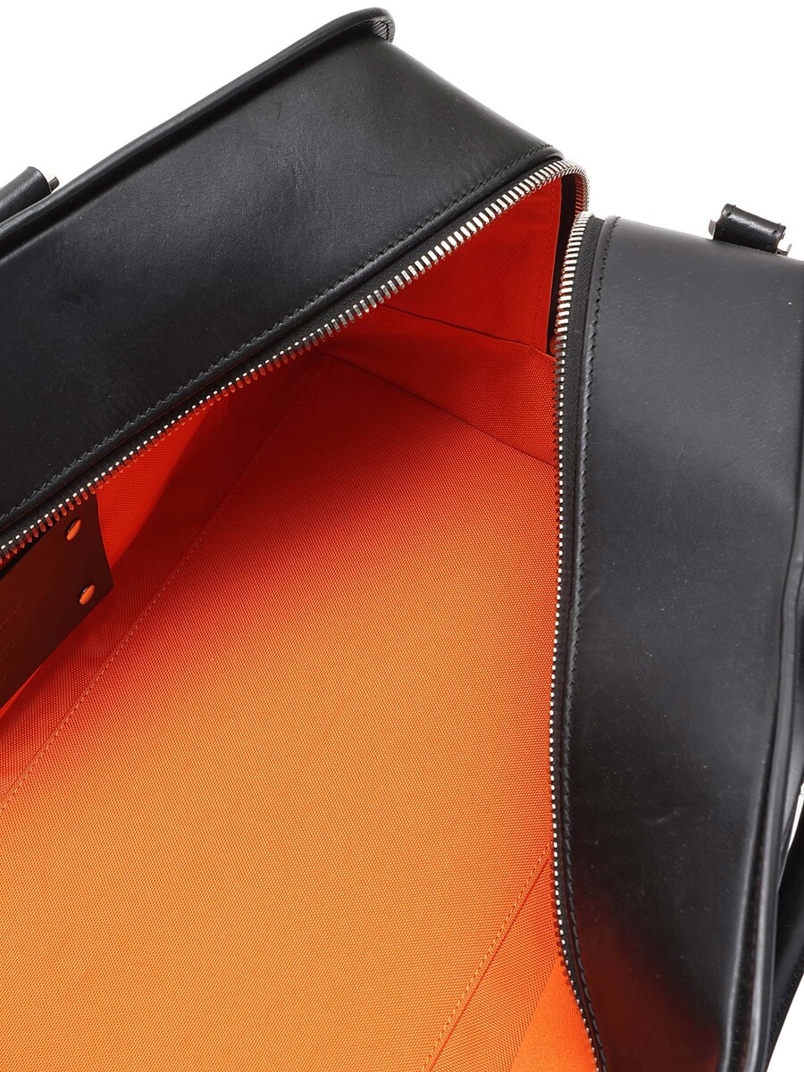 Sac de voyage en cuir structuré noir avec doublure contrastante orange. Fermeture à glissière, poignées en cuir doubles et ferrures argentées. Quatre pieds protecteurs en métal au fond.