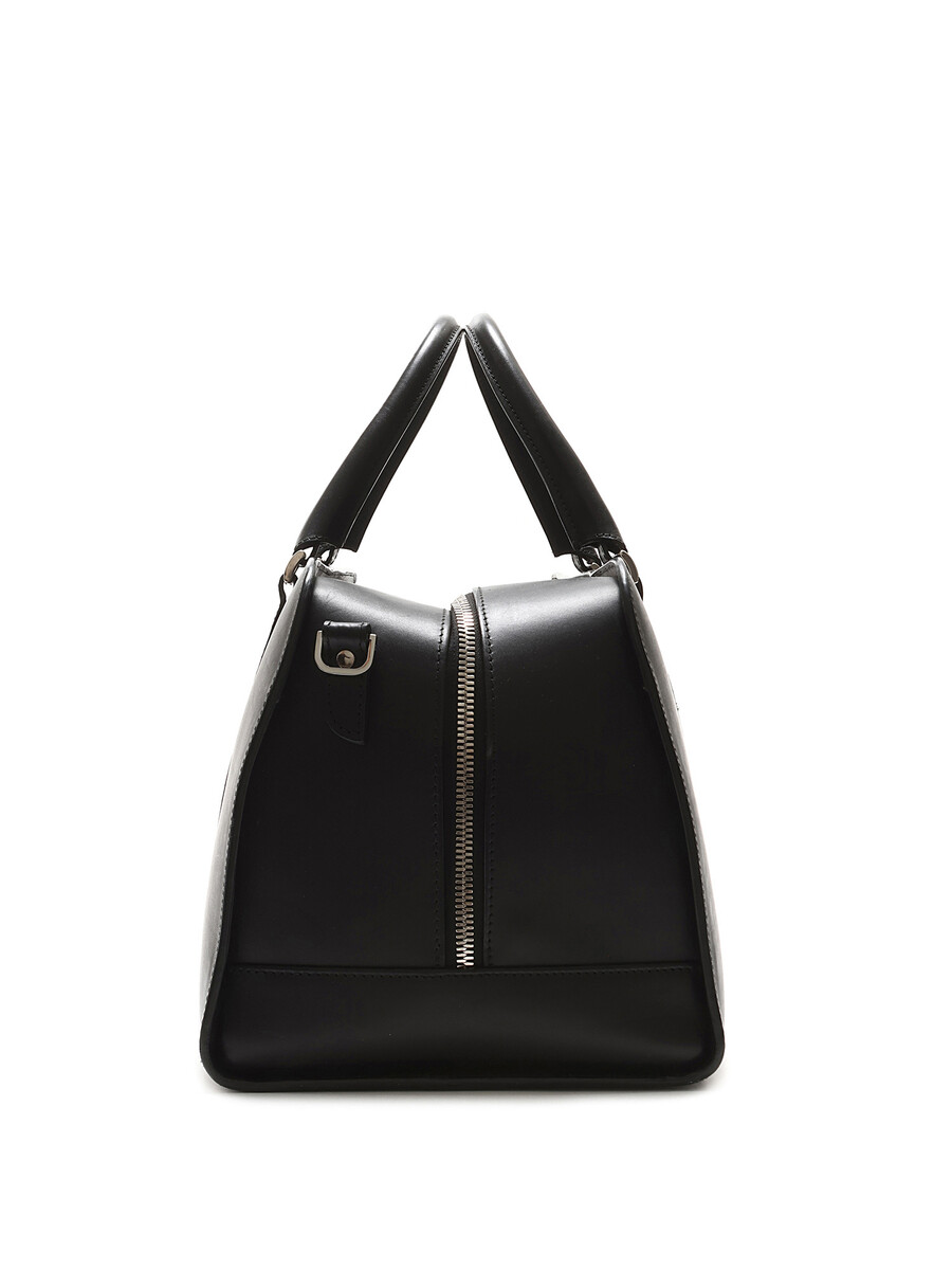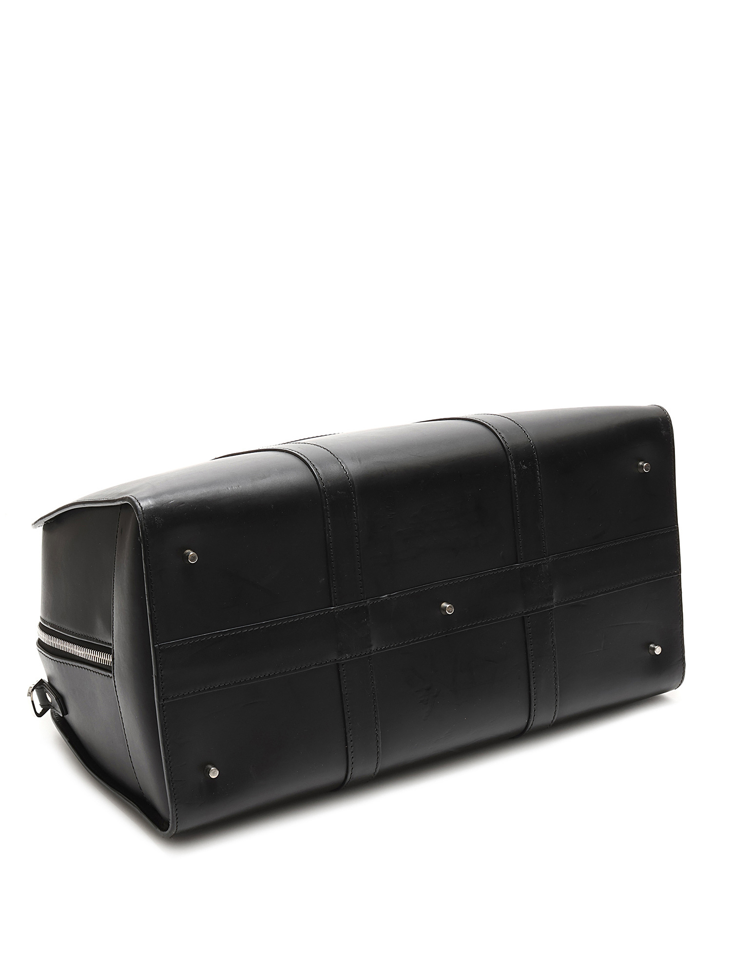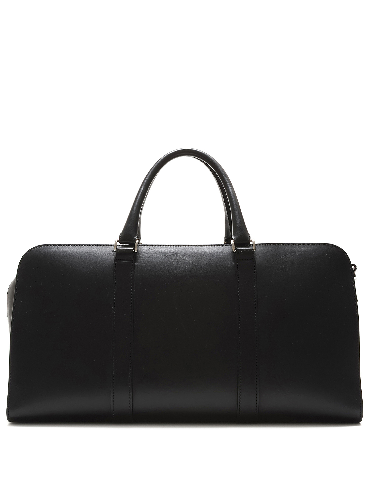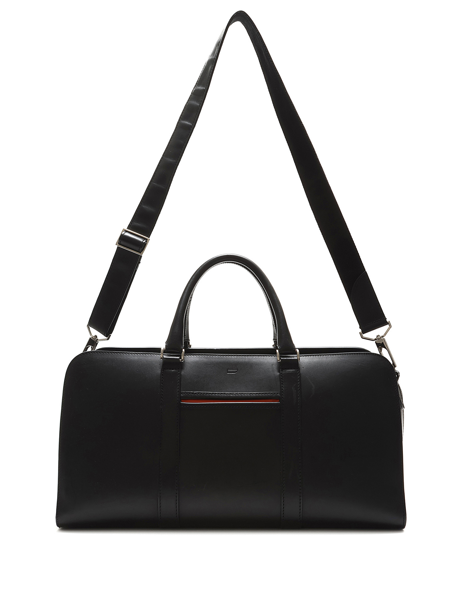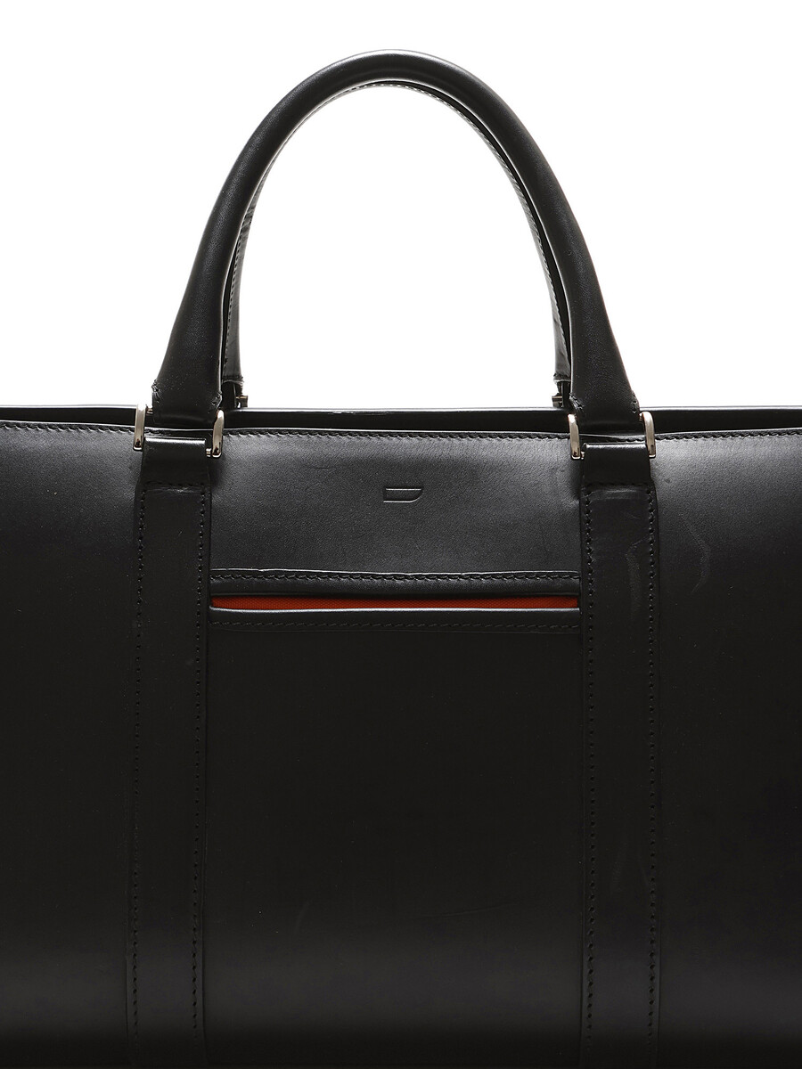 Sac de voyage en cuir structuré noir avec doublure contrastante orange. Fermeture à glissière, poignées en cuir doubles et ferrures argentées. Quatre pieds protecteurs en métal au fond.