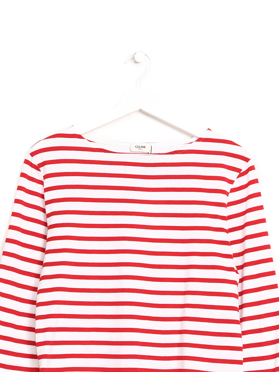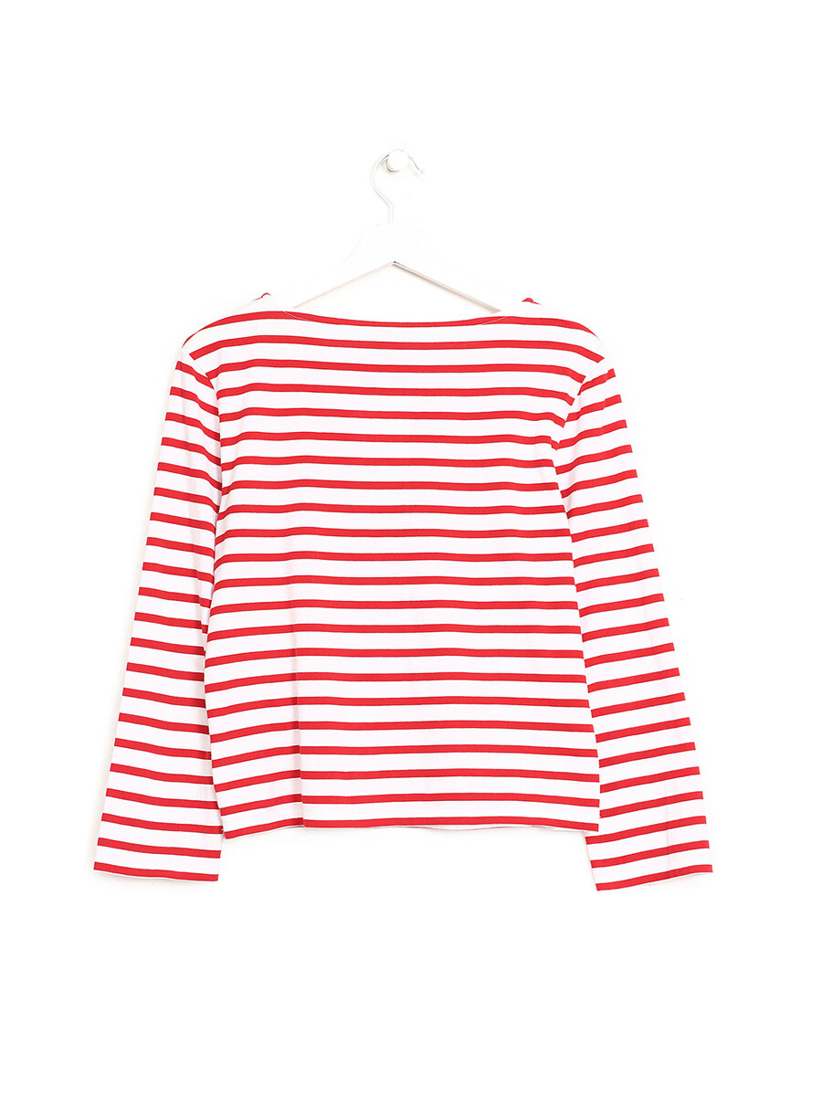 Haut à manches longues rayé en rouge et blanc. Encolure arrondie.