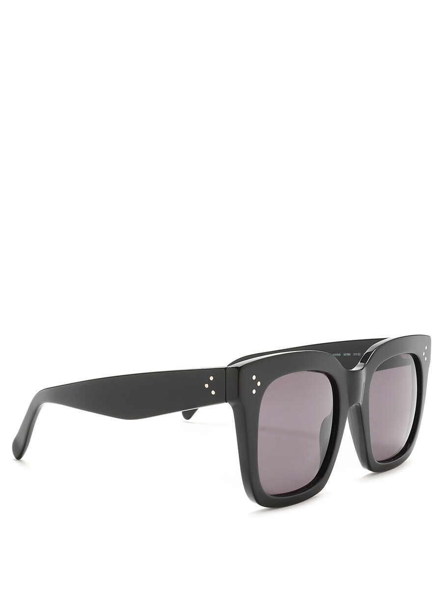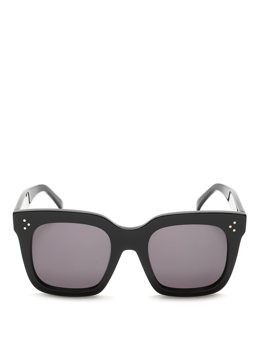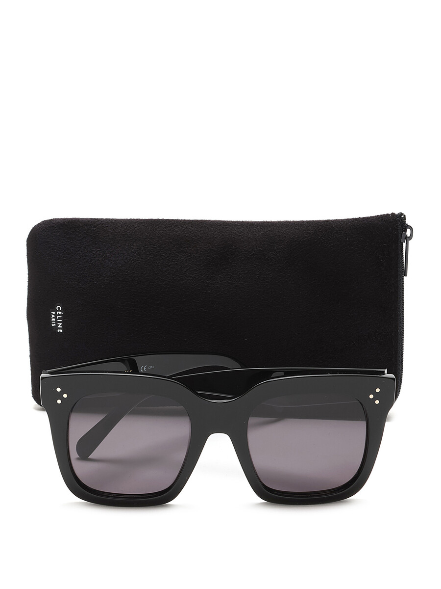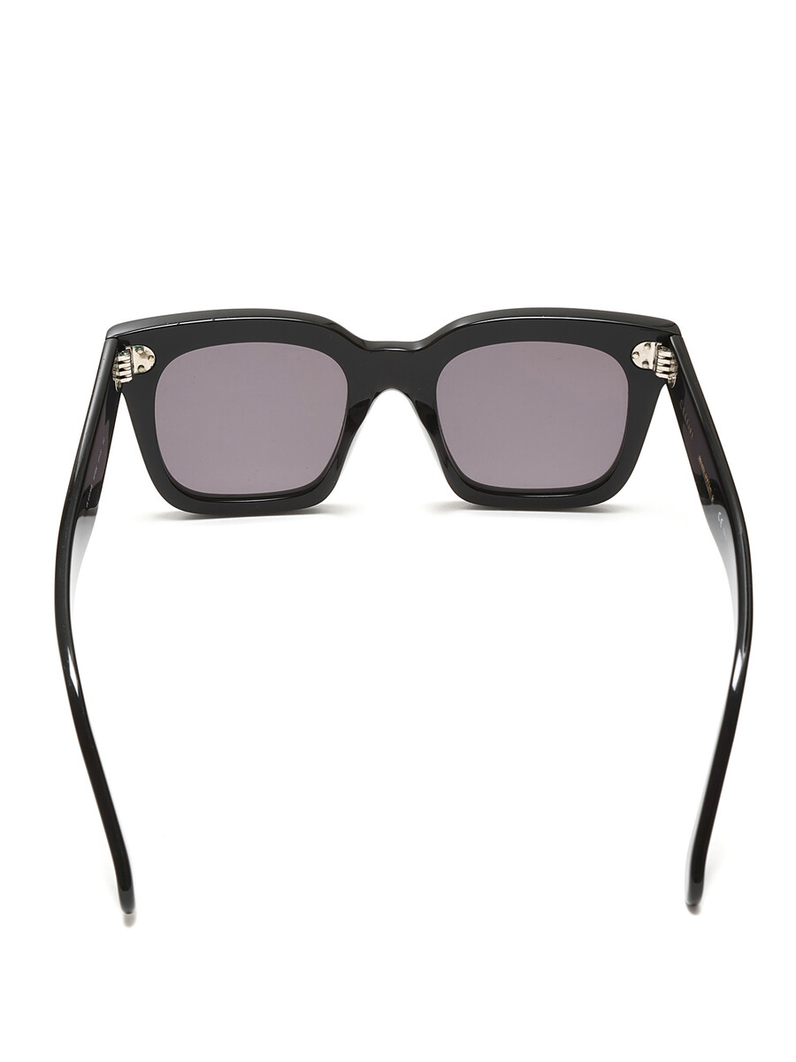 Lunettes de soleil en acétate noir à forme carrée avec des verres gris. Ferrures argentées. Fournies avec un étui souple.