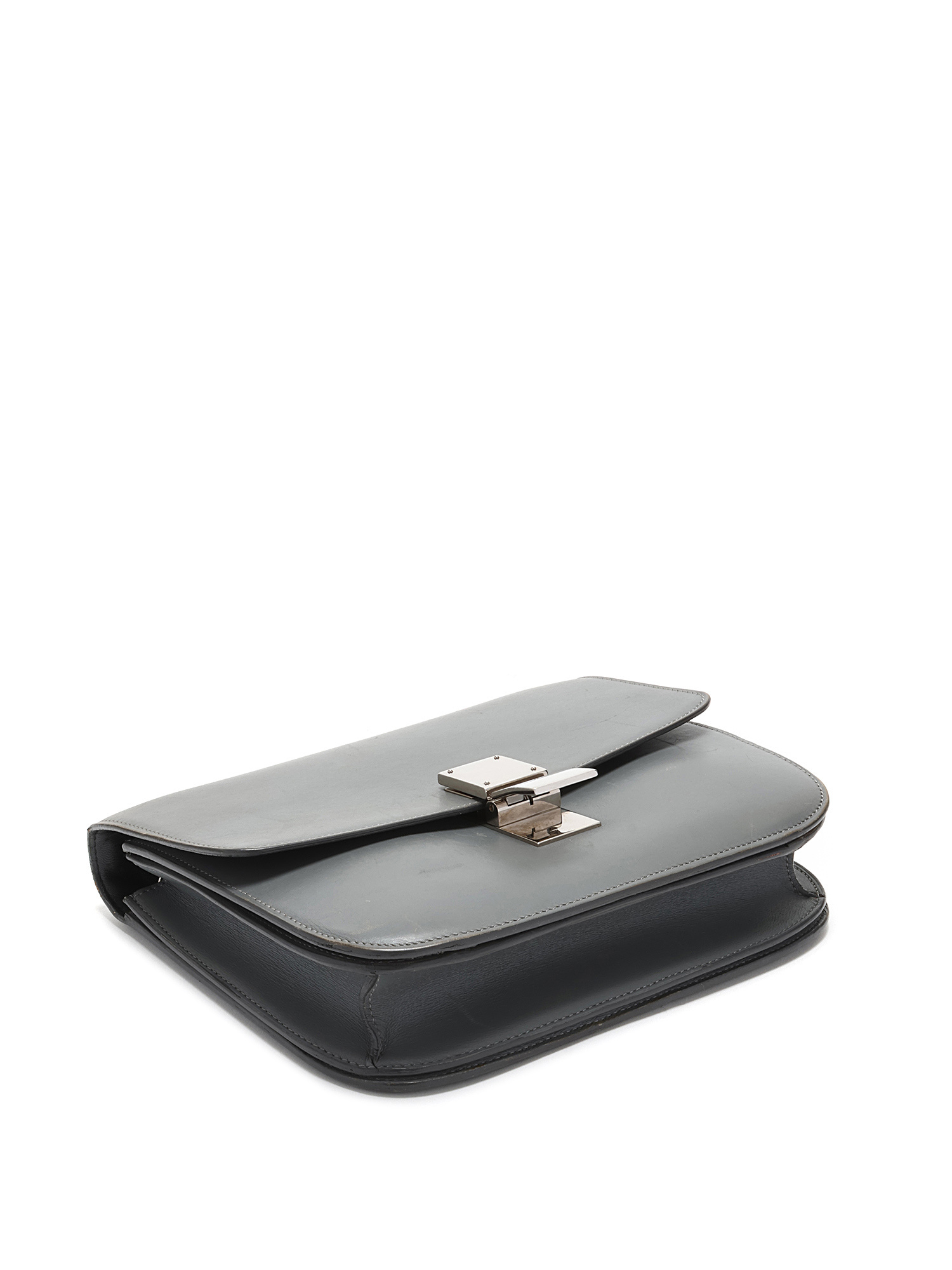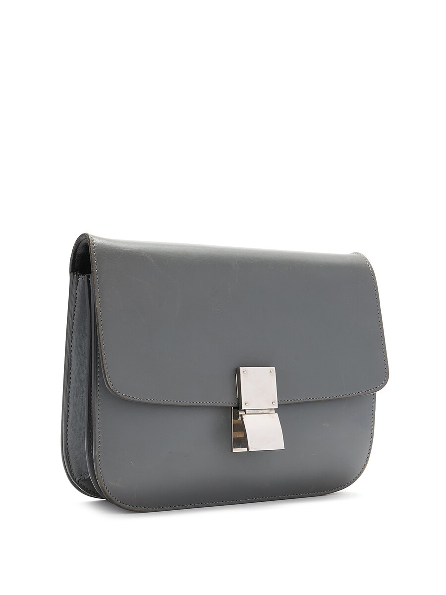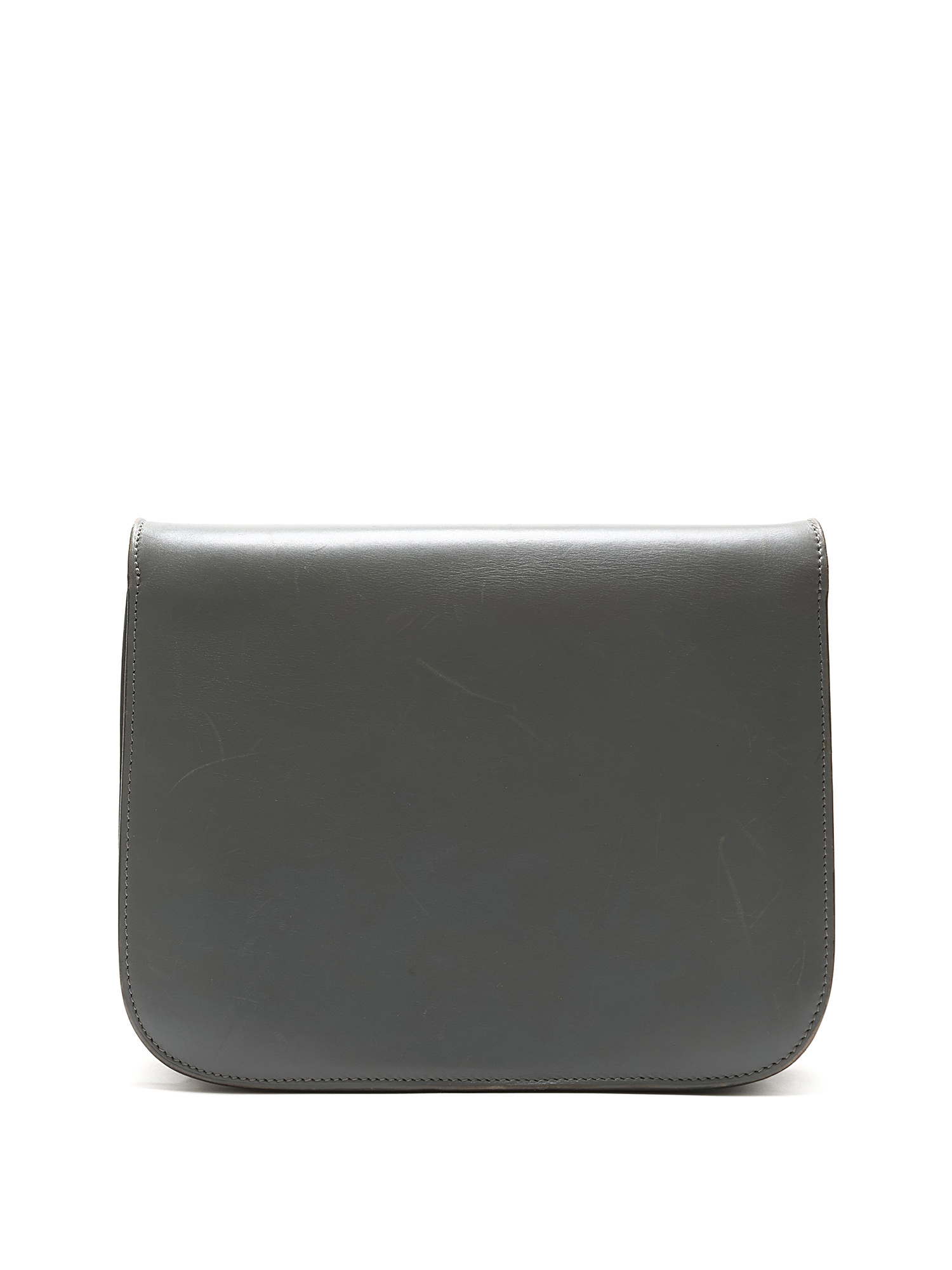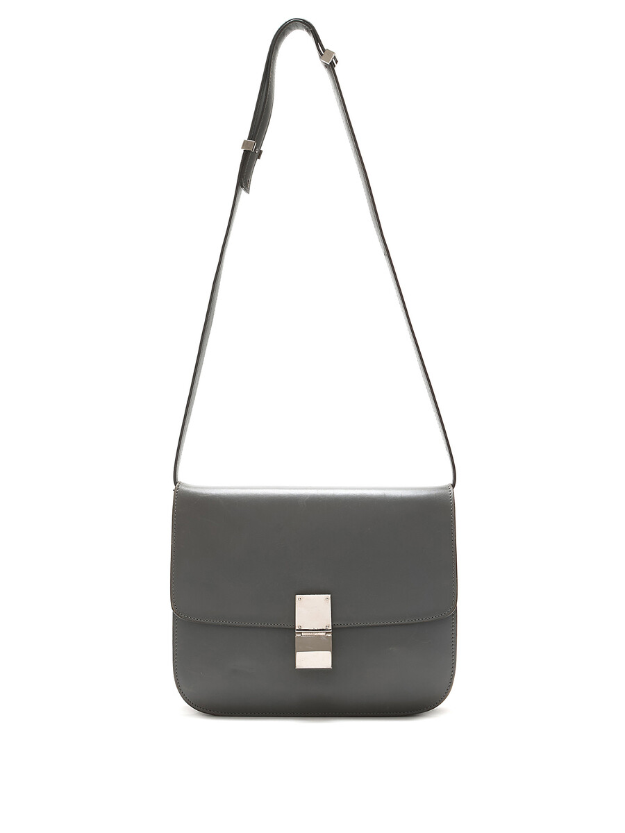 Sac à bandoulière en cuir de design minimaliste en gris. Fermeture à fermoir en métal. Bandoulière en cuir ajustable. Ferrures argentées.