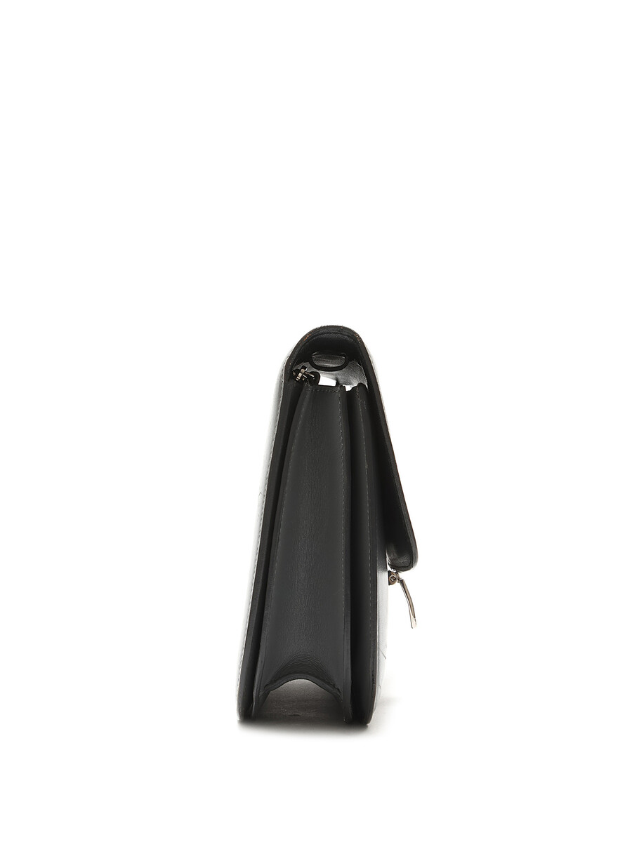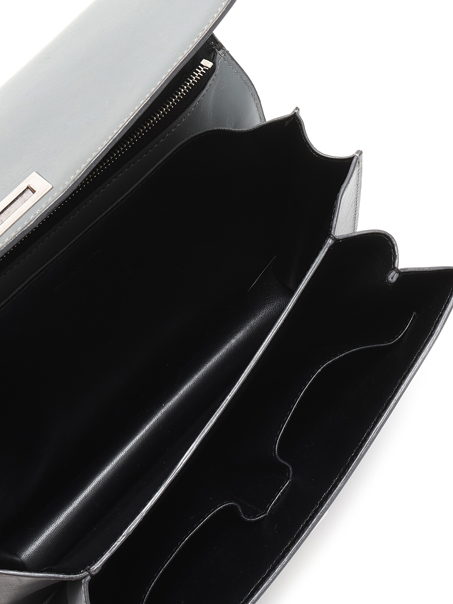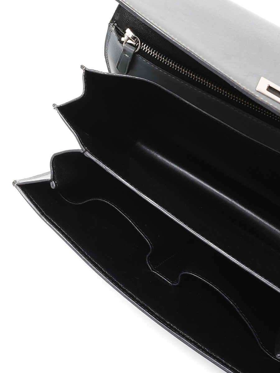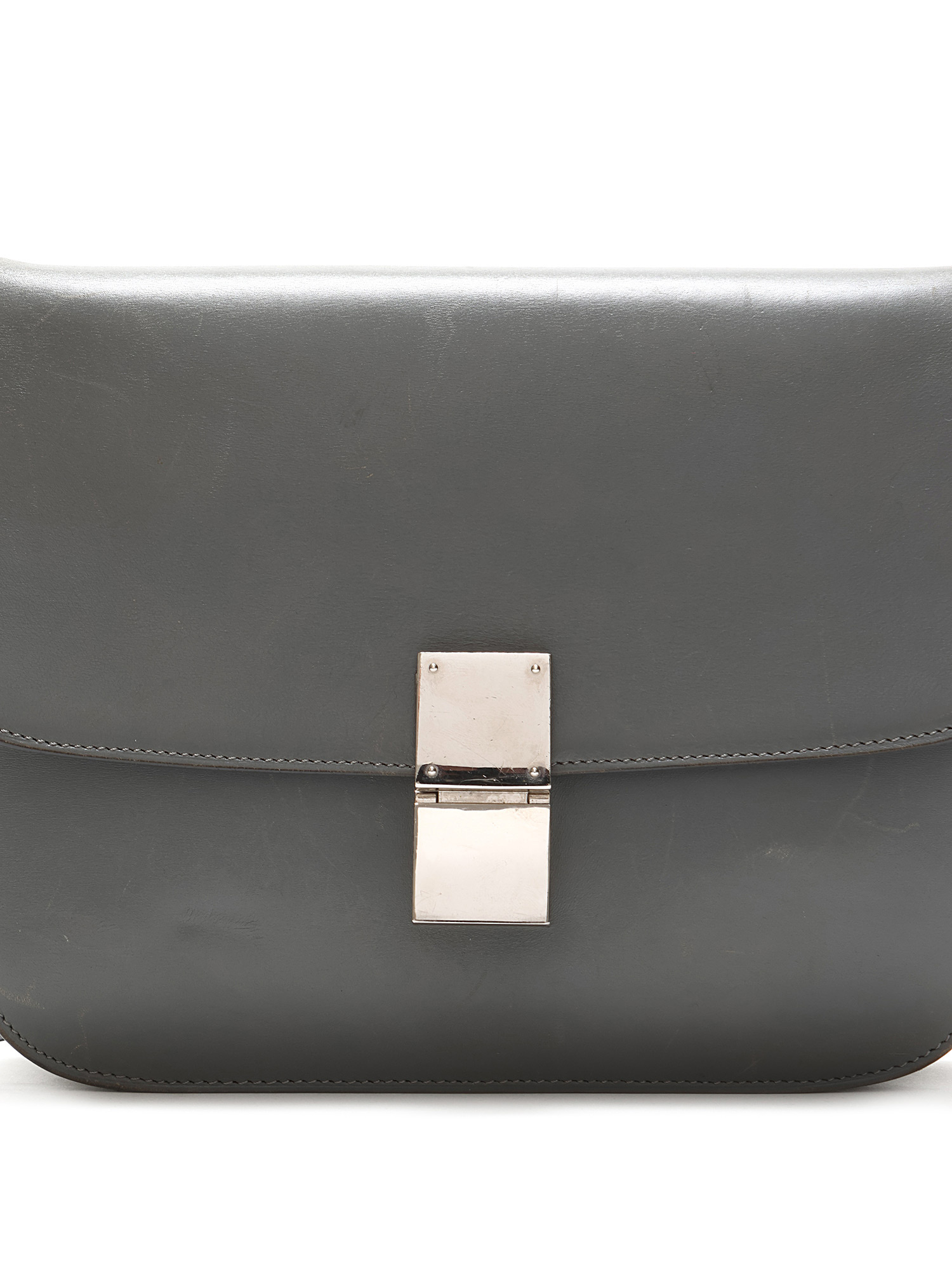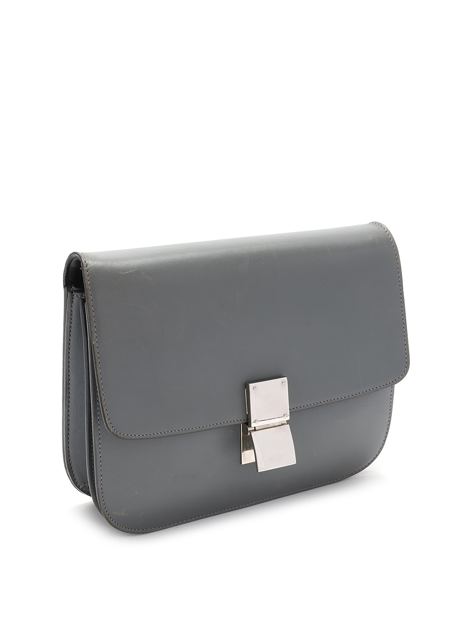 Sac à bandoulière en cuir de design minimaliste en gris. Fermeture à fermoir en métal. Bandoulière en cuir ajustable. Ferrures argentées.