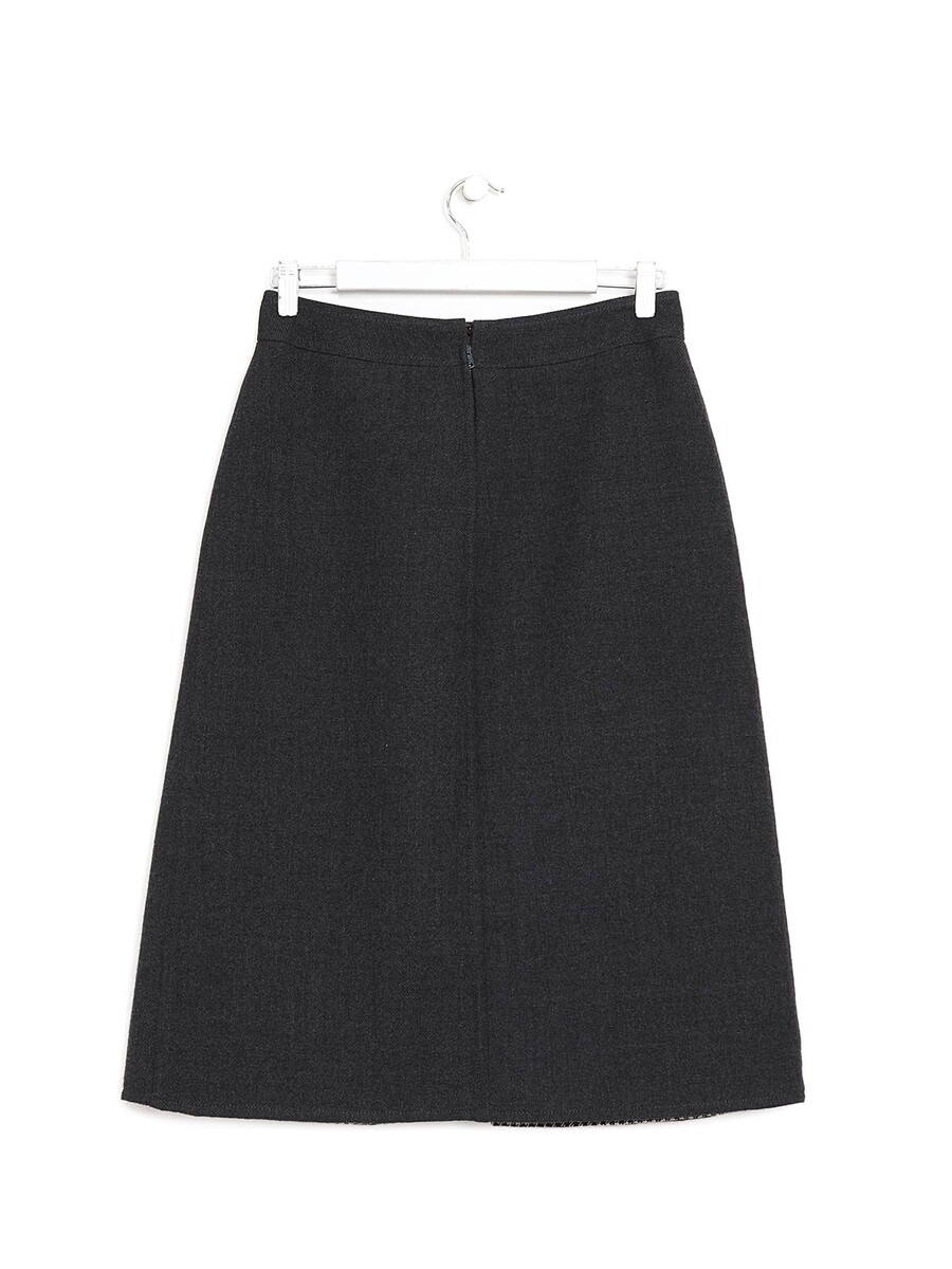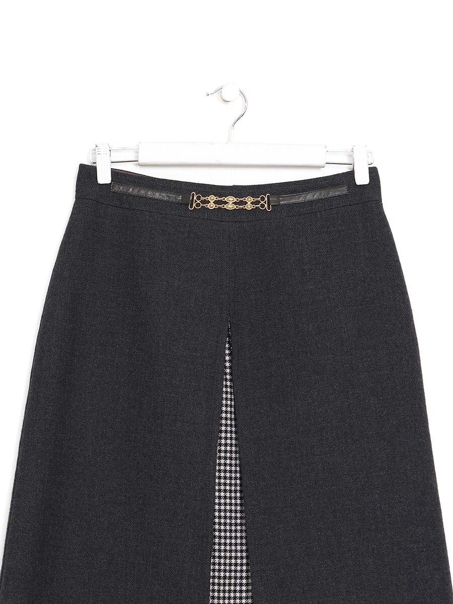 Jupe mi-longue en laine grise avec un motif pied de poule noir et blanc. Fermeture éclair et ferrures en métal doré.