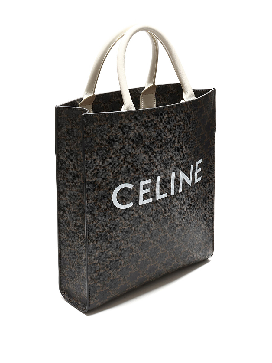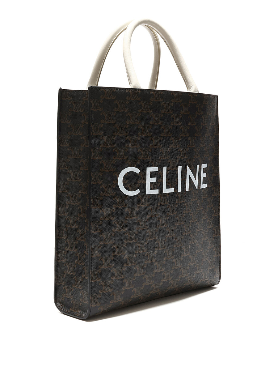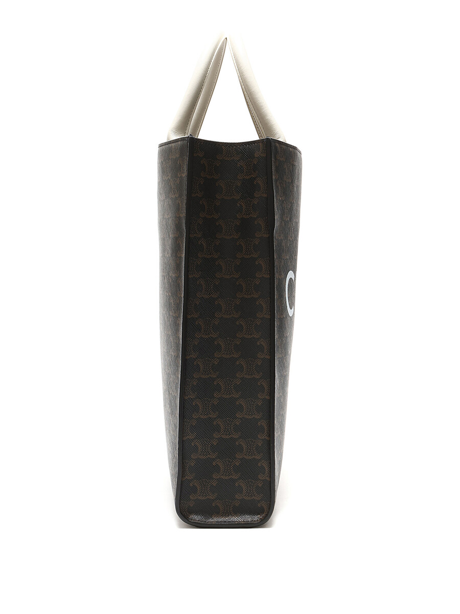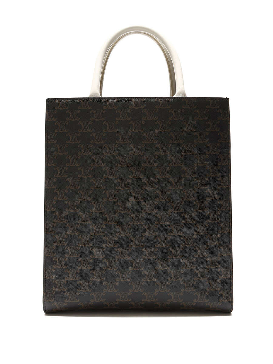 Petit cabas vertical en toile enduite avec motif Triomphe emblématique en brun et blanc. Haut ouvert avec anses cousues et garnitures en cuir. Avec dust bag.