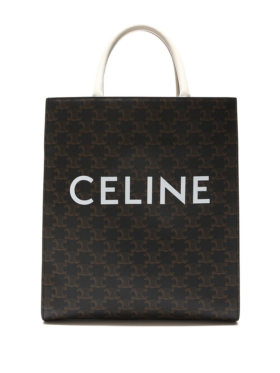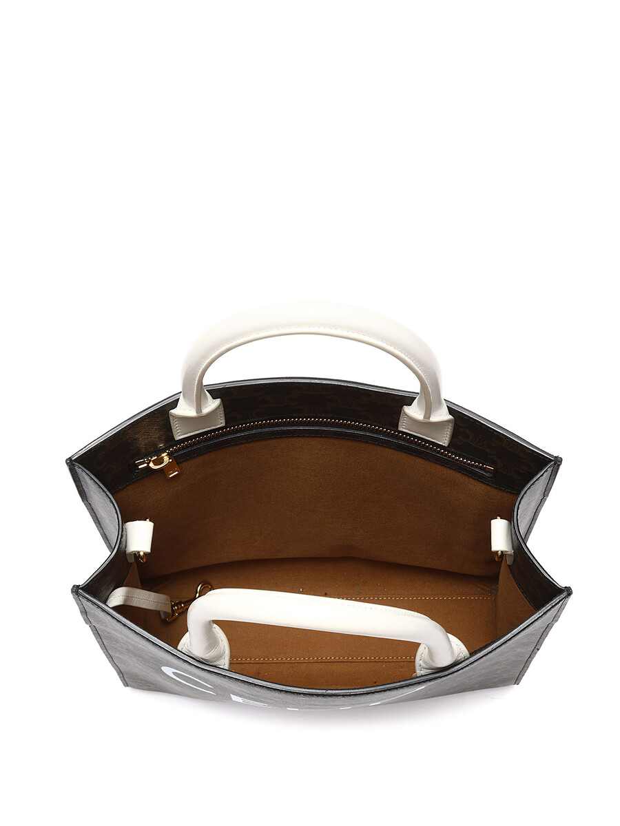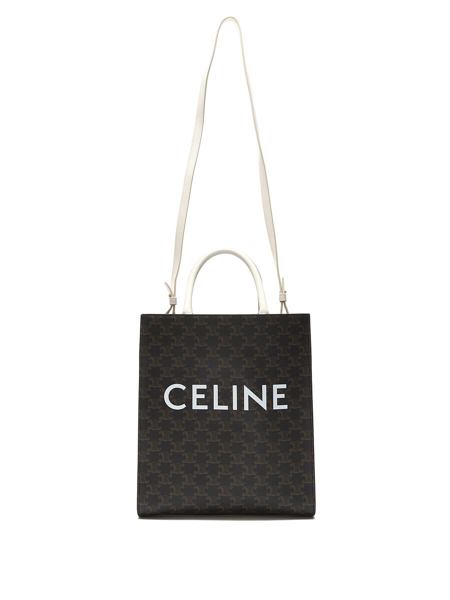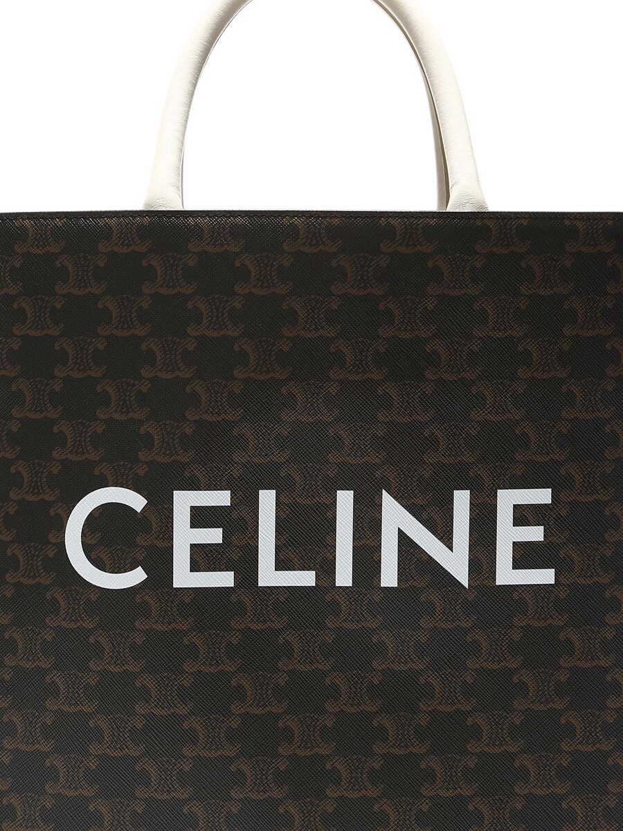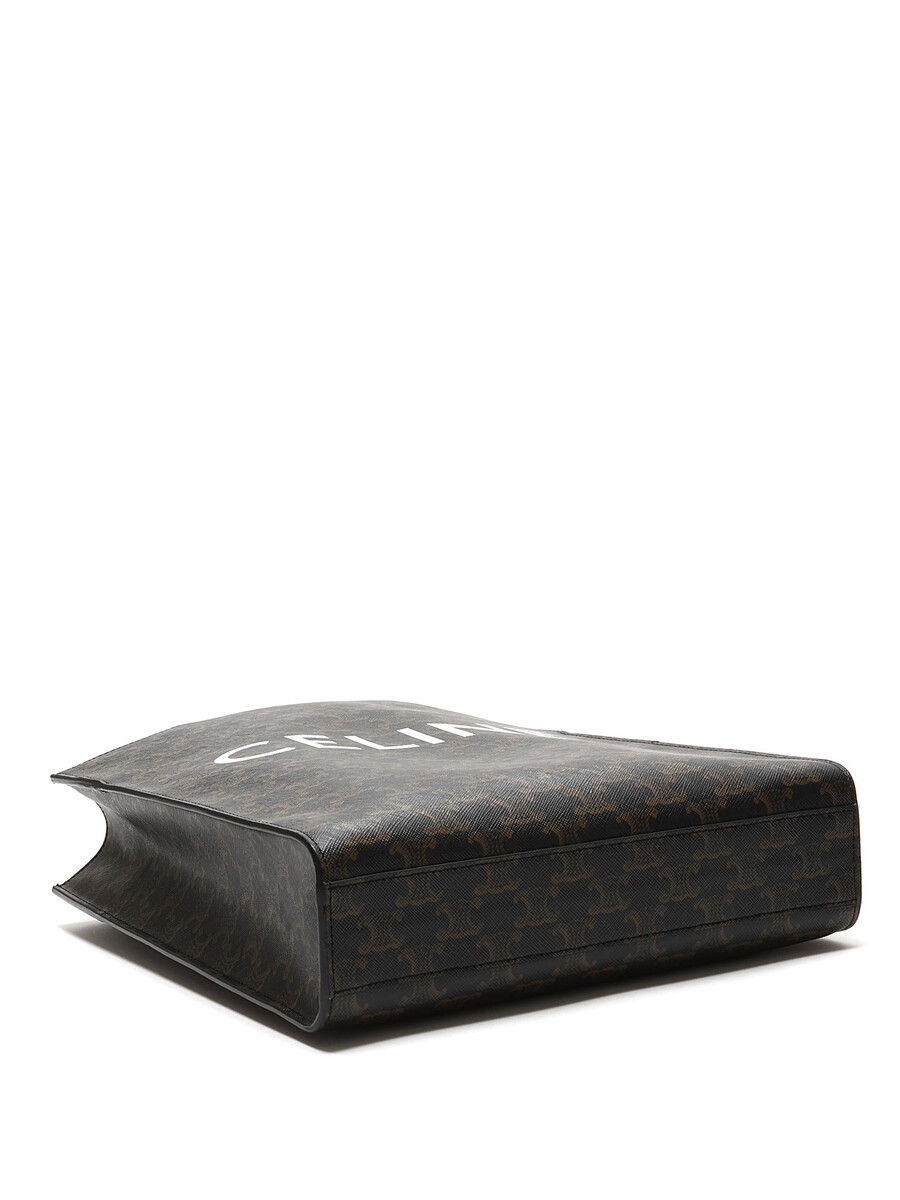 Petit cabas vertical en toile enduite avec motif Triomphe emblématique en brun et blanc. Haut ouvert avec anses cousues et garnitures en cuir. Avec dust bag.