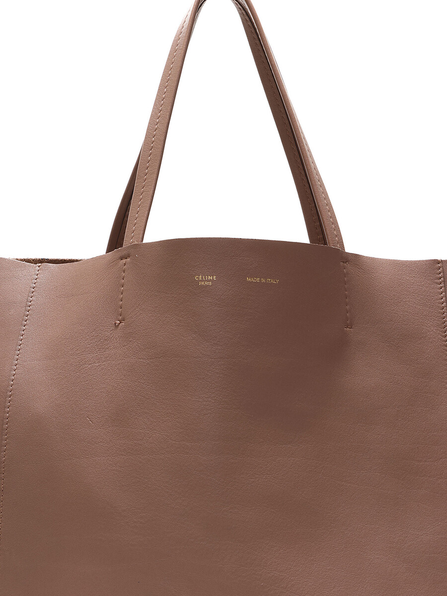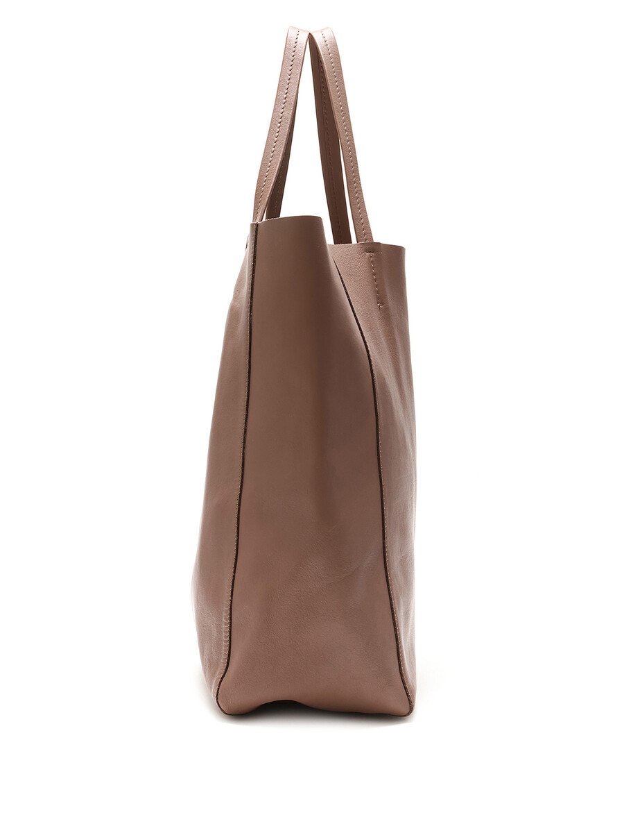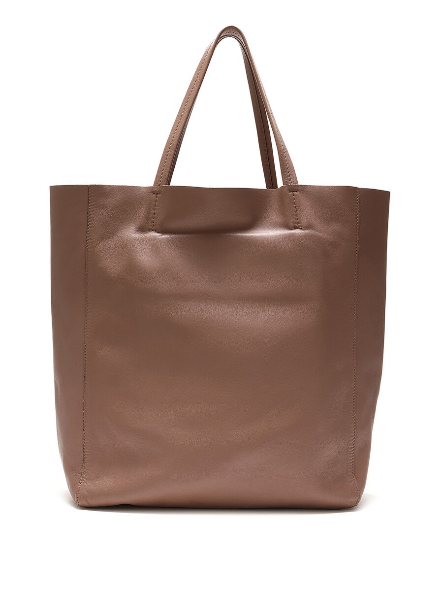 Cabas en cuir taupe. Ouverture supérieure ouverte avec sangles en cuir. Coutures ton sur ton. Intérieur spacieux.