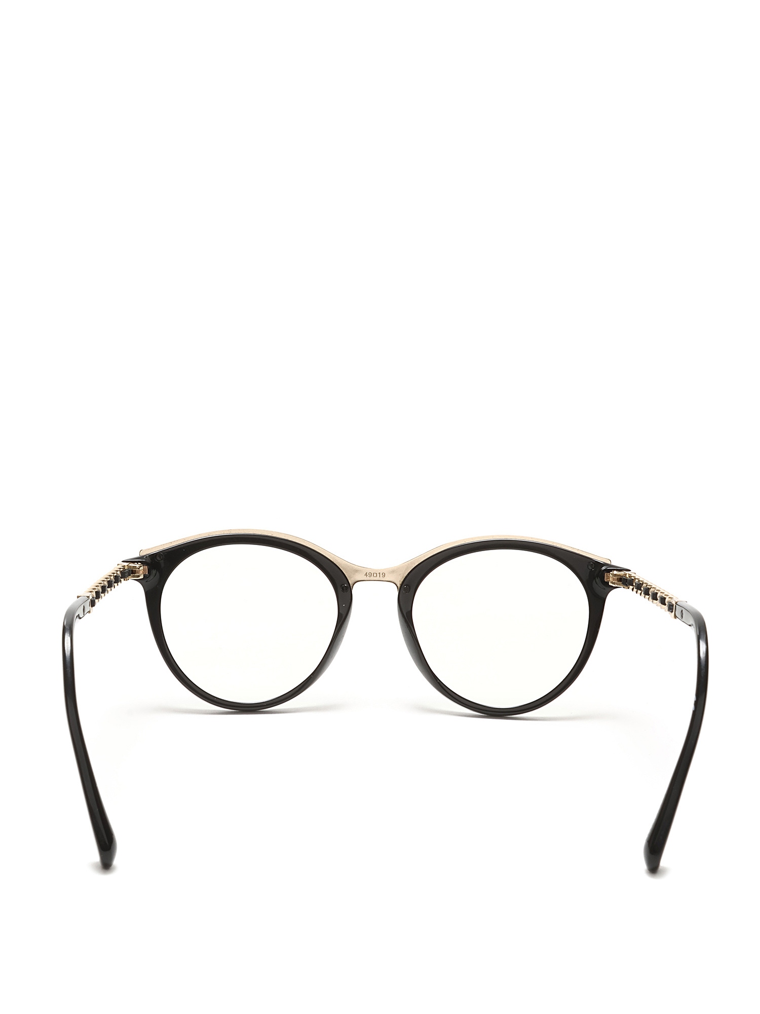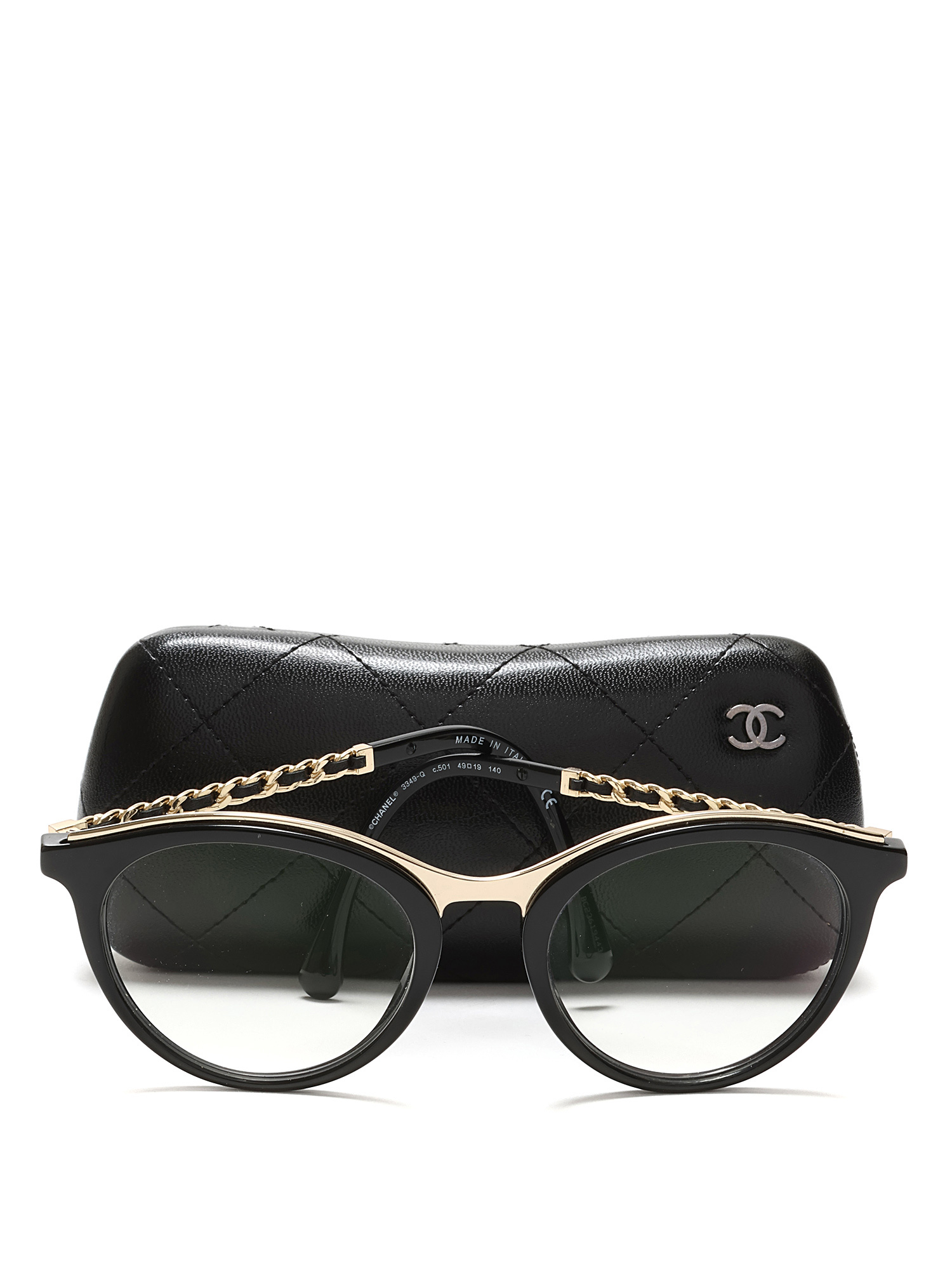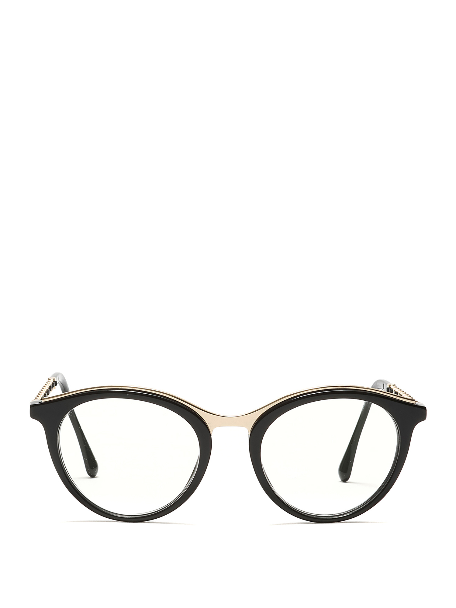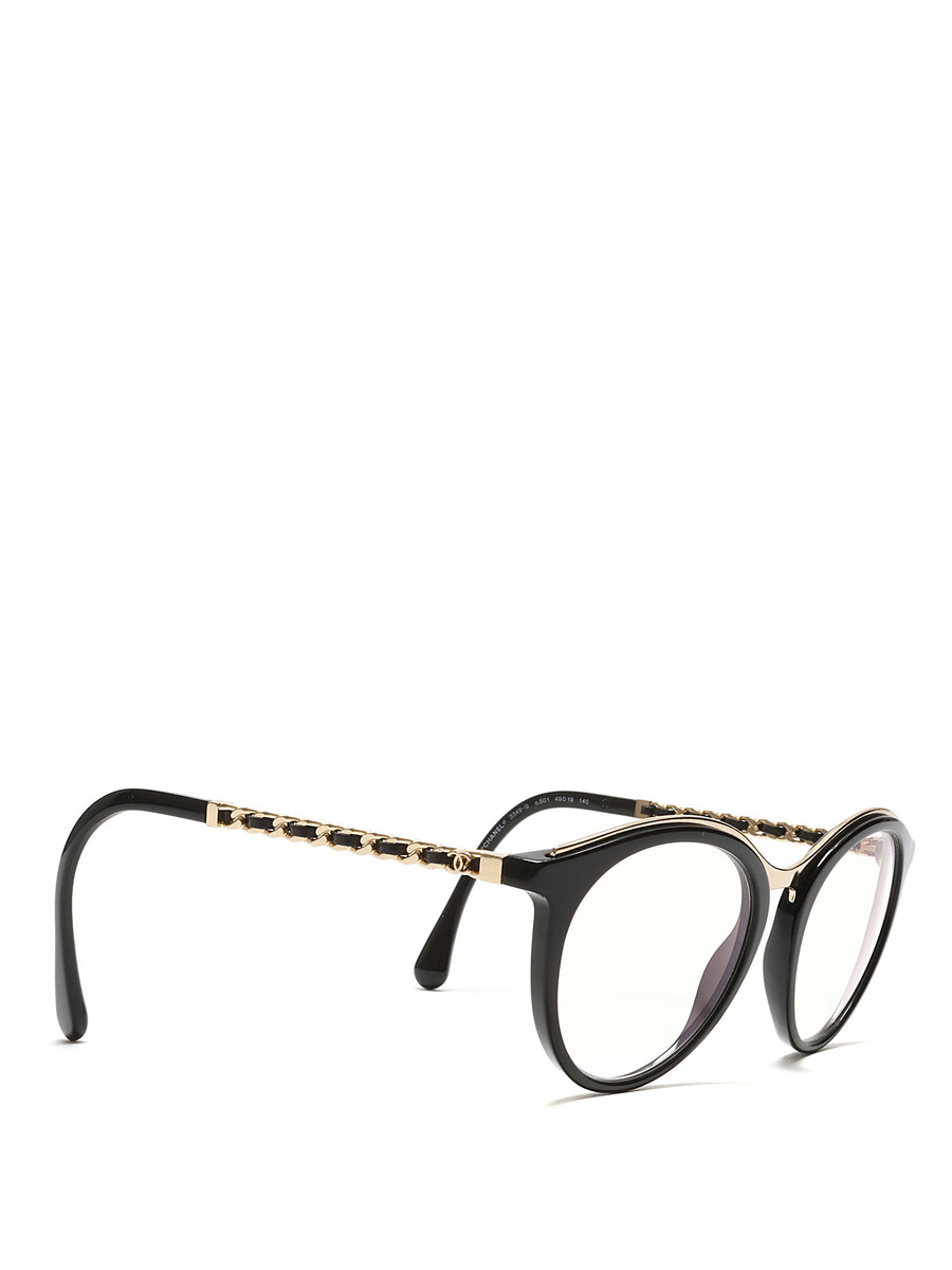 Lunettes en acétate avec détails tressés, dotées de montures noires et d'accents en métal doré. Élégance classique de Chanel avec une touche moderne.