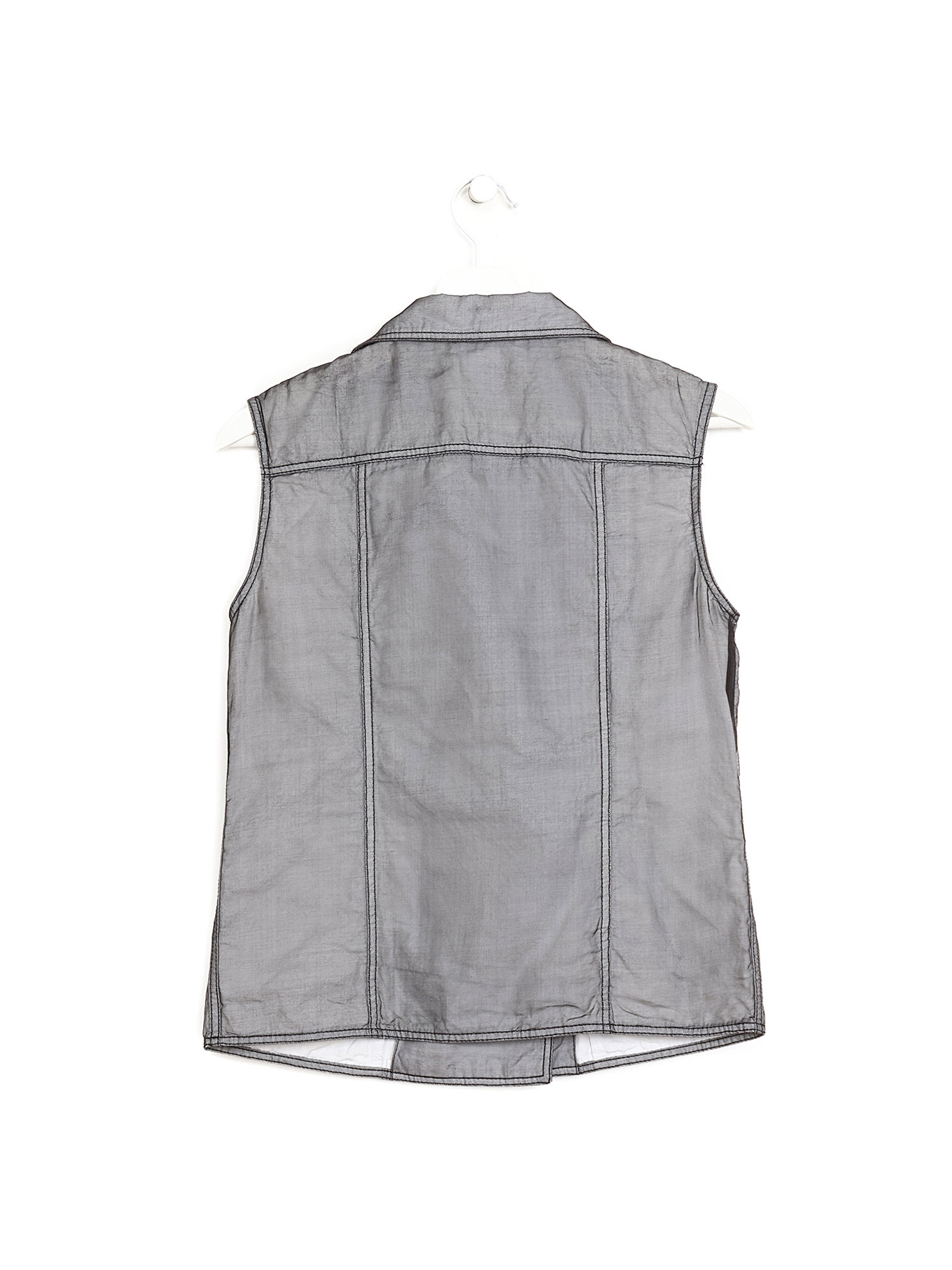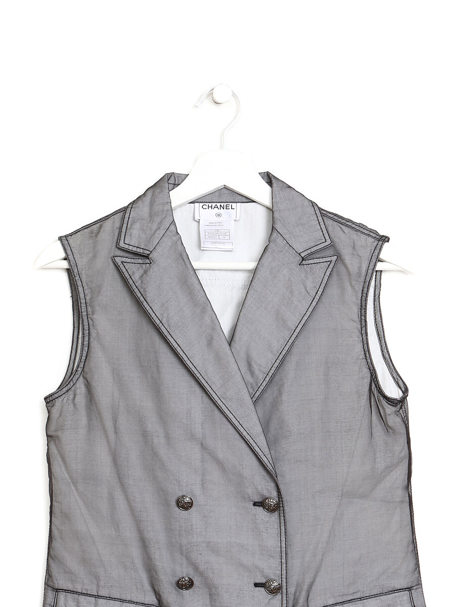 Gilet à double boutonnage en gris avec fermeture devant avec boutons à logo 'CC' emblématiques en métal gris canon de fusil. Revers crantés.