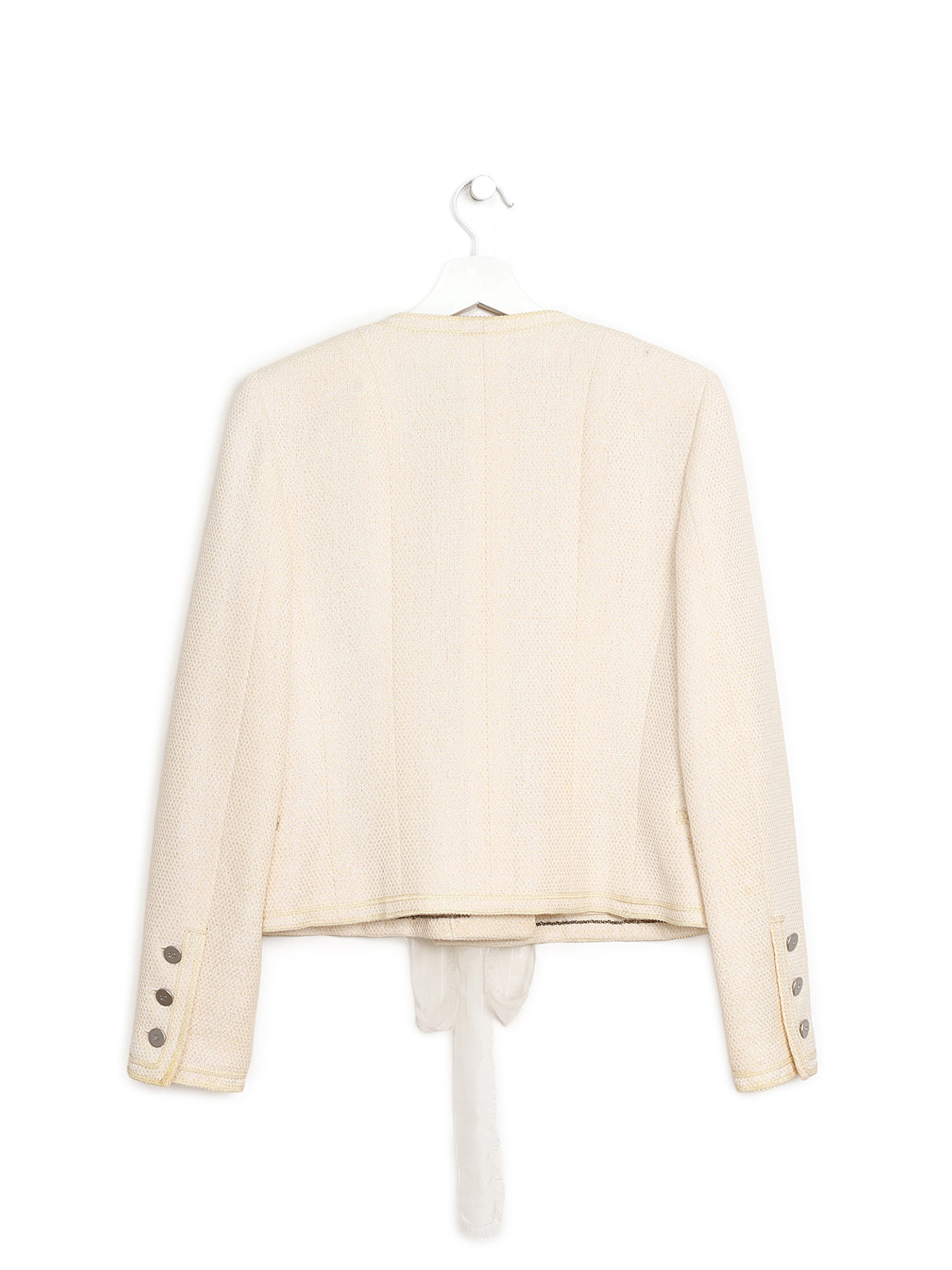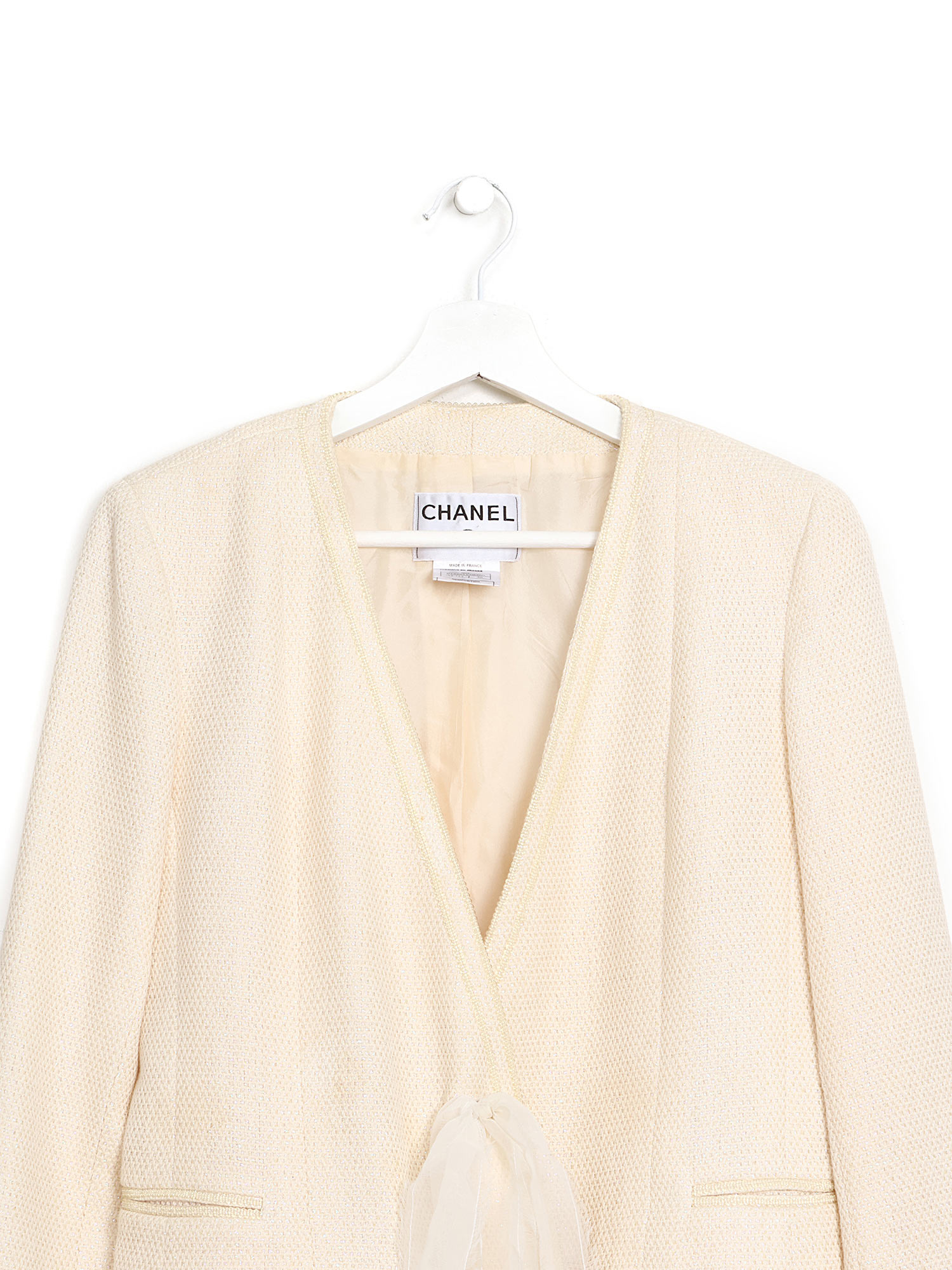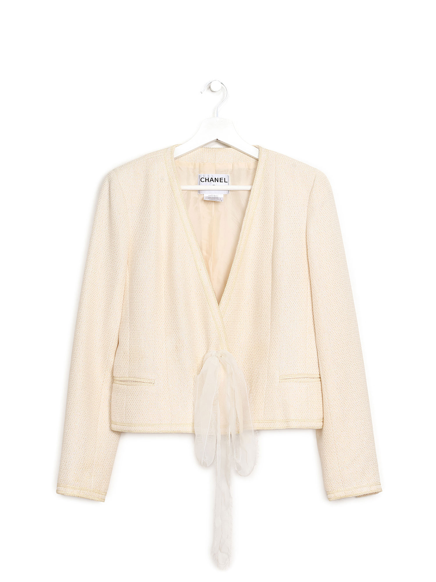 Blazer classique à manches longues en tweed crème avec encolure en V et fermeture par ruban ajouté. Boutons métalliques argentés aux poignets. Deux poches avant.