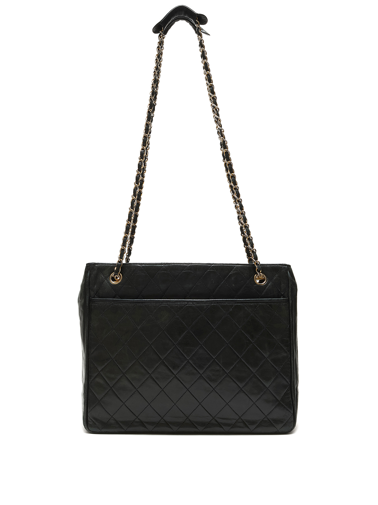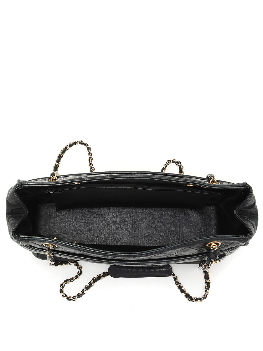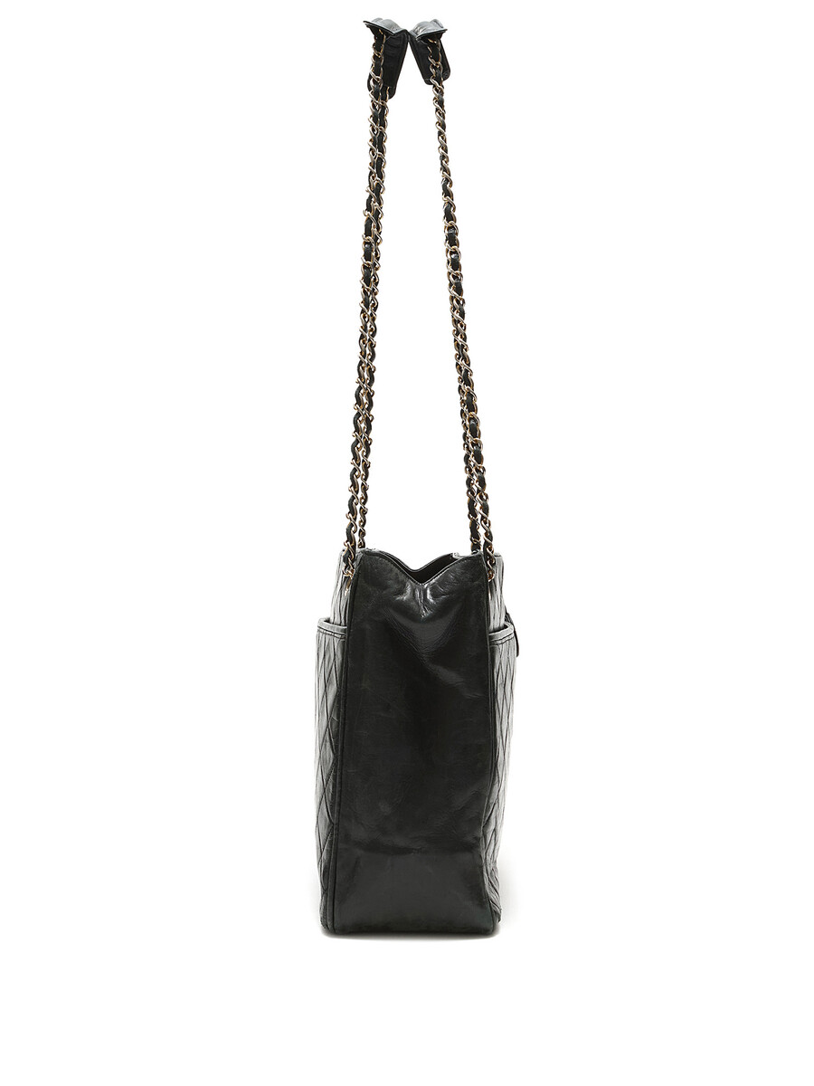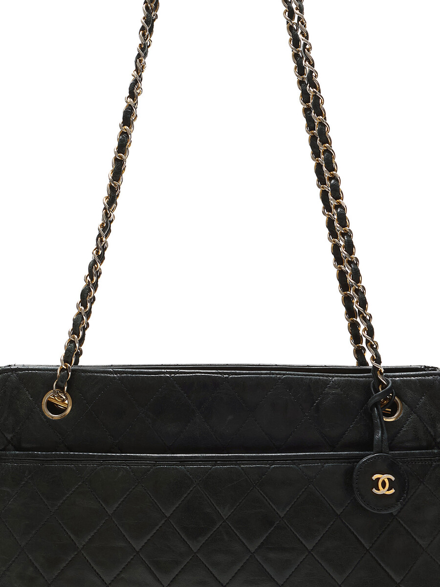 Sac à bandoulière matelassé en cuir noir. Fermeture à tourniquet. Chaîne avec bandoulière en cuir. Quincaillerie dorée.