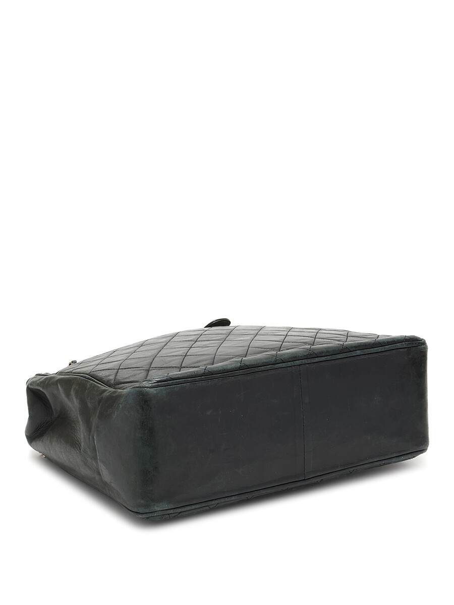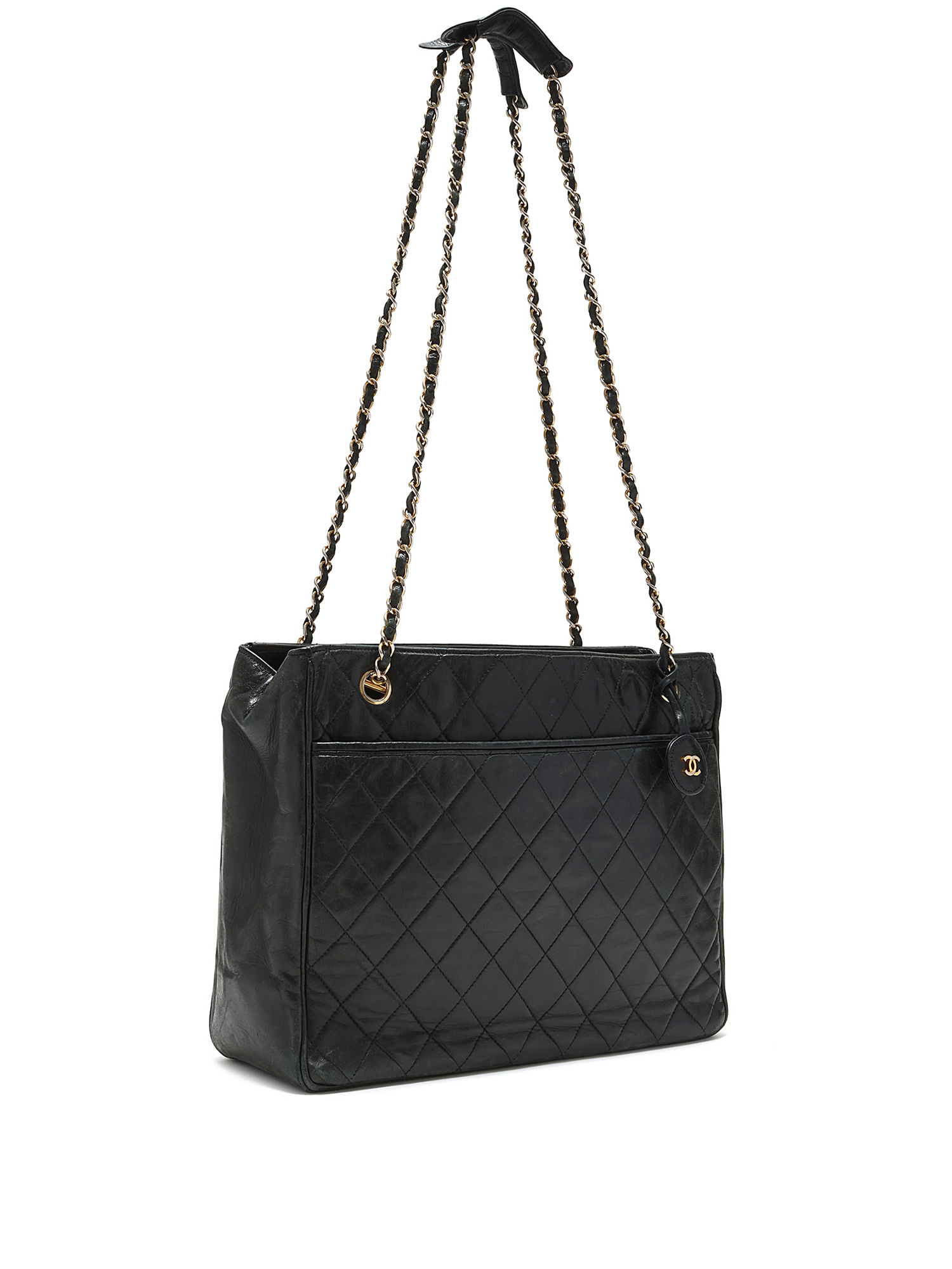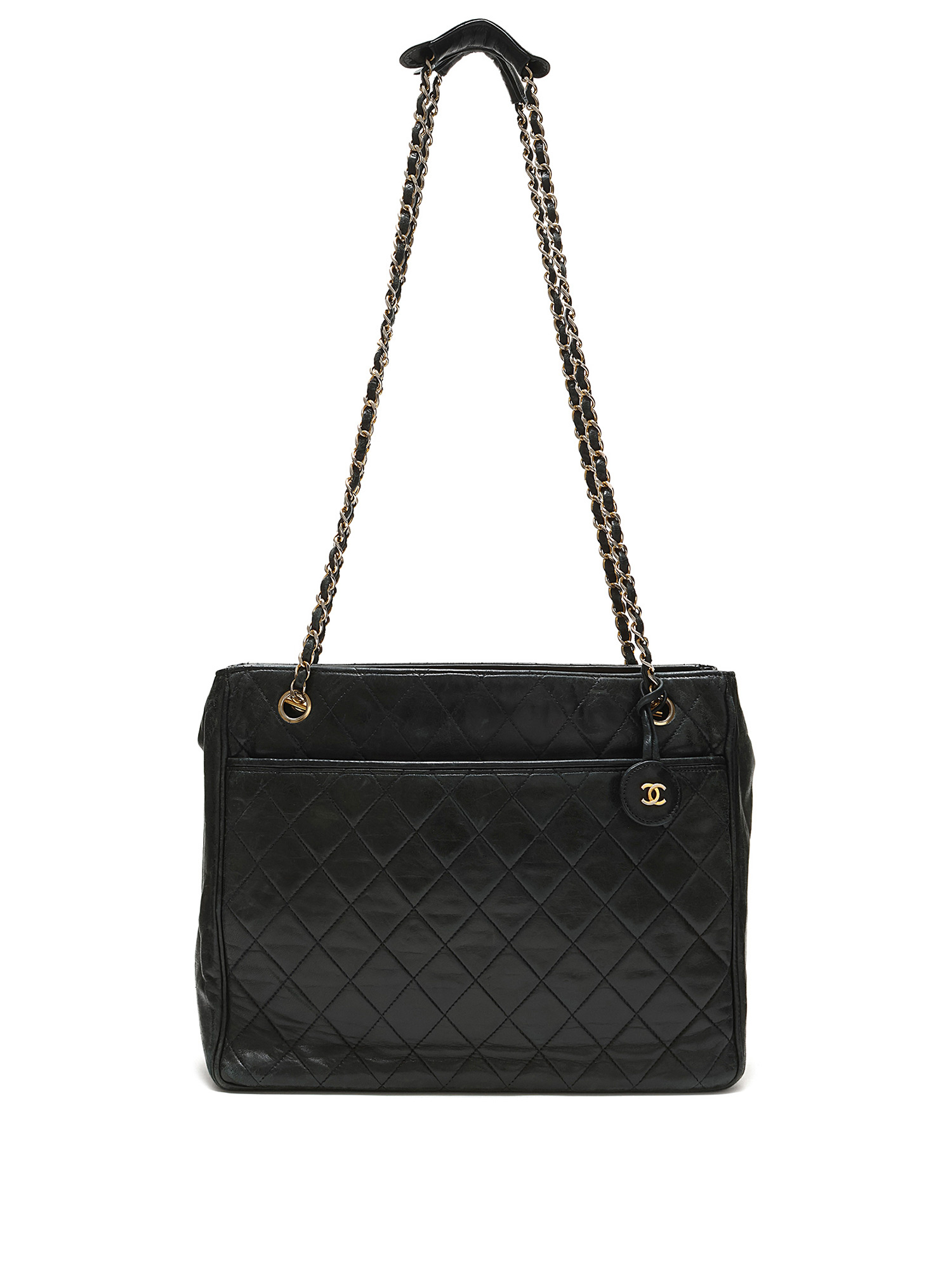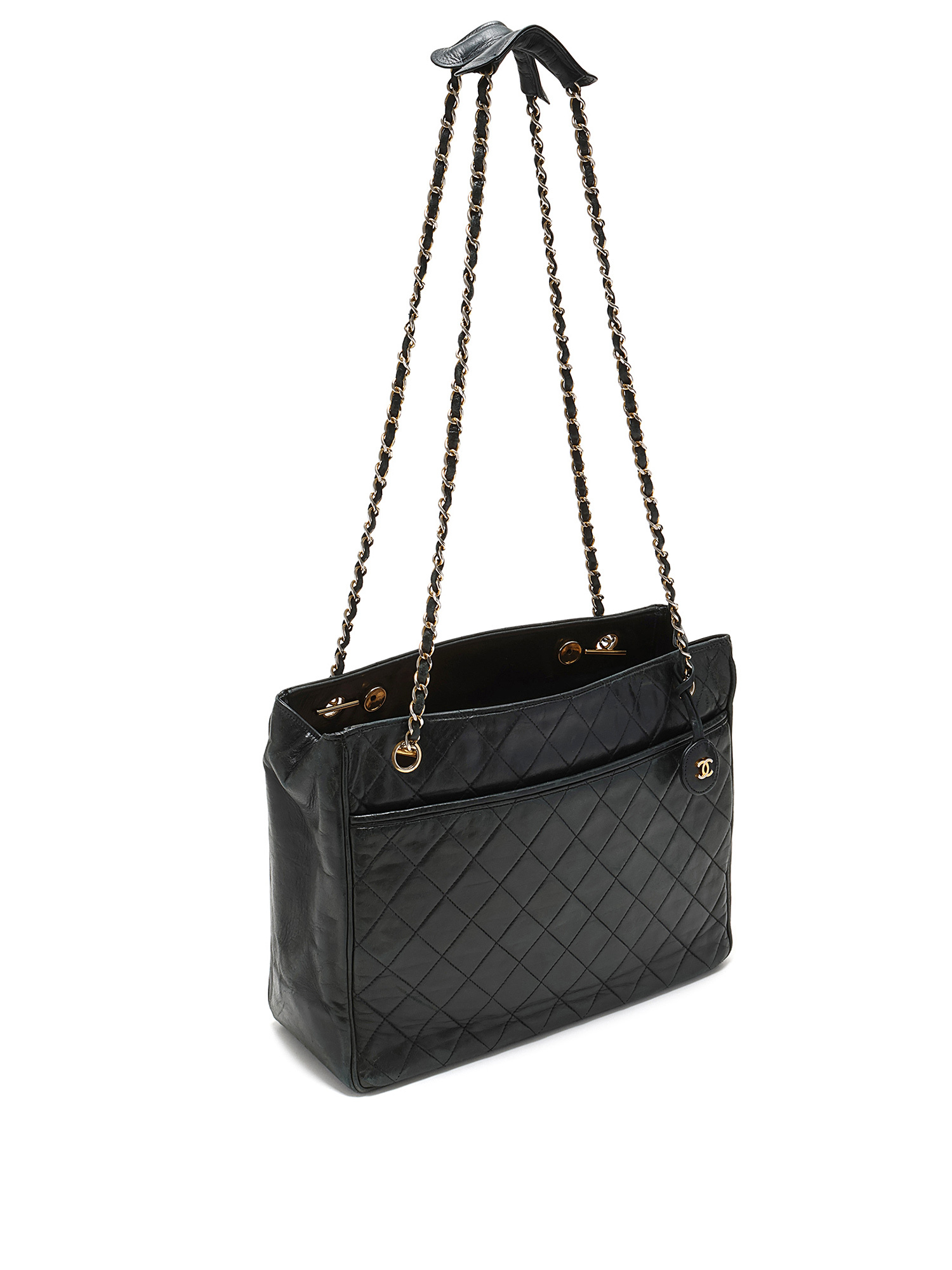 Sac à bandoulière matelassé en cuir noir. Fermeture à tourniquet. Chaîne avec bandoulière en cuir. Quincaillerie dorée.