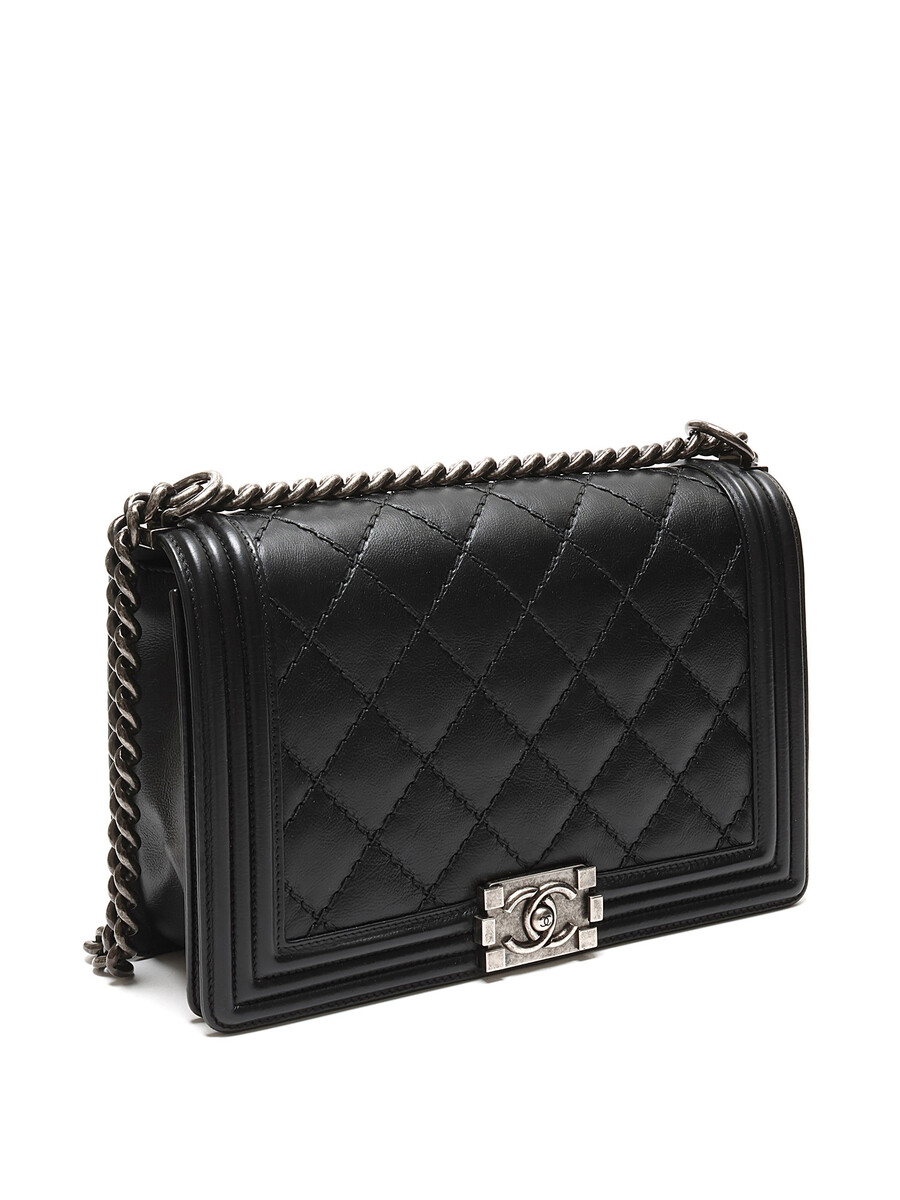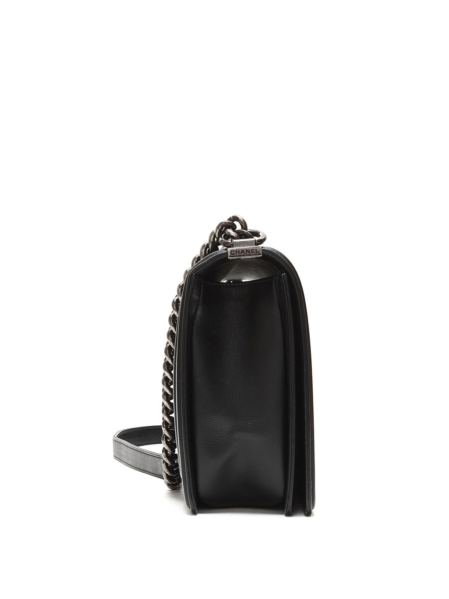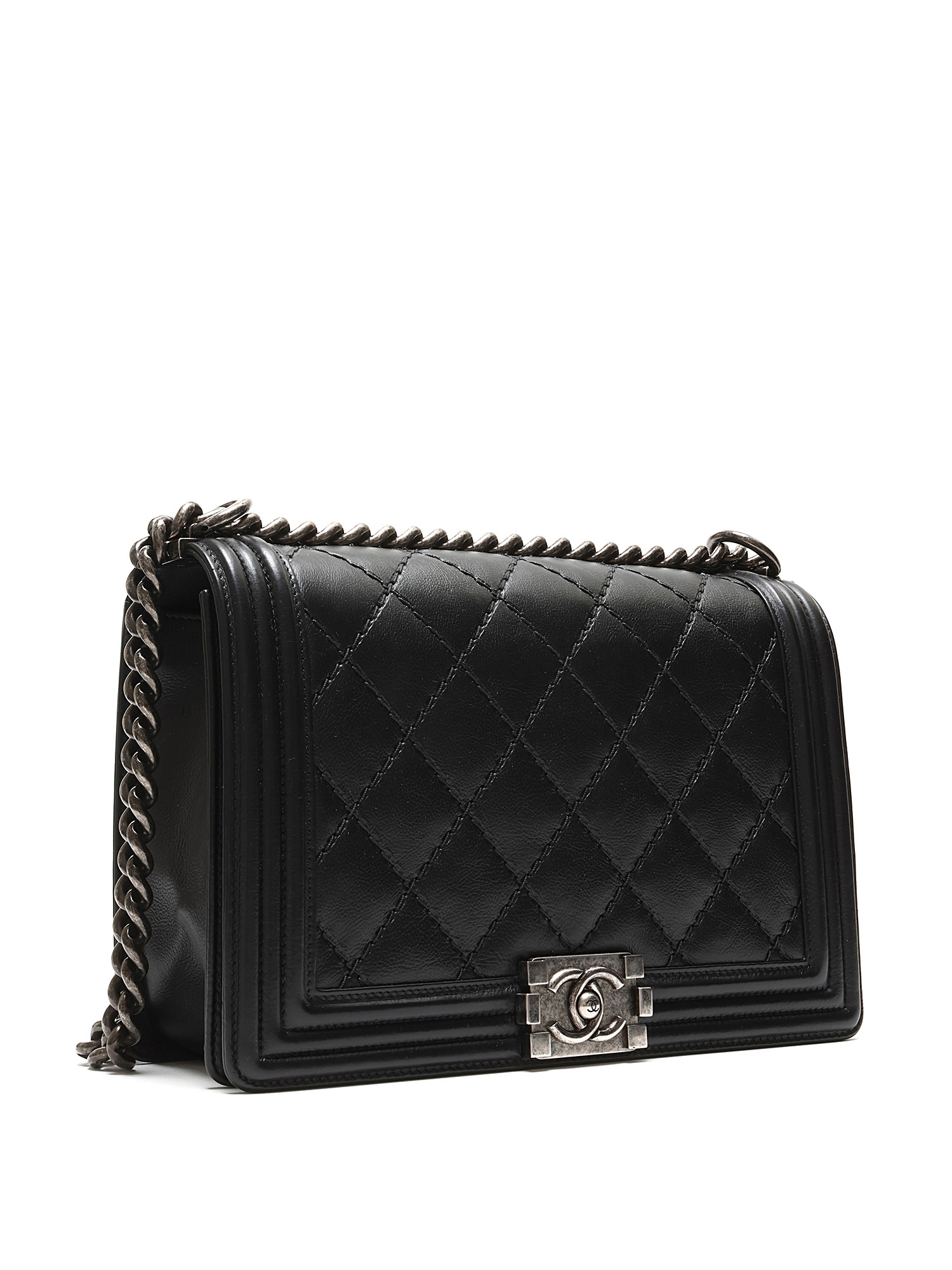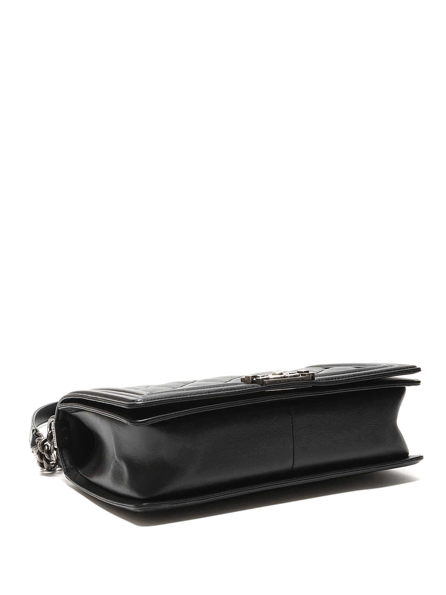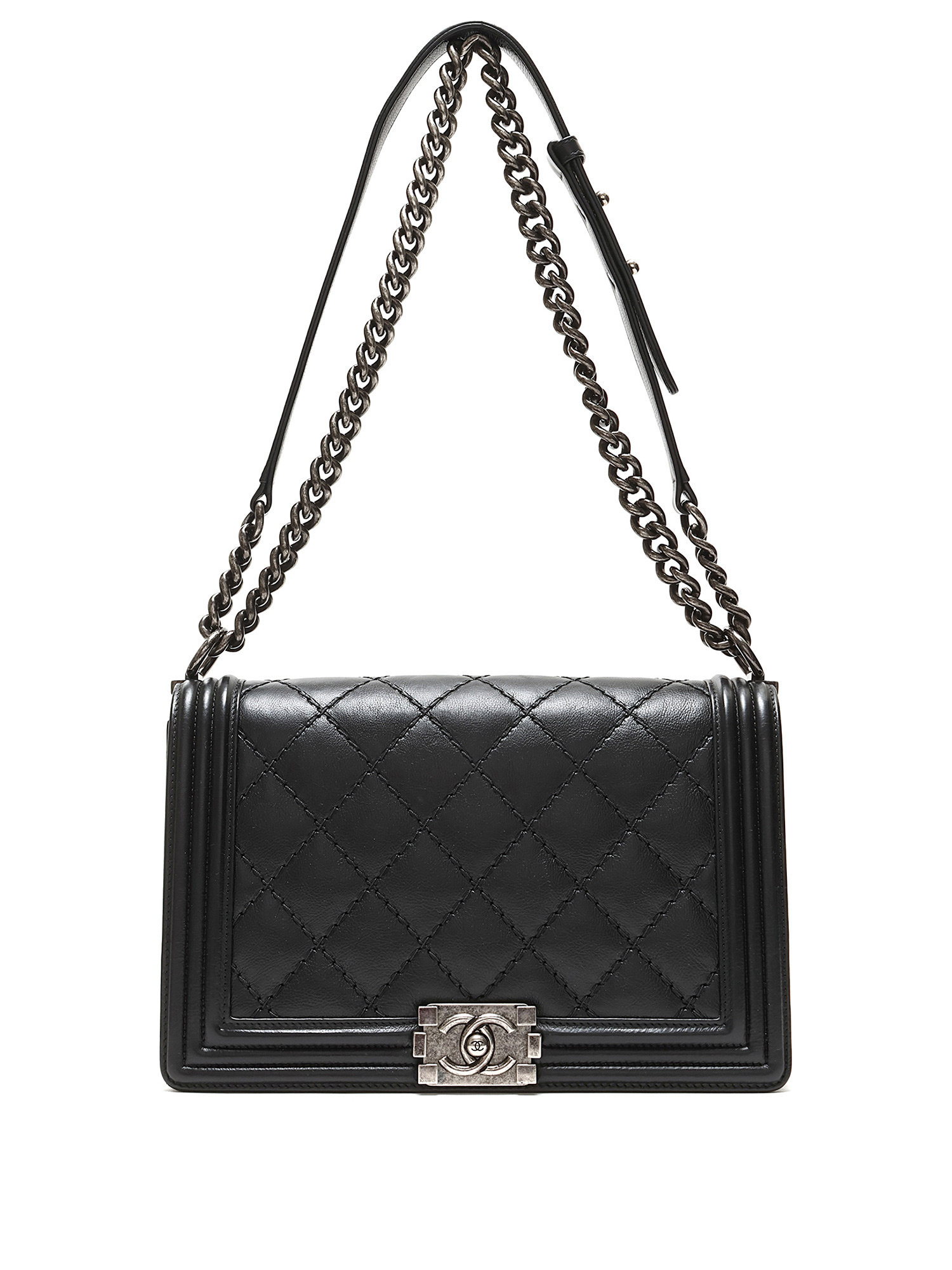Sac à effet matelassé signature en cuir noir avec fermoir 'Boy' emblématique en métal gris acier au rabat. Bandoulière convertible en cuir et chaîne gourmette.