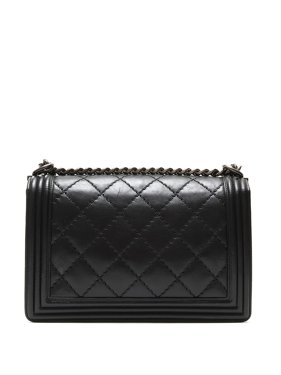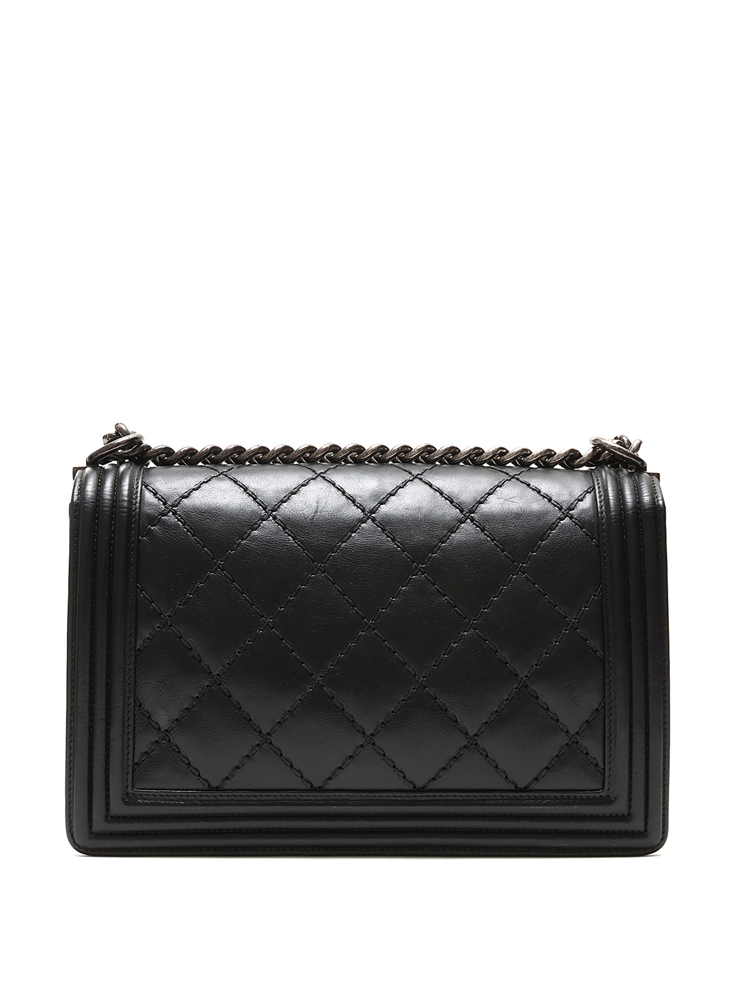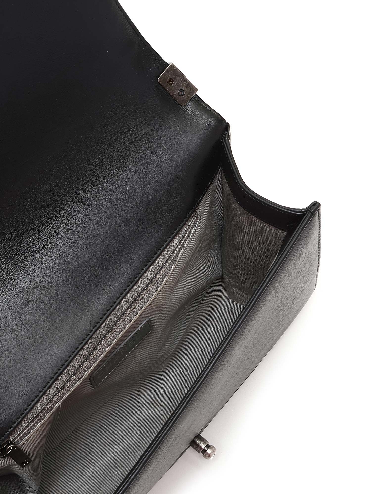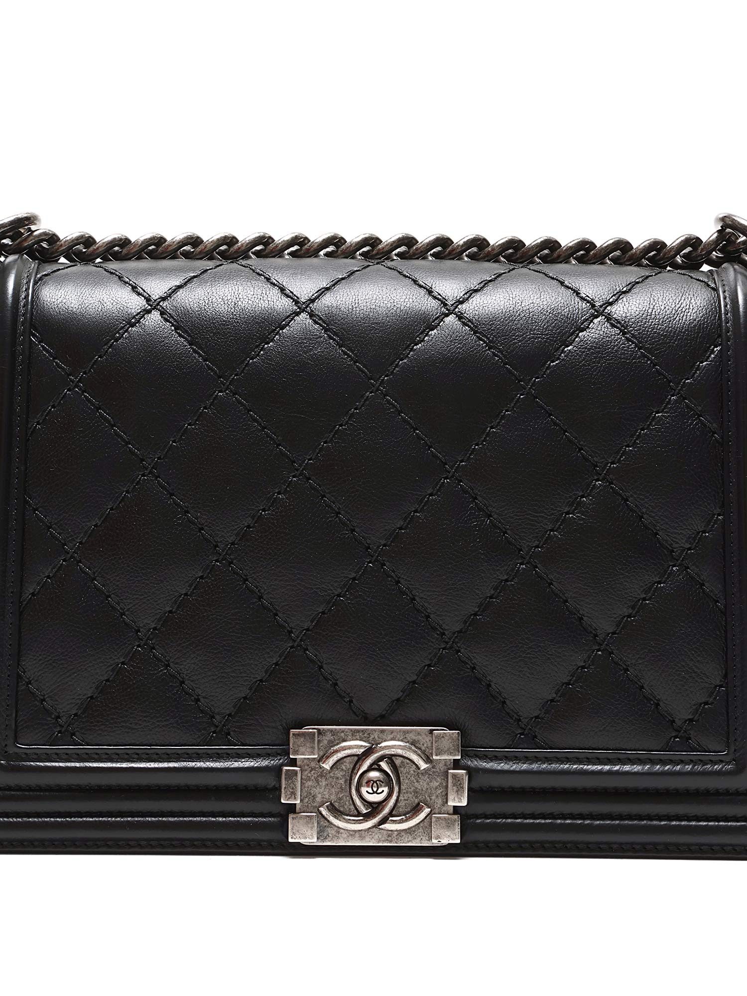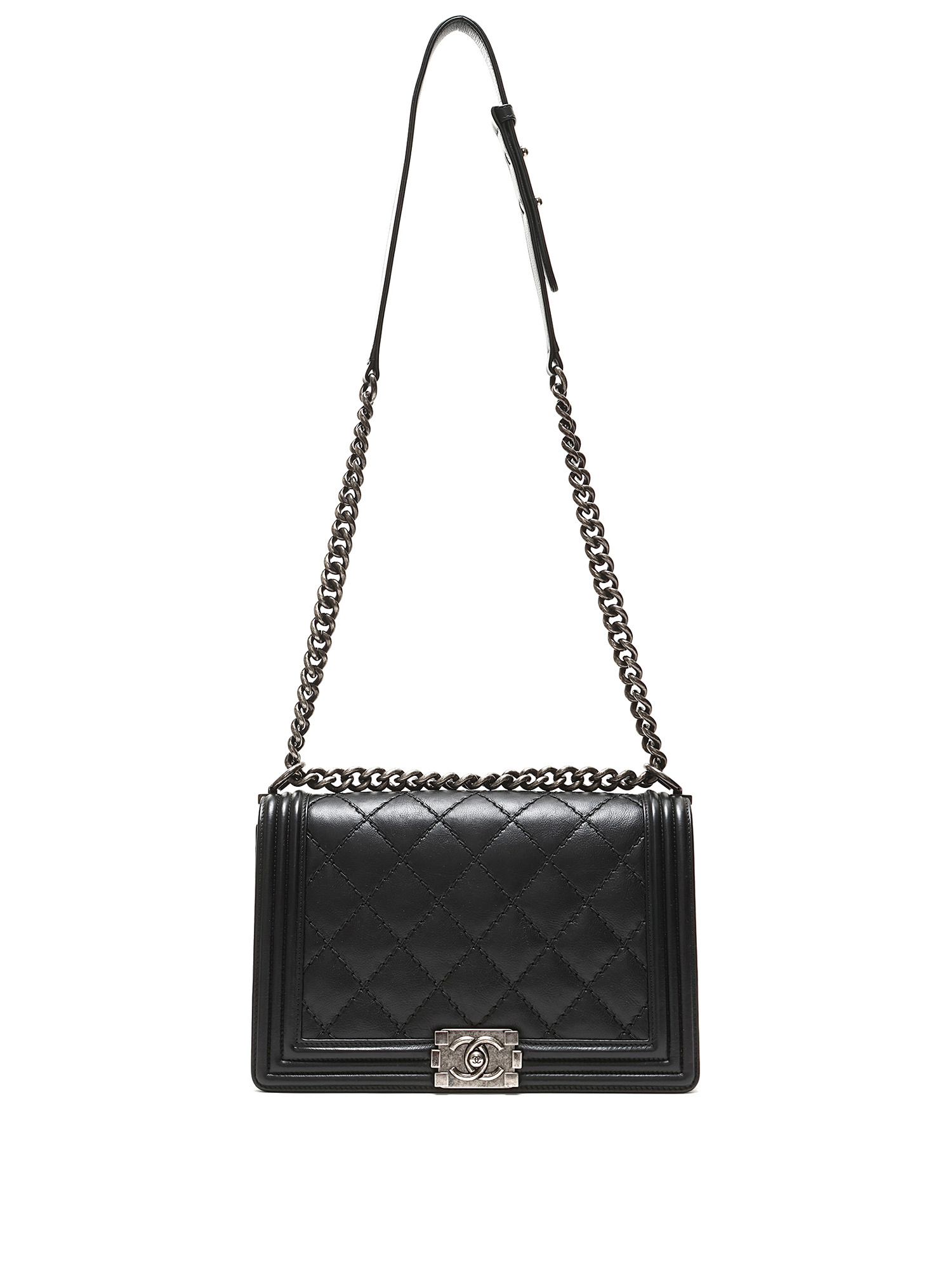 Sac à effet matelassé signature en cuir noir avec fermoir 'Boy' emblématique en métal gris acier au rabat. Bandoulière convertible en cuir et chaîne gourmette.