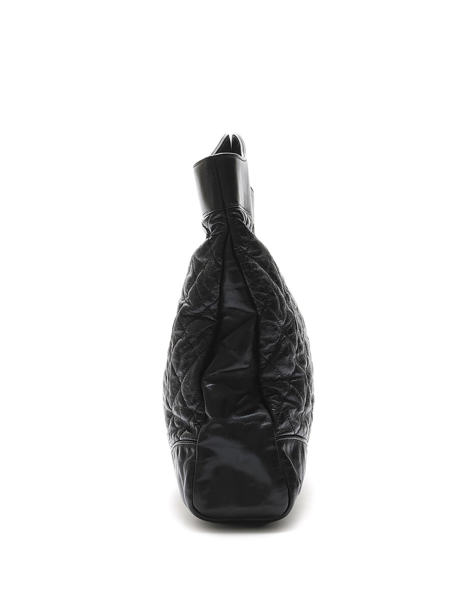 Sac fourreau en cuir matelassé noir. Fermoir à tourner. Anses intégrées. Ferrures en métal doré. Sangle à l'épaule en cuir et chaîne.