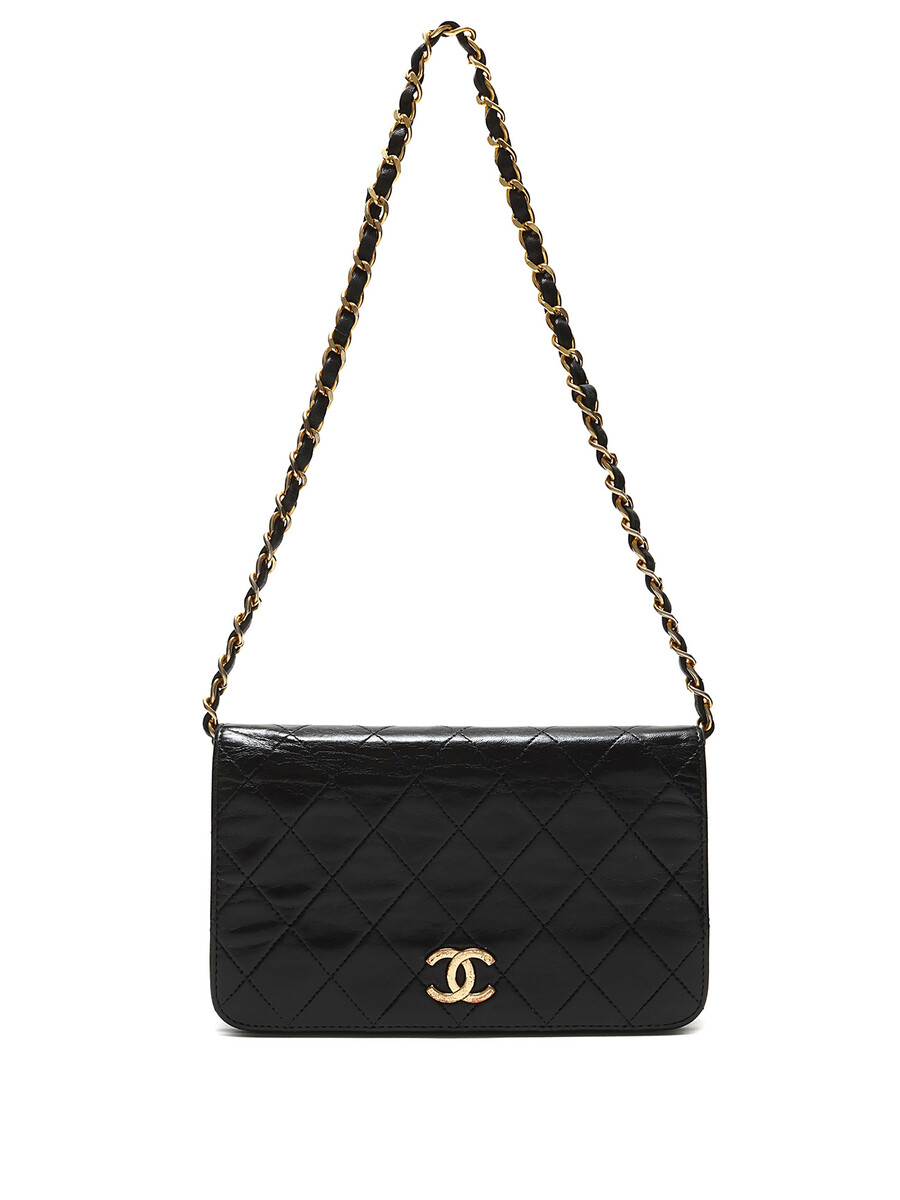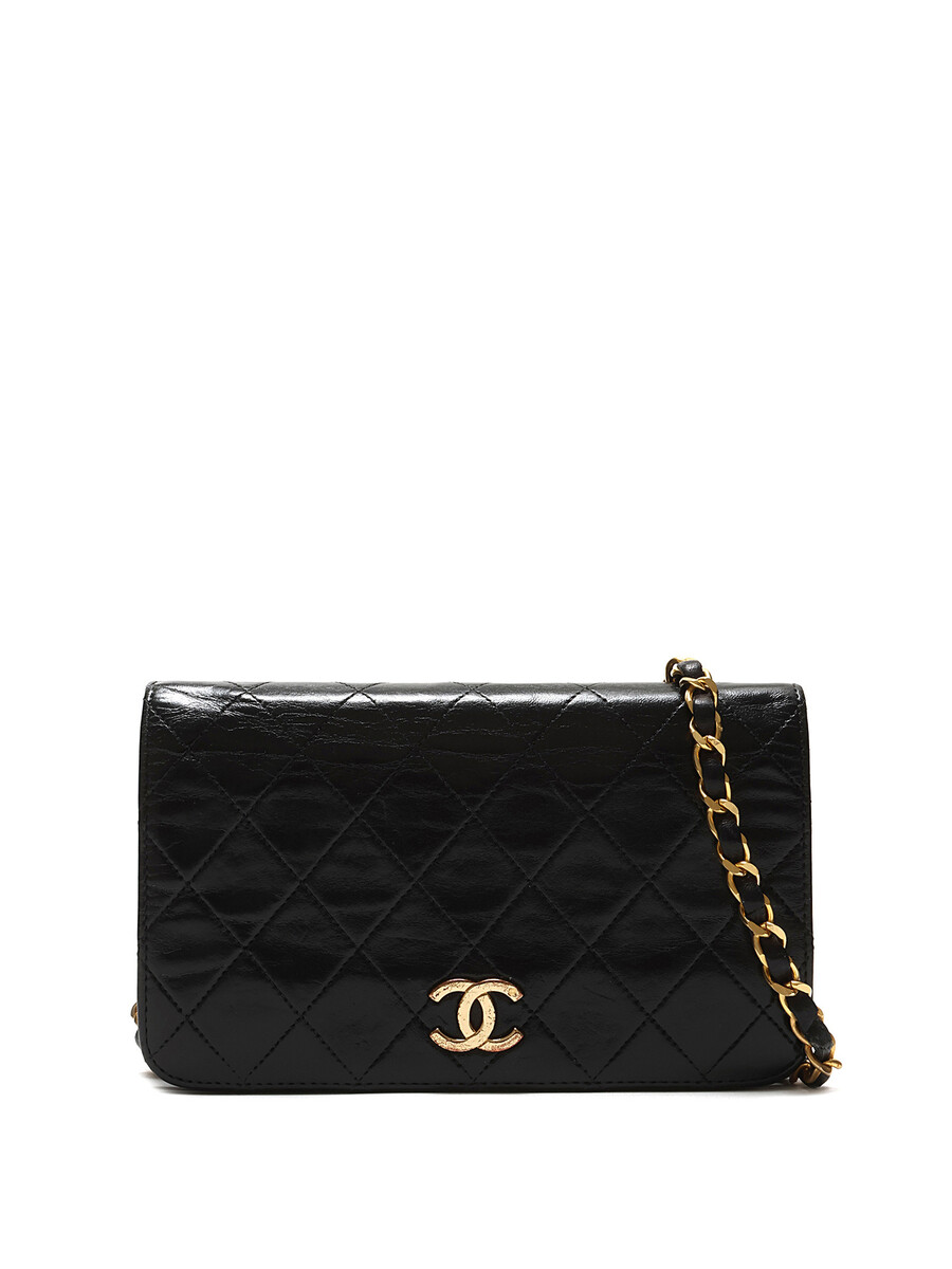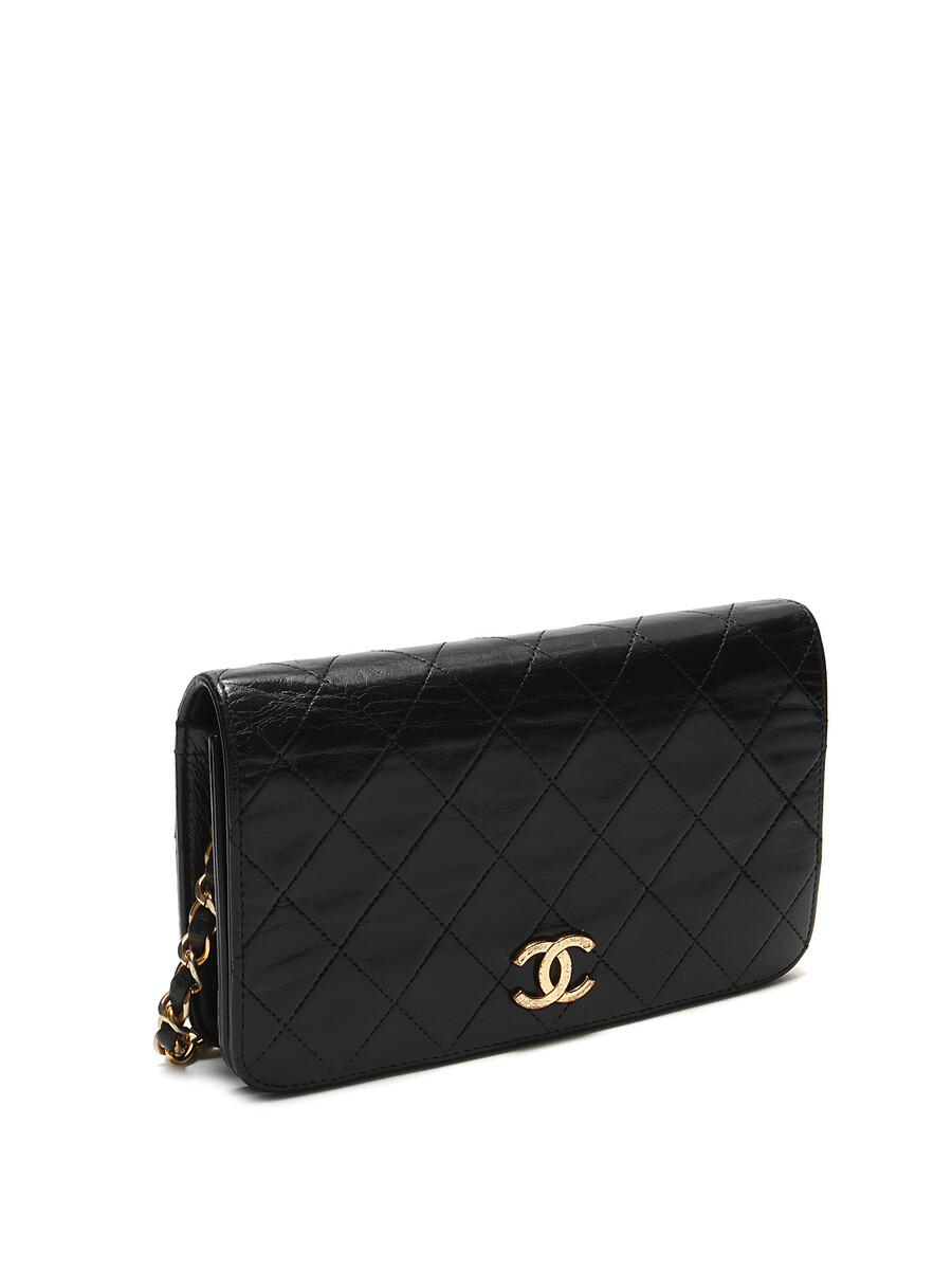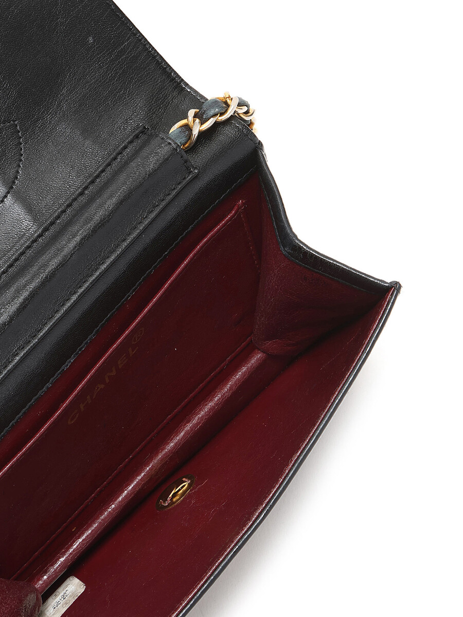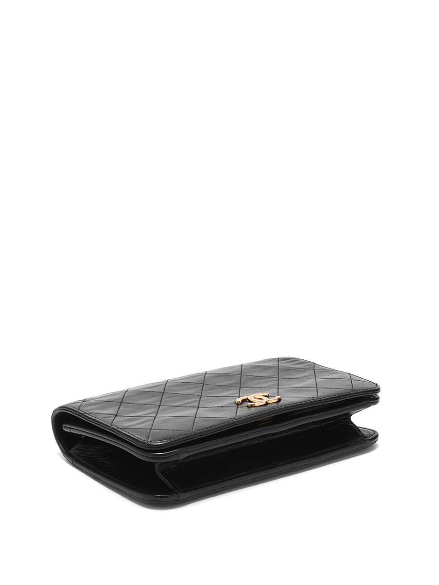 Portefeuille en cuir d'agneau matelassé noir avec chaîne à bandoulière entrelacée en cuir et métal doré. Quincaillerie dorée.