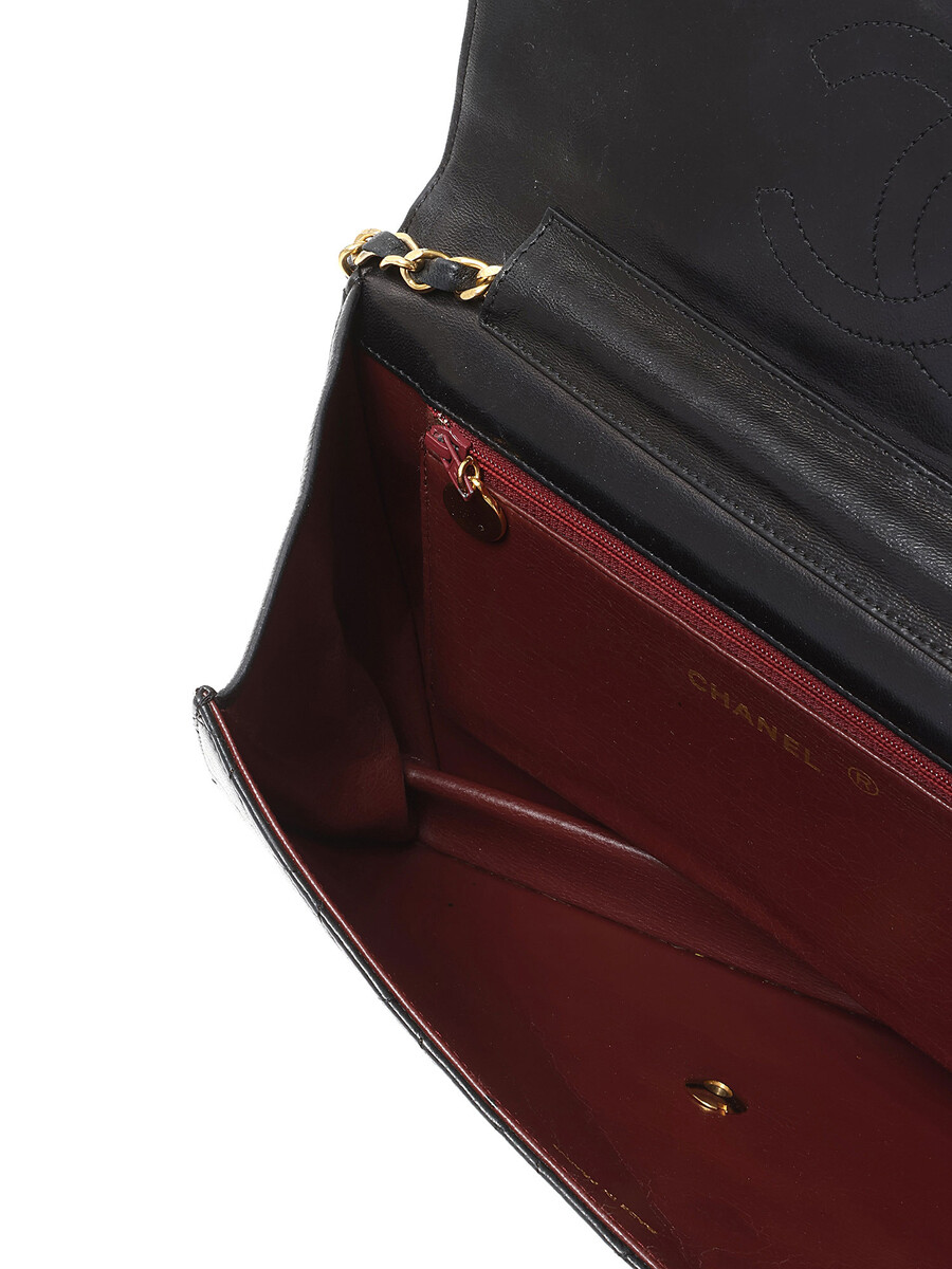 Sac à main en cuir noir à matelassage en losange avec logo CC emblématique. Fermeture à bouton tournant CC. Bandoulière en cuir et chaîne entrelacés. Quincaillerie dorée.