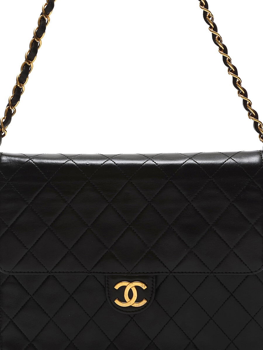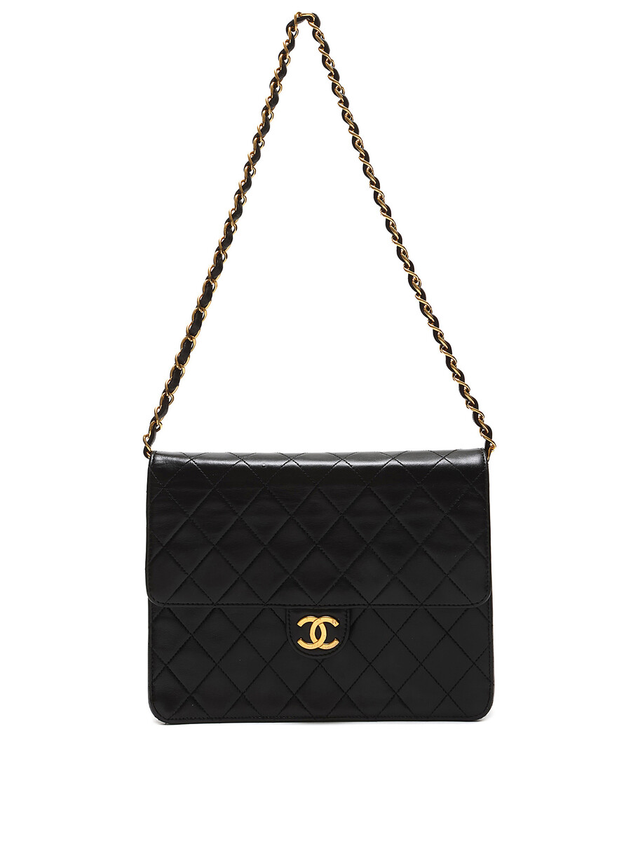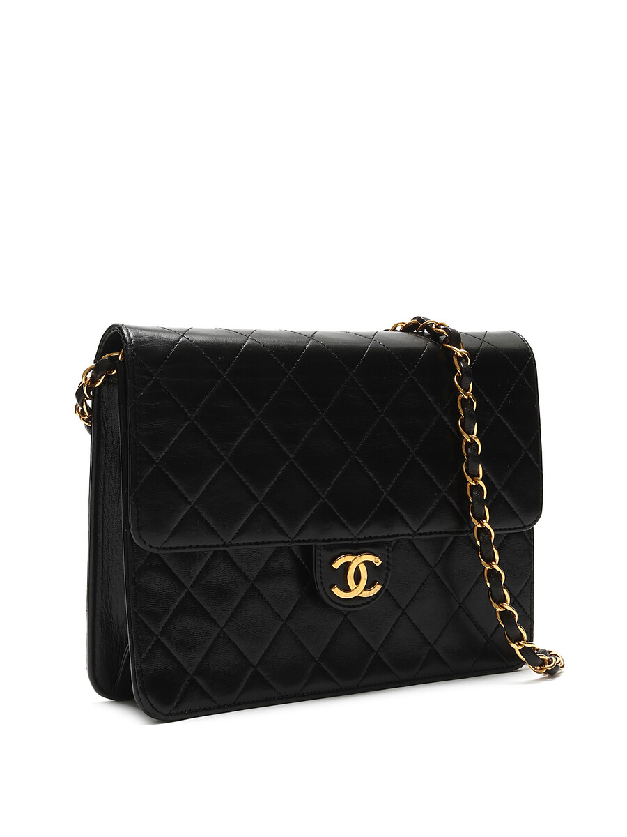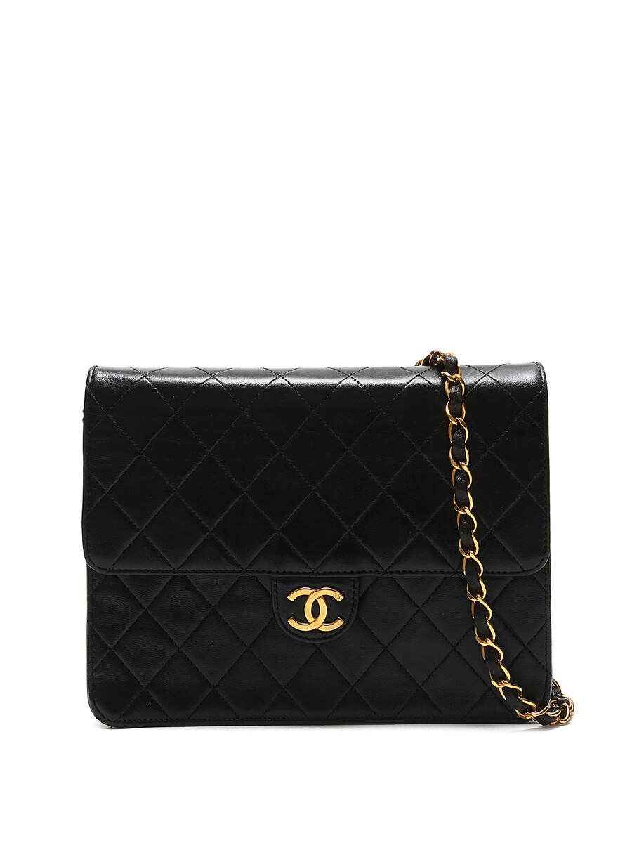 Sac à l’épaule à rabat en cuir d’agneau matelassé noir. Bandoulière en cuir et chaîne entrelacés. Plaque à logo CC au rabat. Fermeture à rabat avec poussoir. Ferrures en métal doré.